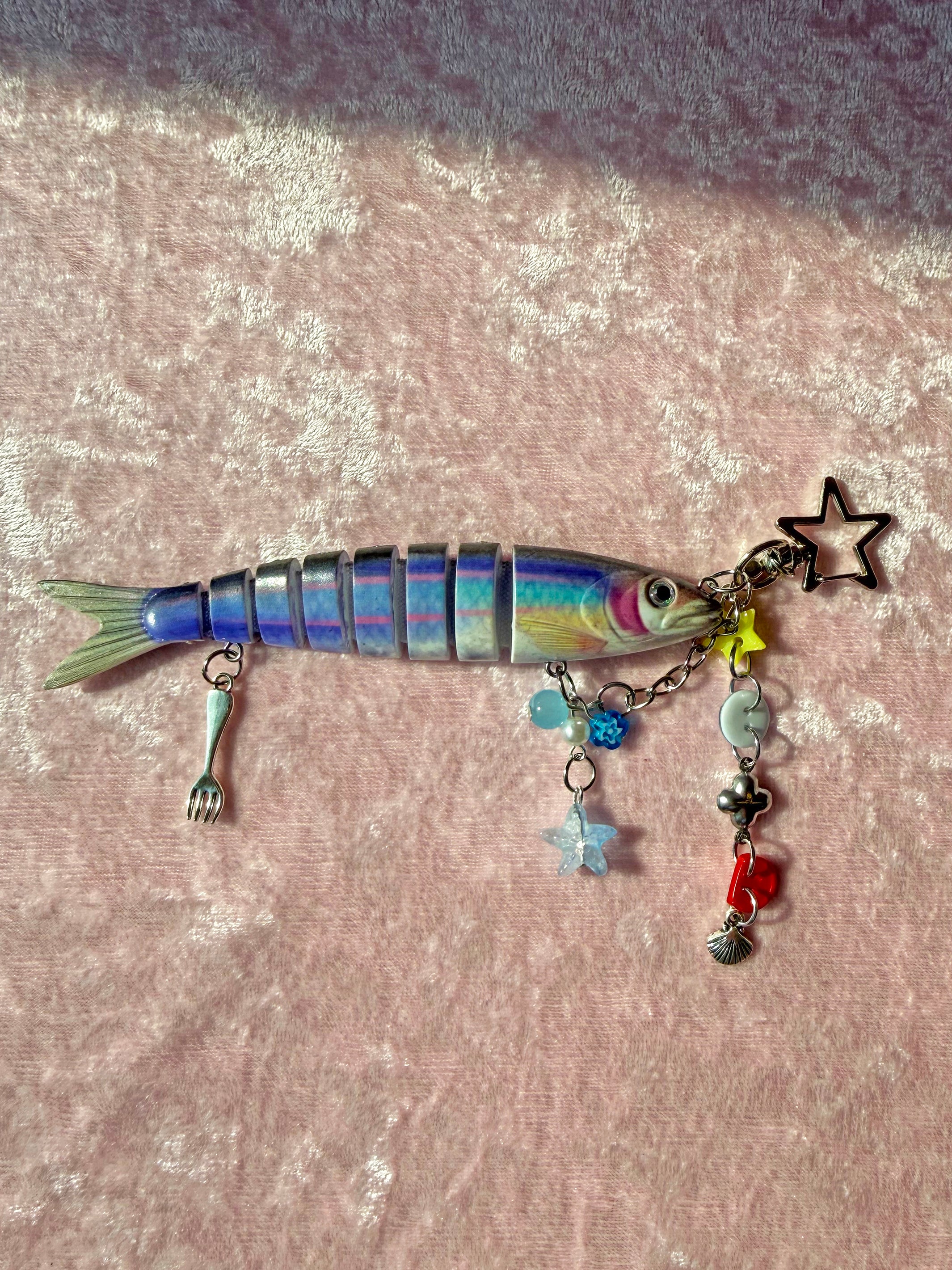 This adorable fish keychain features 1 cute blue segmented fish surrounded by lots of cute charms! She's got buttons, shells, stars, beads, and even a fork! Each keychain will have a unique combo of charms. Comes on a silver star shaped carabiner that makes attaching it to any bag/keychain a breeze!