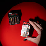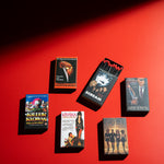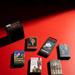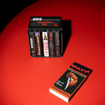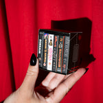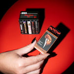 6 unique matchbooks designed to look like classic horror VHS tapes. Each matchbook sits inside a decorative box that looks like a retro TV! Designs include Halloween, Elvira: Mistress of the Dark, Scream, Killer Klowns from Outer Space, The Craft, and American Psycho.