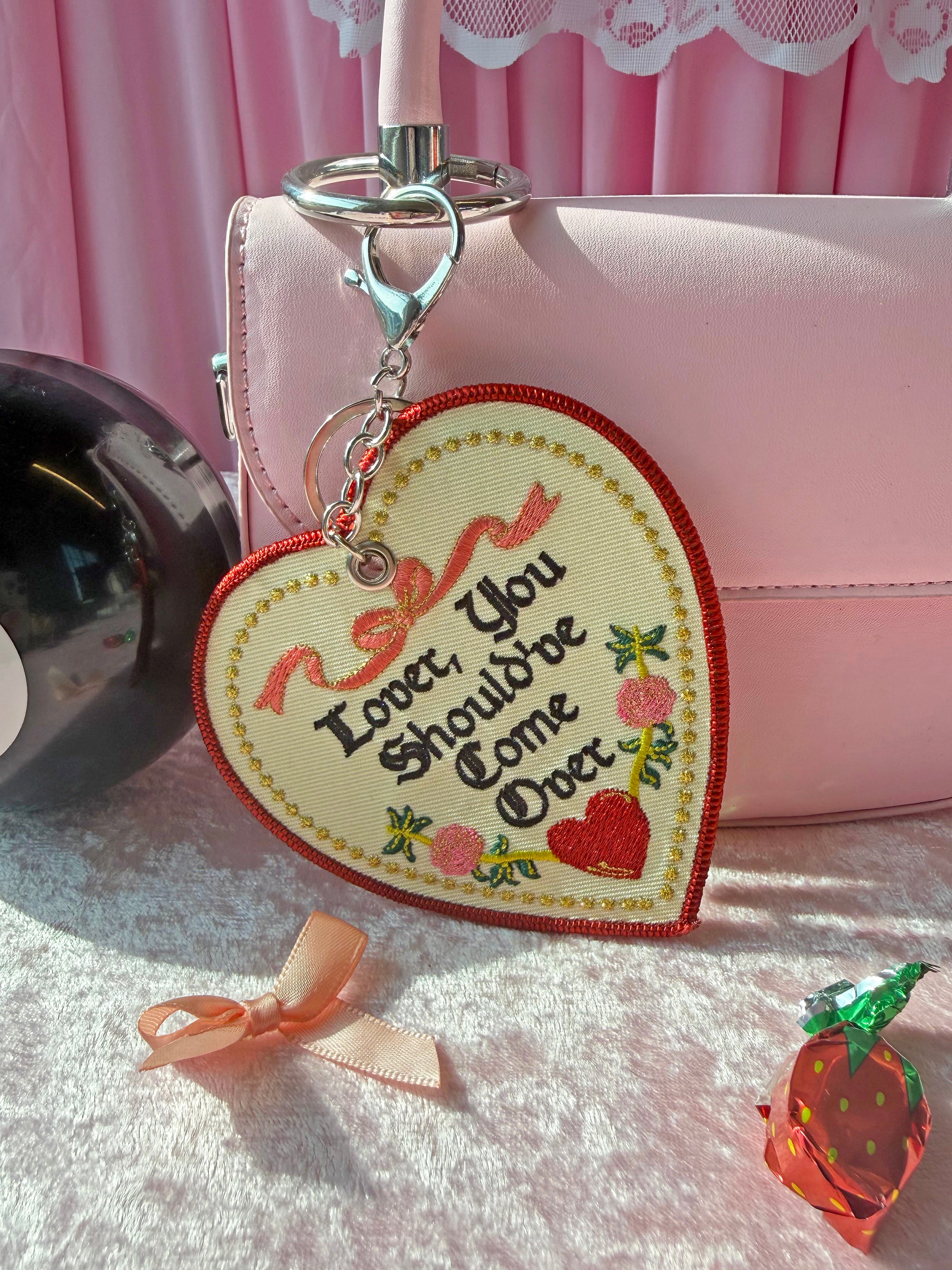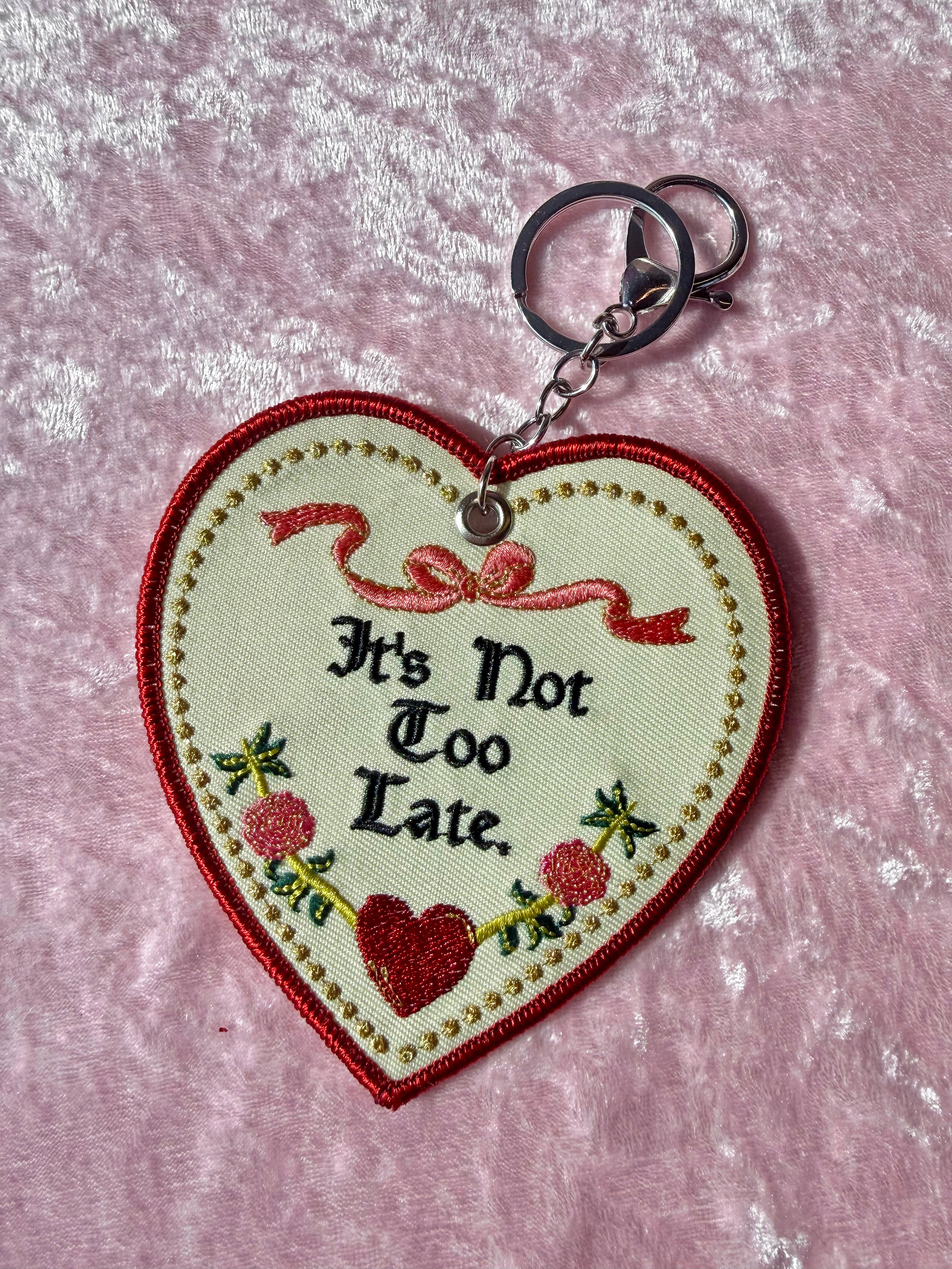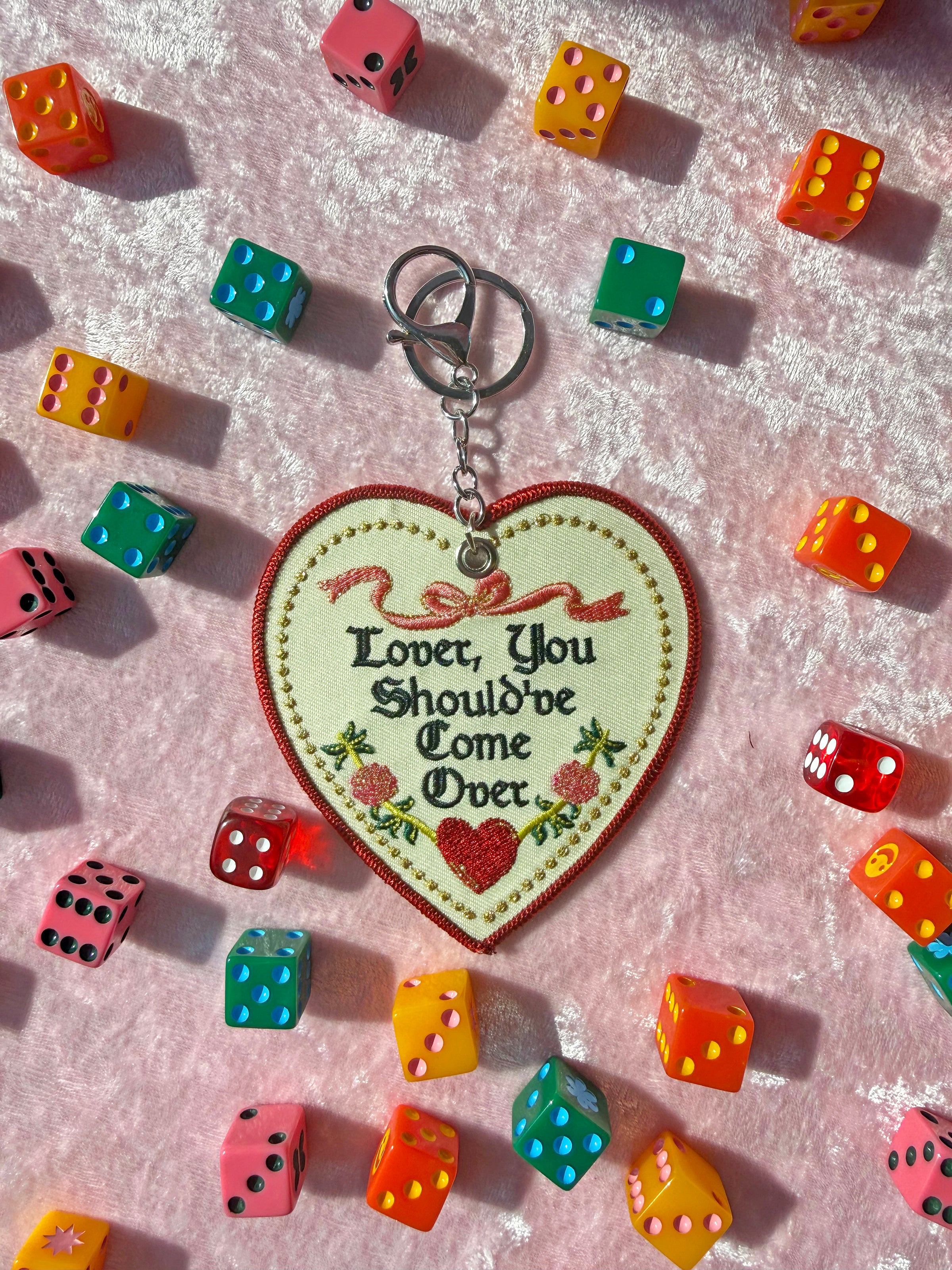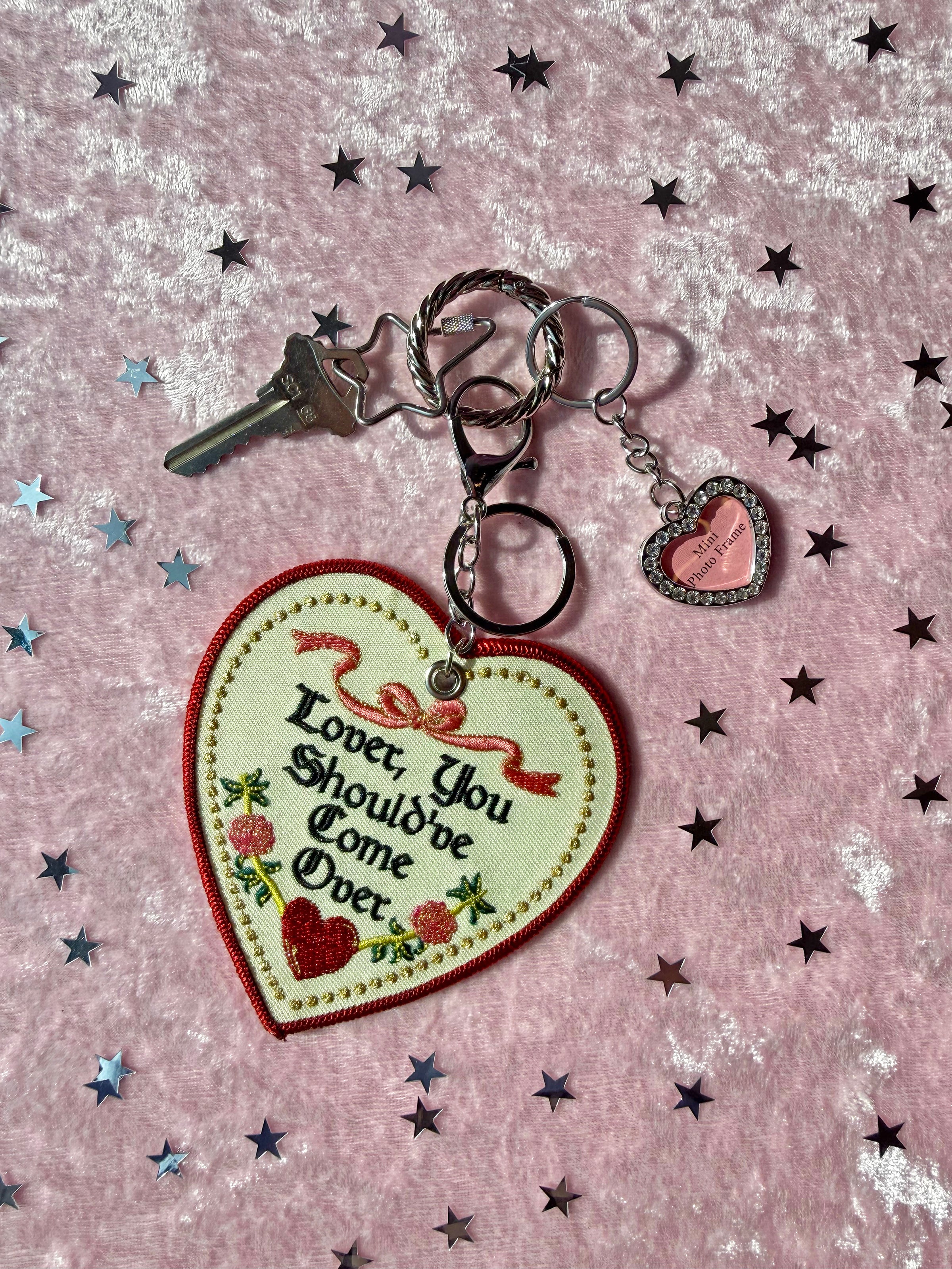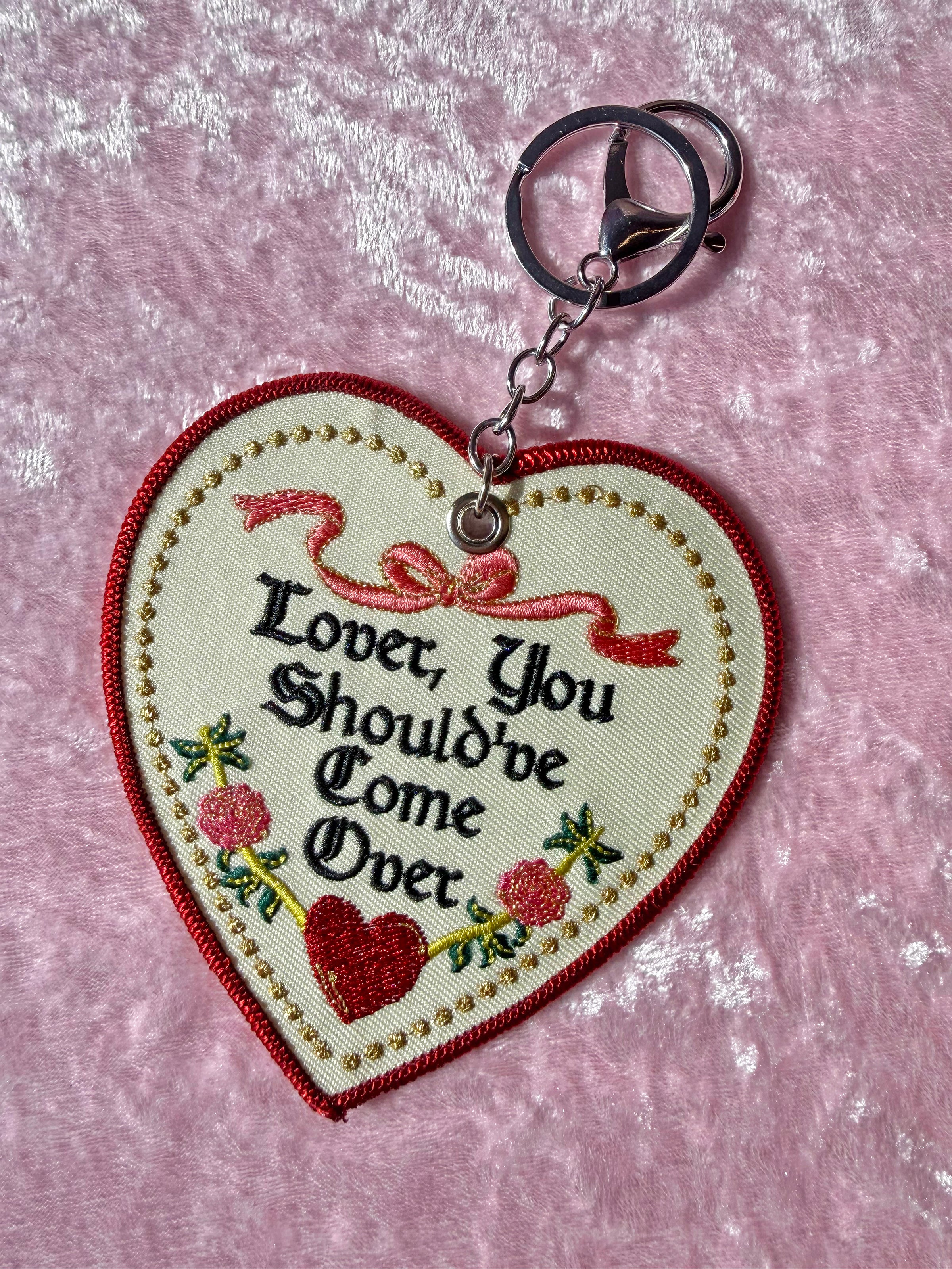 This embroidered heart shaped keychain is the perfect addition to your keychain or bag! The keychain is double sided and features the iconic Jeff Buckley lyrics "Lover, you should've come over" on one side and "It's not too late" on the other! Comes with a jump ring and a silver stay-closed lobster clasp that's easy to use without ruining your manicure!