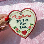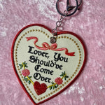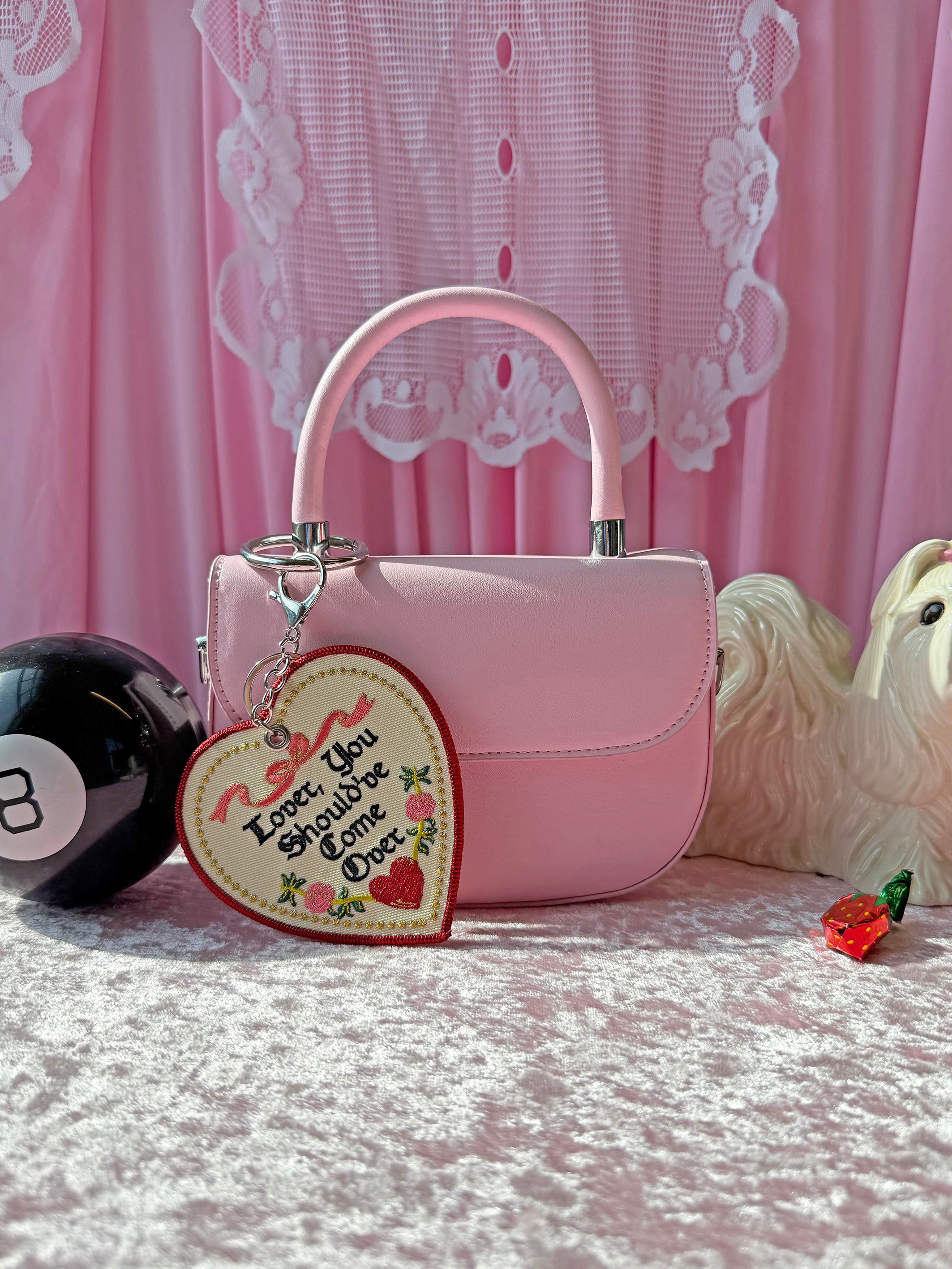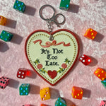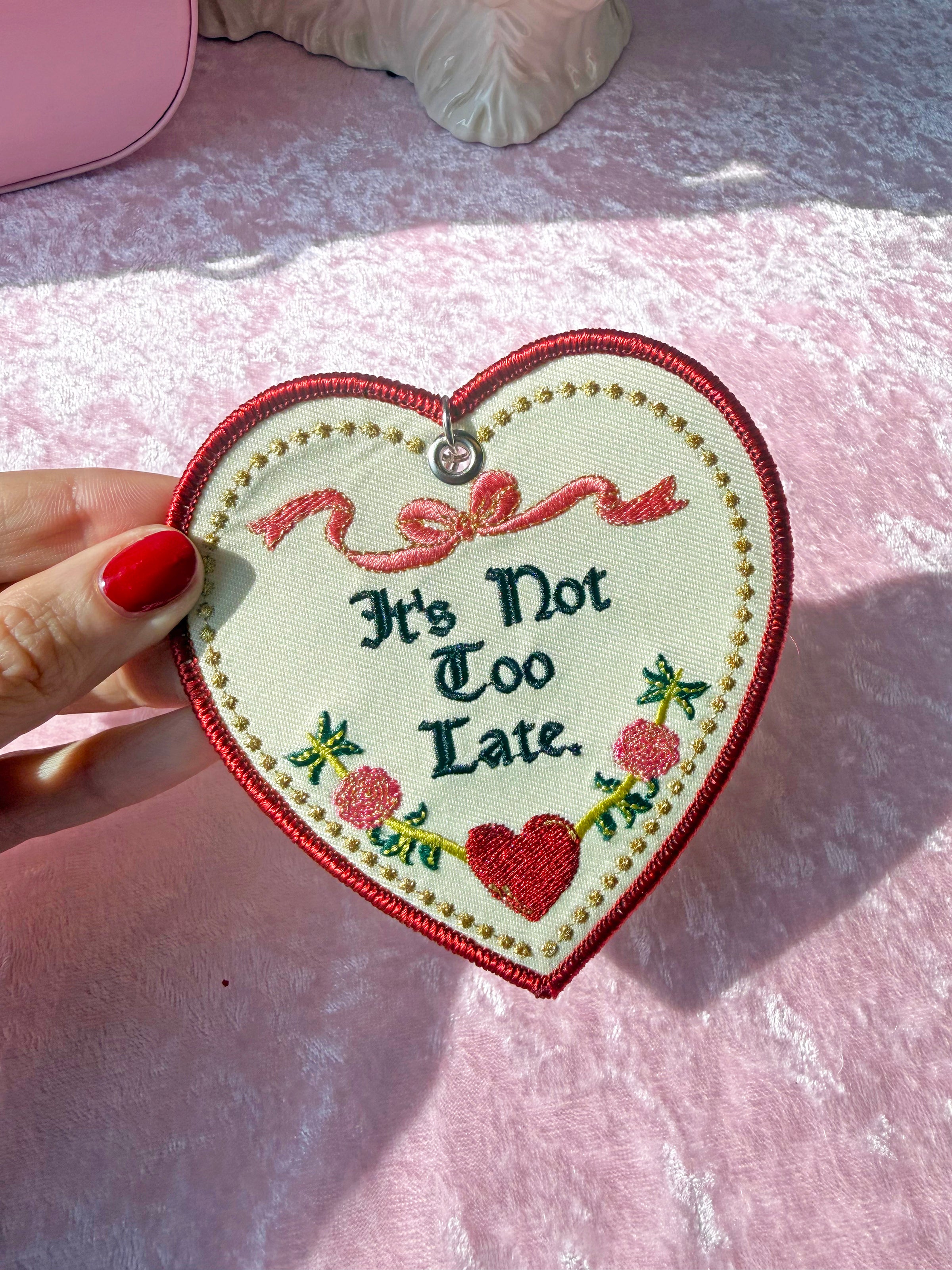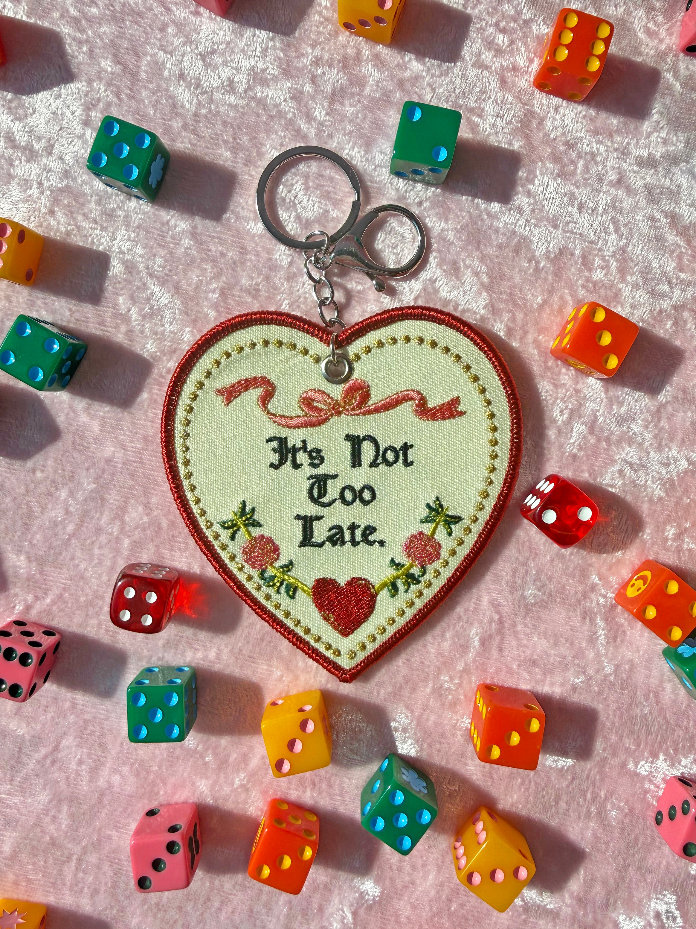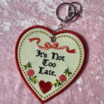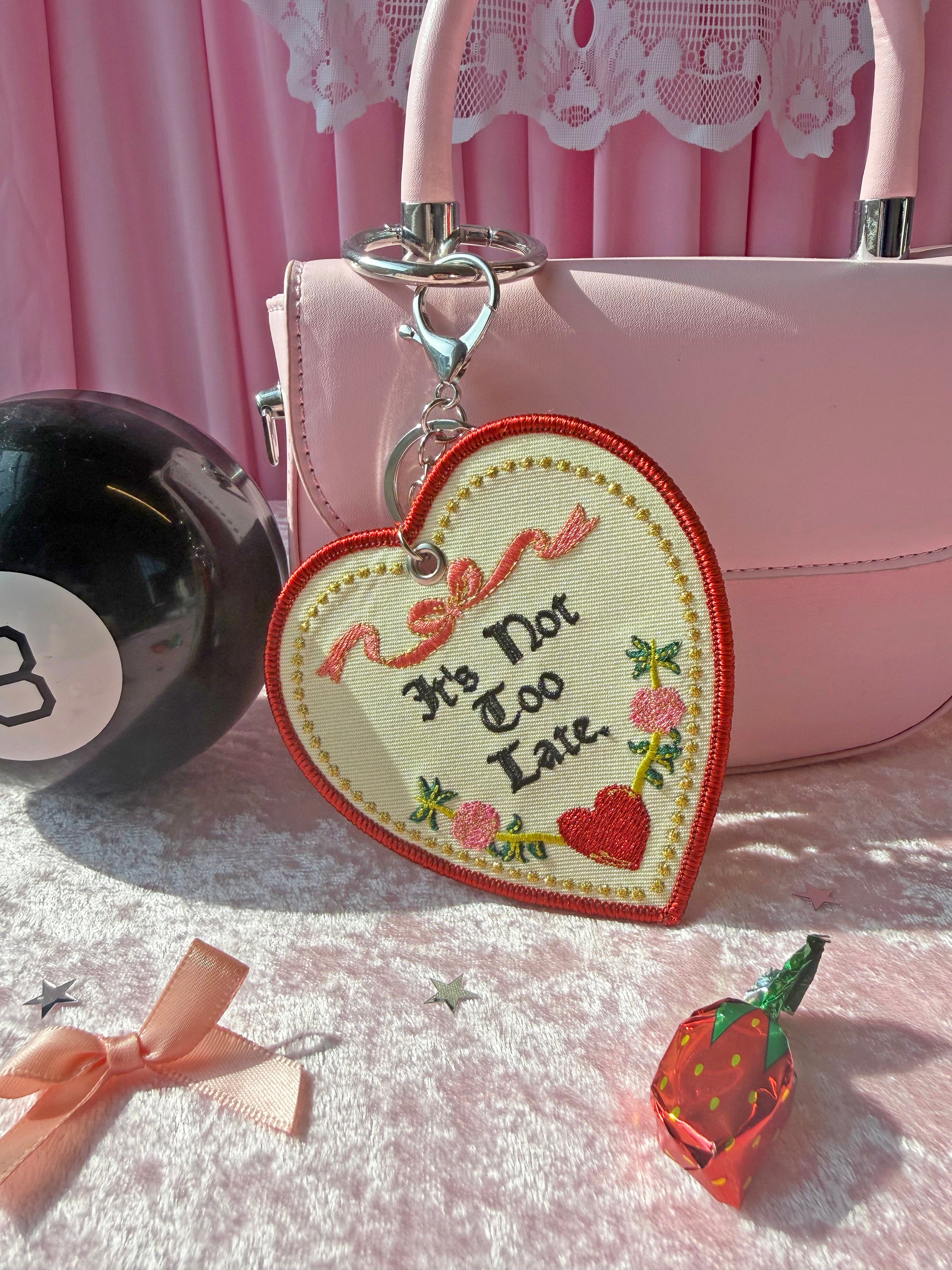 This embroidered heart shaped keychain is the perfect addition to your keychain or bag! The keychain is double sided and features the iconic Jeff Buckley lyrics "Lover, you should've come over" on one side and "It's not too late" on the other! Comes with a jump ring and a silver stay-closed lobster clasp that's easy to use without ruining your manicure!