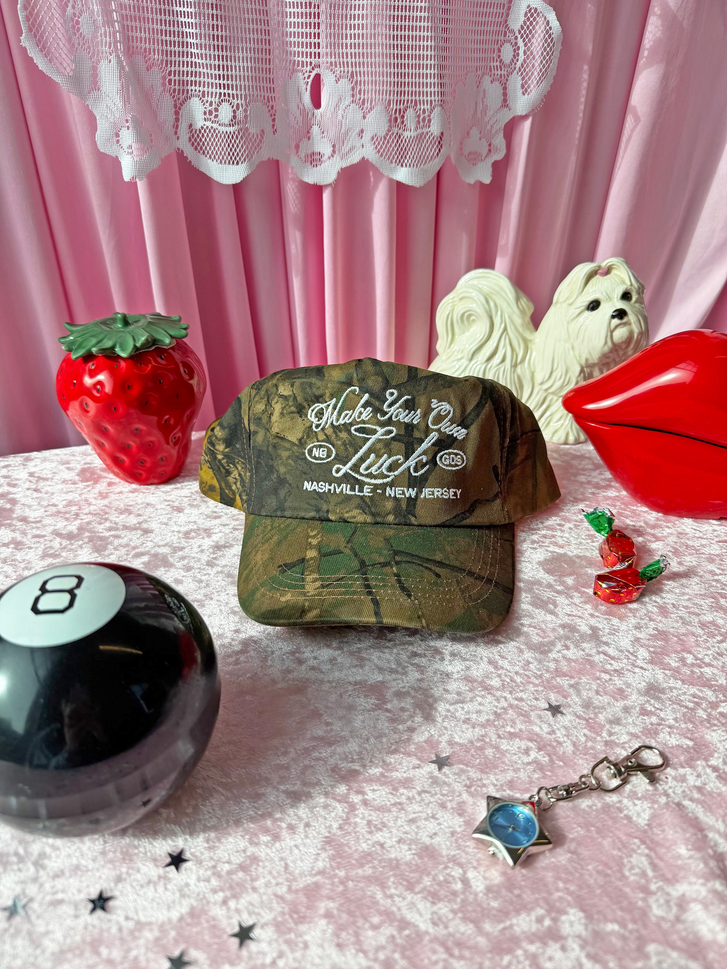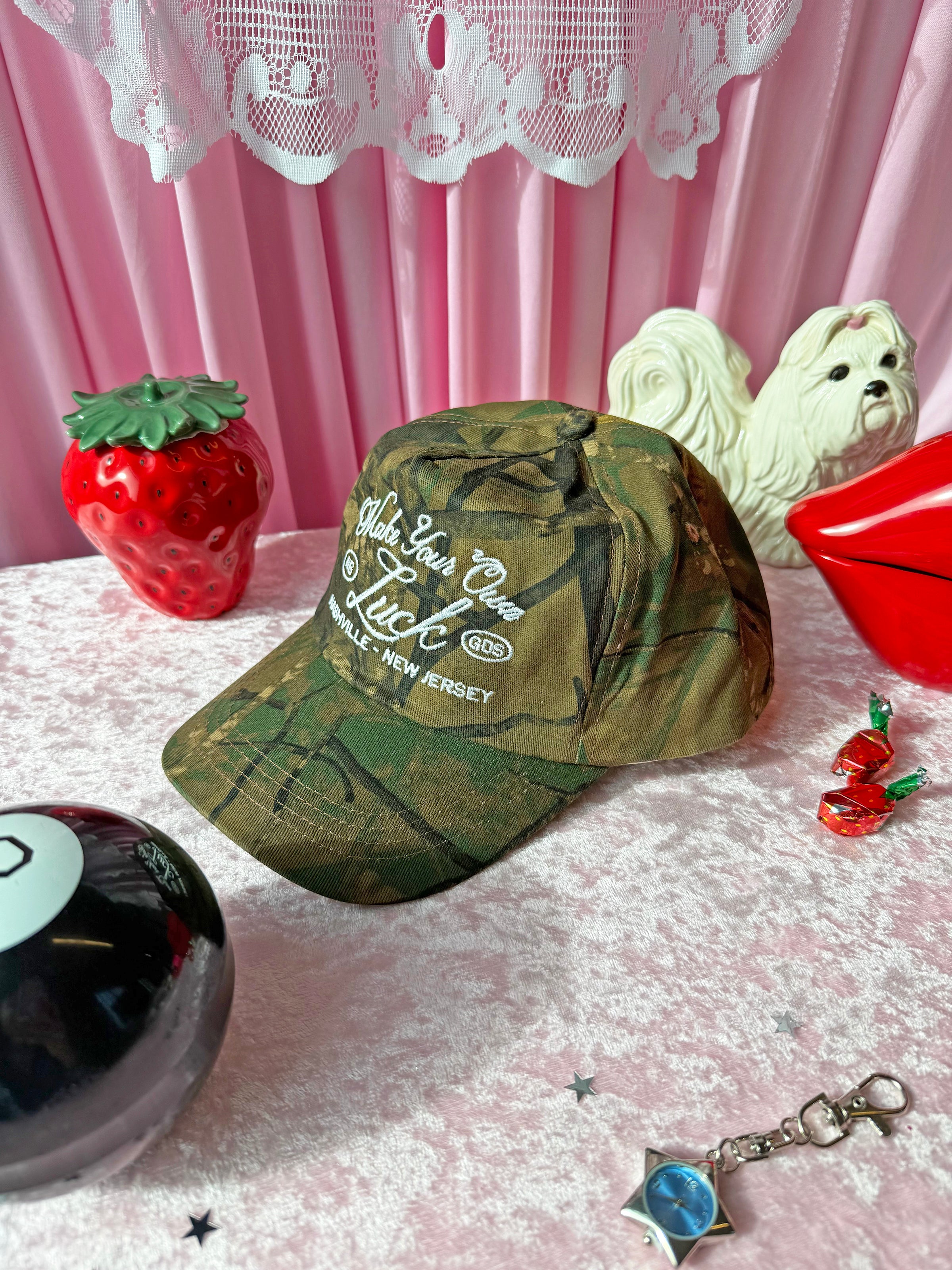 We're never getting over the camo print hype! This camo hat reads "make your own luck" in a white embroidered cursive font. It's our new motto!