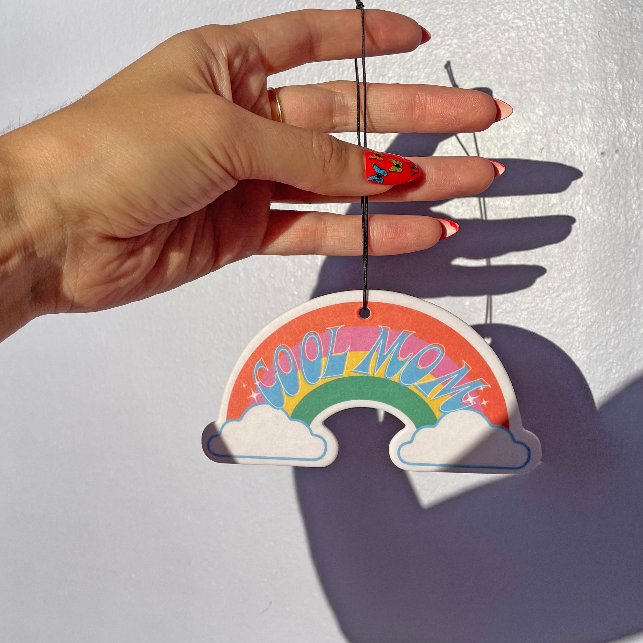 Air freshener is lily scented and comes with an elastic cord to loop around a rearview mirror.