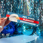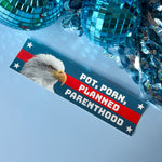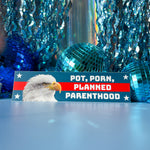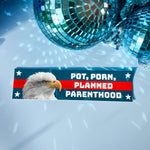 This bumper sticker reads, "Pot, Porn, Planned Parenthood", the ultimate trifecta, and has the nation's favorite bird squawking in approval.