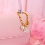 This cup charm is made from a gold toned curb link chain and has a pearl heart, cat, and gold heart charm attached.
