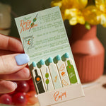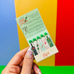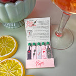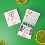 Each matchbook has 10 matches, each printed front and back with an ingredient to make the cocktail. Match heads are custom colored to coordinate with the matchbook.