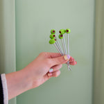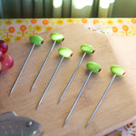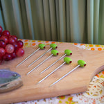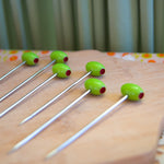 This set comes with six stainless steel martini picks with acrylic olive heads.