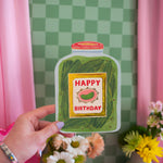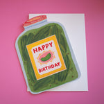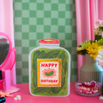 How CUTE is this card?! It's shaped like a big jar of pickles (yummy) and has a sweet label on the front that reads "HAPPY BIRTHDAY". The pickle jar design continues onto the back of the card, too! Perfect card for the pickle lover in your life! T