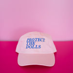 This light pink dad hat reads "protect the dolls" in blue embroidery across the front. Looks perf with any outfit and is adjustable - we love!!