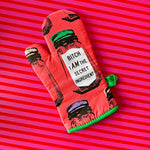 This high quality oven mitt is insulated and made with 100% cotton material! One side of the oven mitt features a super secret ingredient jar that reads "bitch i AM the secret ingredient" and the other side is a lighter shade of pink that features multiple ingredient jars with different colored lids. The bottom edge of the mitt is a gorgeous bright green color and has a matching loop for convenient hanging when not in use!