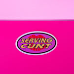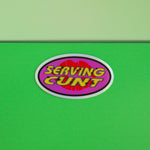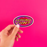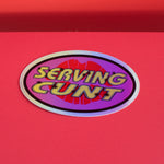 This 90's, retro inspired sticker reads "serving cunt" in holographic glitter!