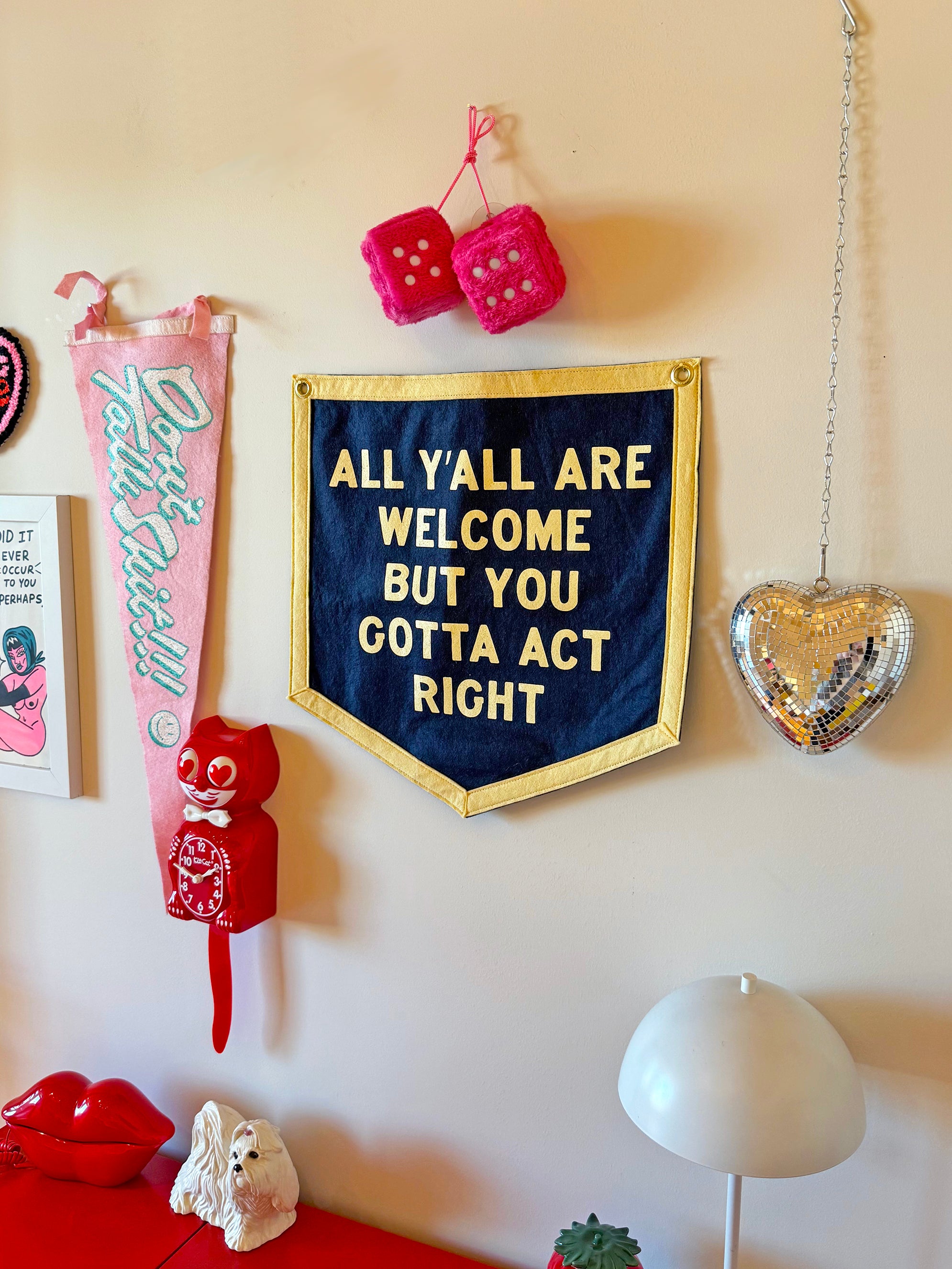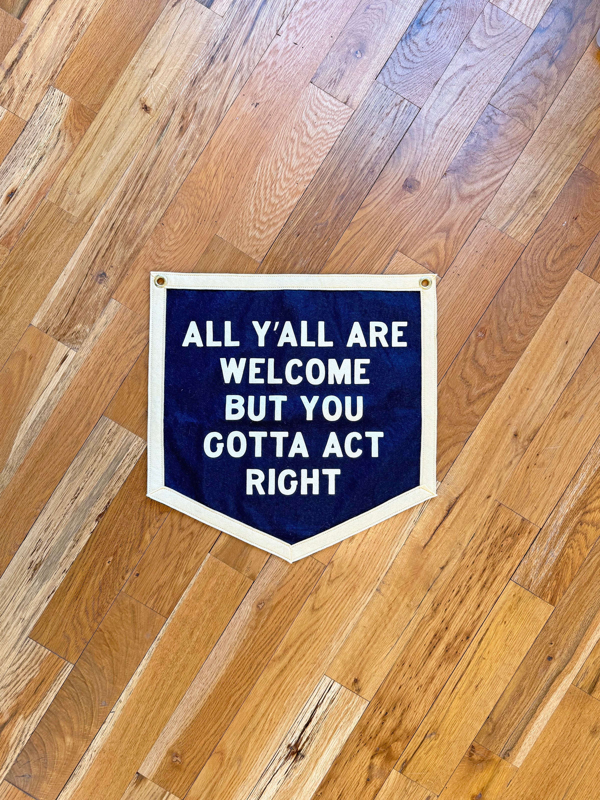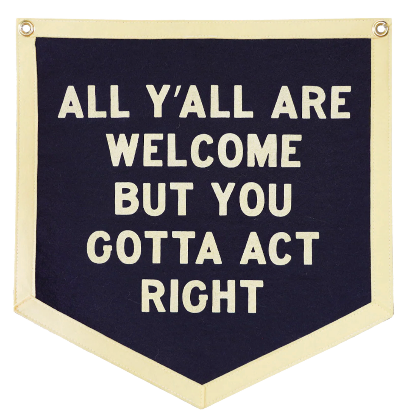This 5 sided navy camp flag reads "all y'all are welcome but you gotta act right" in a cream-colored, vintage inspired font! Made in collaboration between Oxford Pennant and Tate Farms! It has 2 grommets, one on each top corner, for easy hanging. Perfect to hang in your bedroom, the blank spot on your photo wall, or even as a cute photo prop!