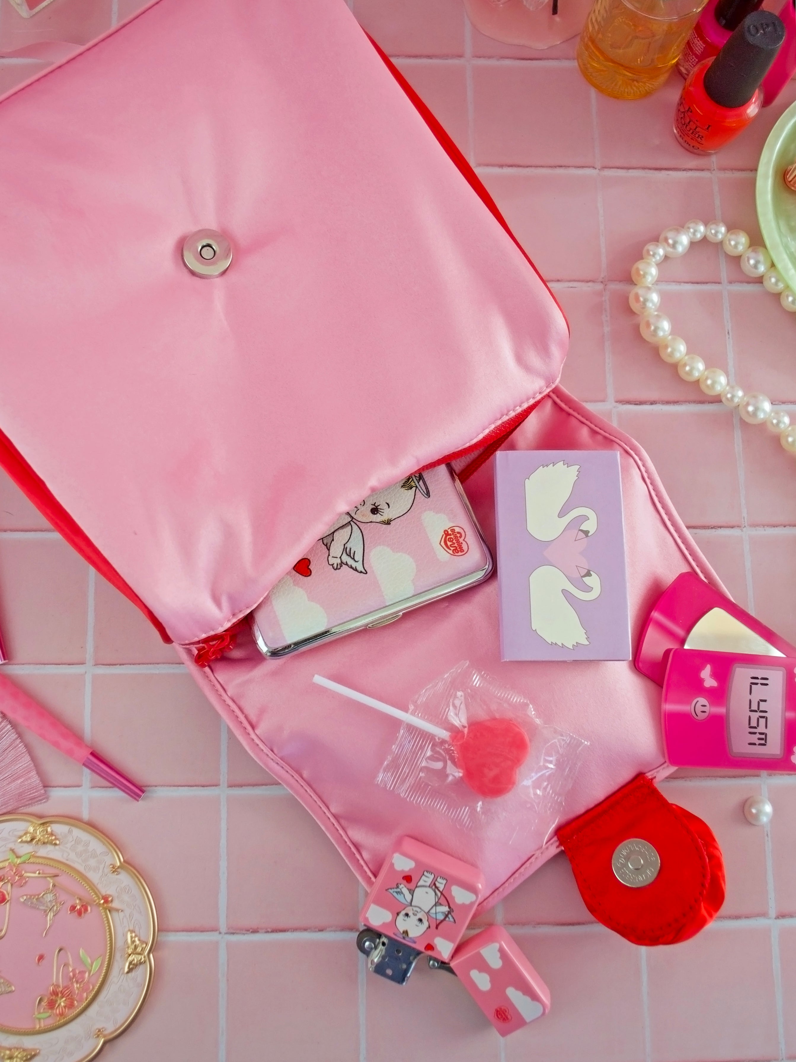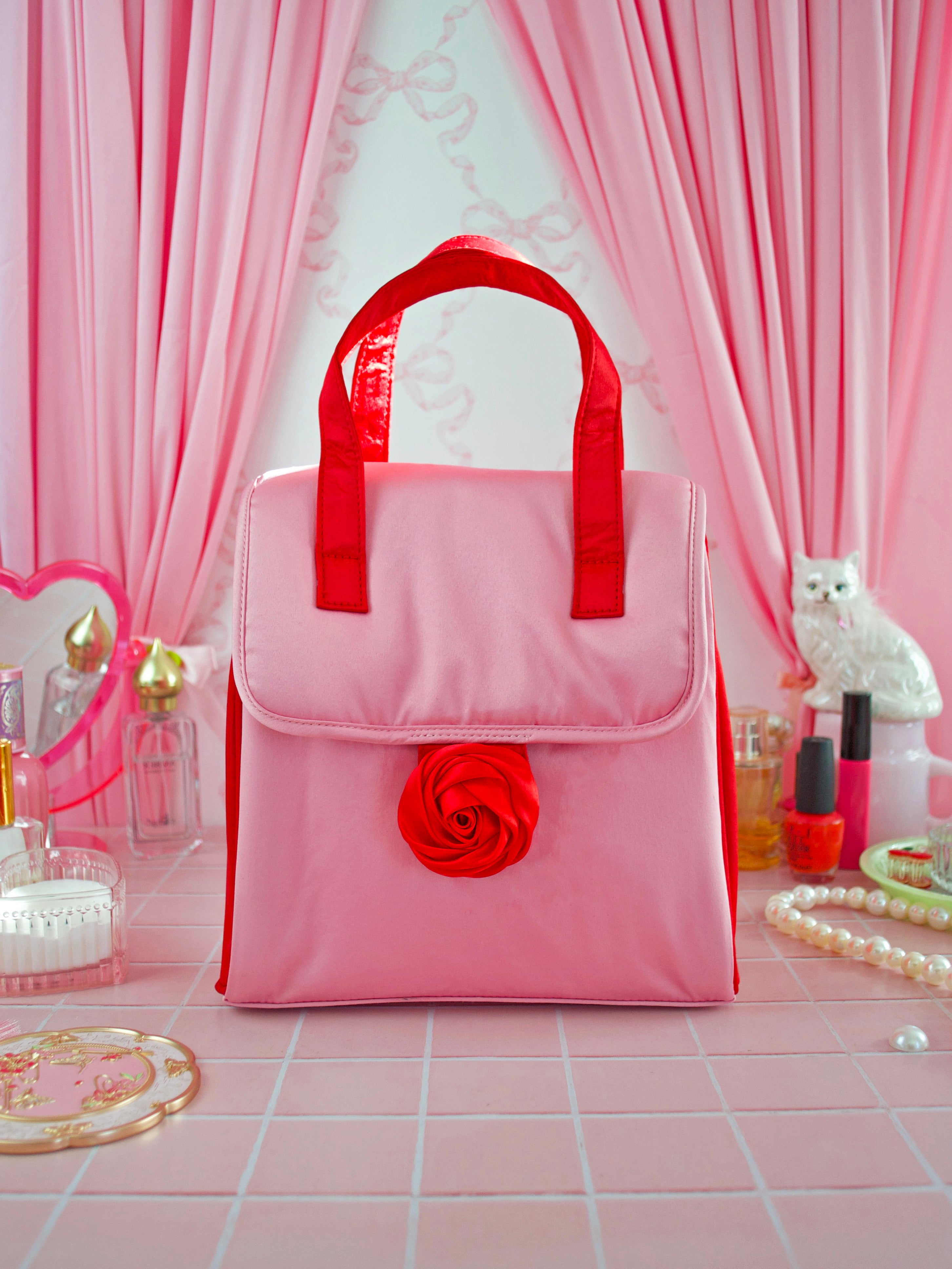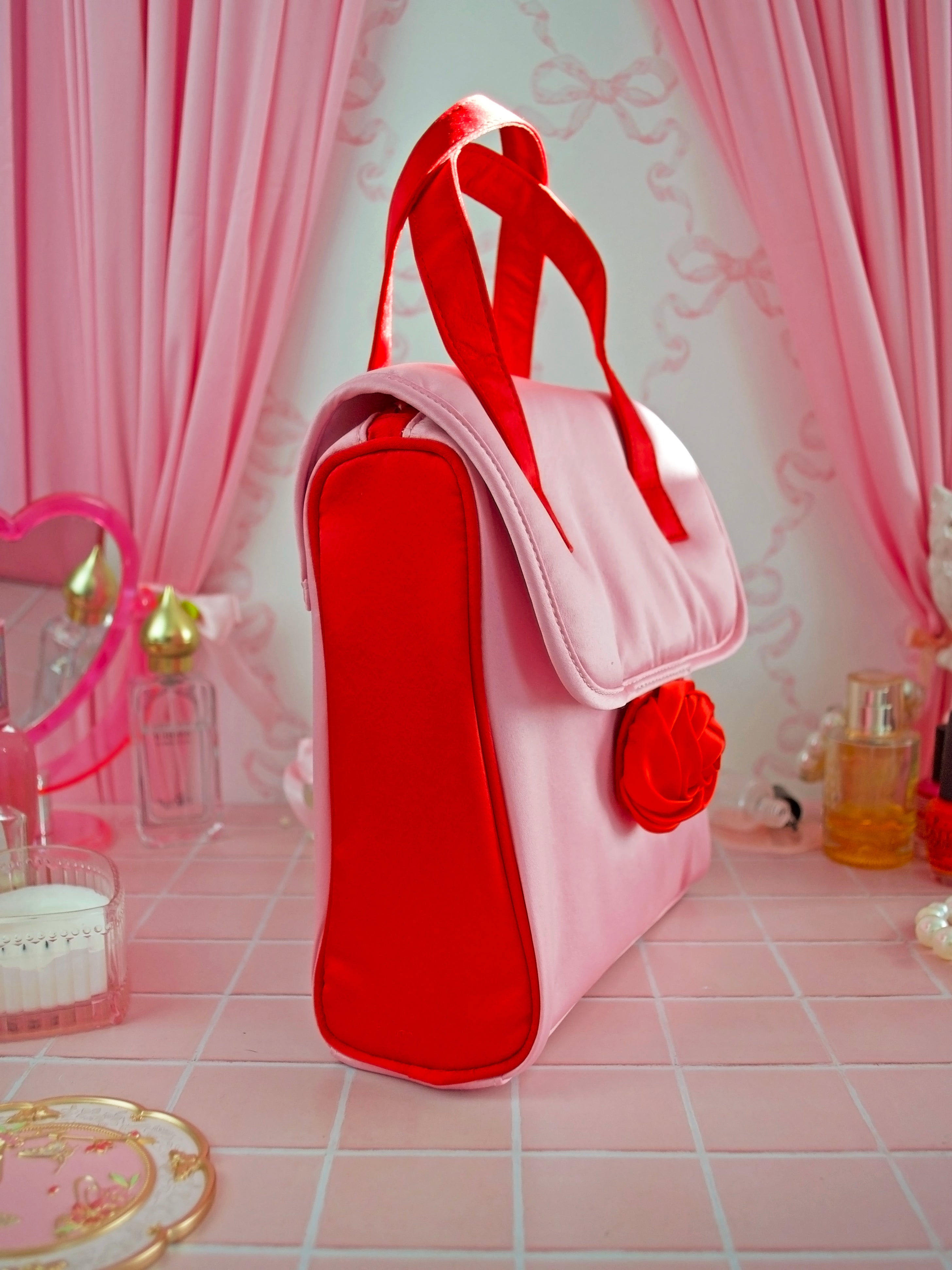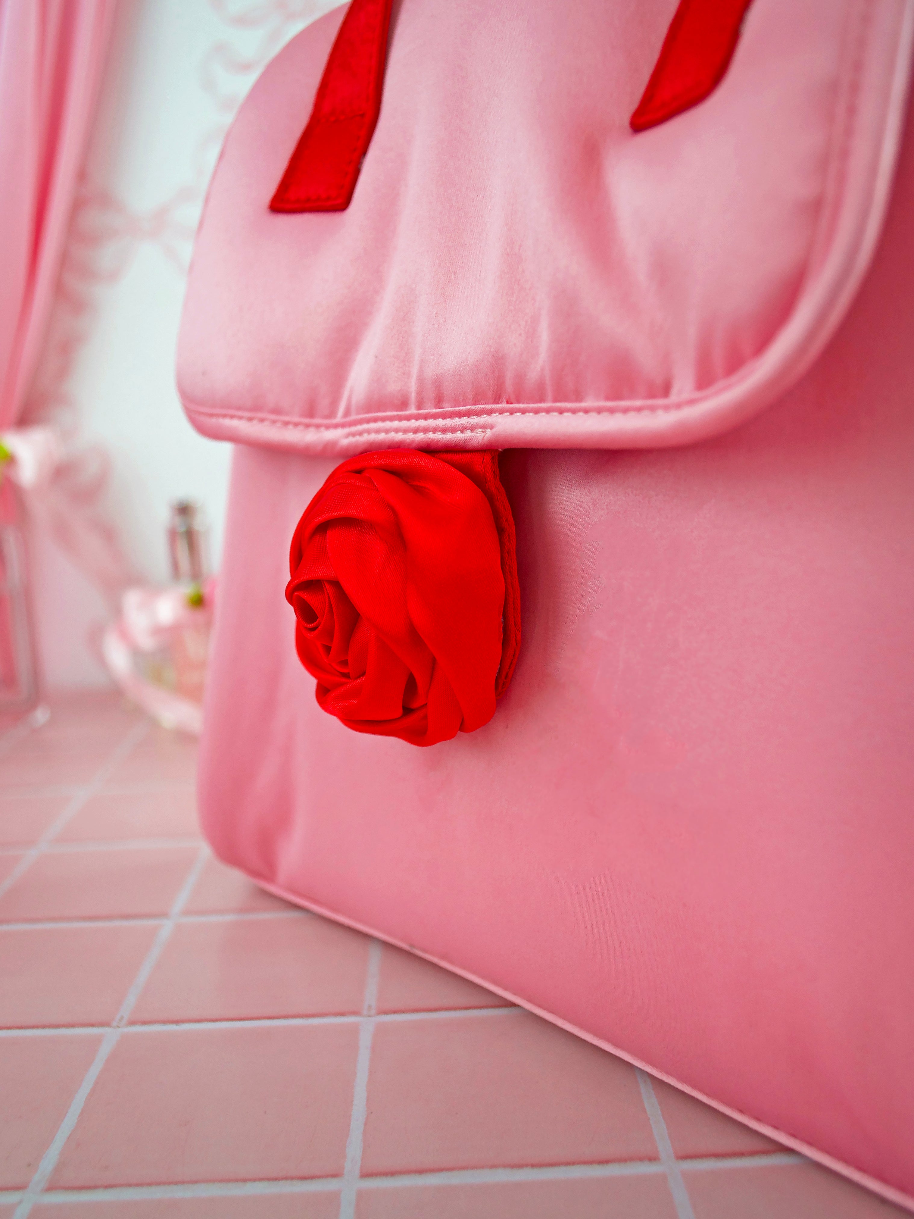 This adorable smell proof handbag is just the thing you need for your next sesh! This bag is made of dreamy pink satin with a convenient red handle and matching red sides! The magnetic button closure is disguised as a GORGEOUS red rosette - how precious!! Zips closed at the top with the sweetest red bow zipper! What more could a coquette girlie ask for?