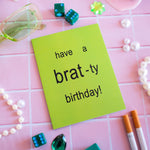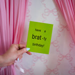 It can be brat summer any day of the year with this card! Comes in a fun brat-green color and reads "have a brat-ty birthday!" on the front! Perfect birthday card for the charli xcx fan in your life - we all know one!!