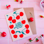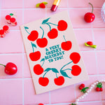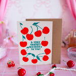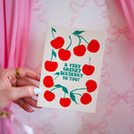 This card is the cutest! It features a bunch red cherries with green stems on a pretty pink card, complete with an even sweeter sentiment, "a very cherry birthday to you!" The perfect birthday card for your sweetest friend!