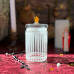 This stunning piece makes us want to slip on a vintage nightgown, retreat to the drawing room, and savor a relaxing nightcap, so honk shoo! Features a gorgeous frosted glass etched design and a lid that resembles a flickering flame. Stunning! The lid seals tightly, keeping your stash fresh in style! Also looks cute as a storage jar for your kitchen, bathroom, bedroom, bar cart etc!