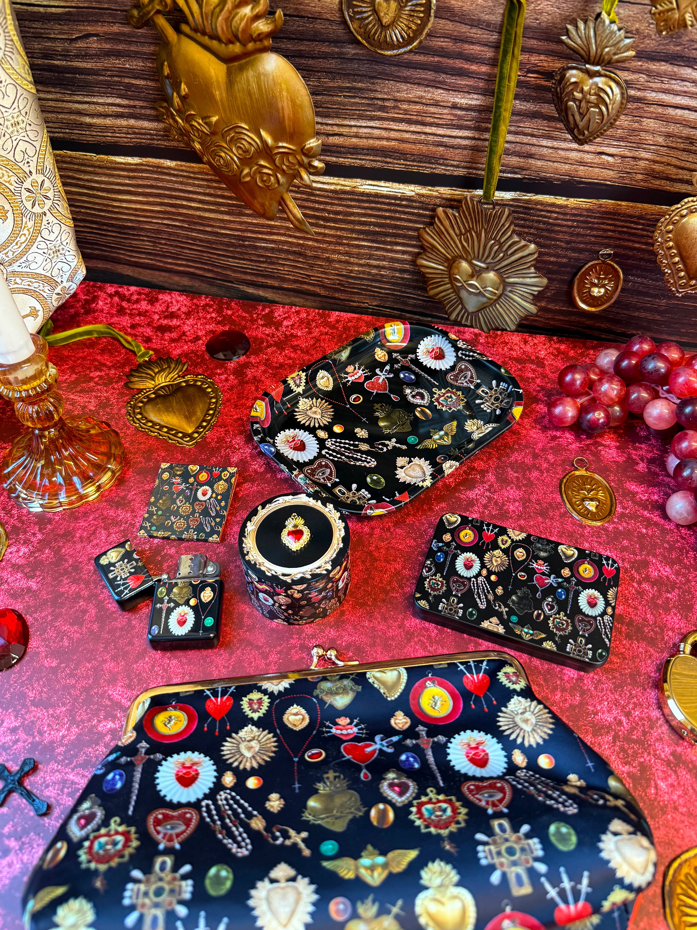 This black lighter features a repeating sacred heart print on the front and back! Perfect for lighting cigarettes, candles, or whatever else you need a fire for!