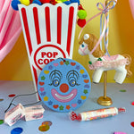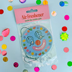 This blue air freshener features an iconic clown face surrounded by colorful shapes! Bubblegum scented and comes with an elastic cord to loop around a rearview mirror.