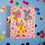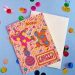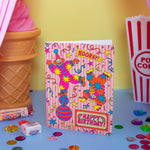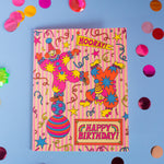 The perfect birthday card for your friend who's always clowning around! Features cute, bright illustrations of clowns, dancing 'n goofing around on a striped and confetti covered background! Reads "Happy Birthday" and "Hooray!".