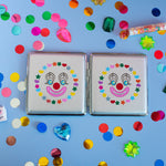 The art on this case is made by us! Both sides feature a smiling clown surrounded by a rainbow of stars and hearts on a shimmery, silver background!