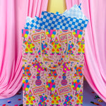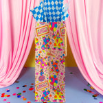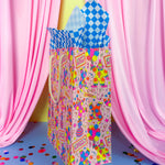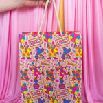 The perfect gift bag for your next birthday party! Features cute, bright illustrations of clowns dancing 'n goofing around on a striped and confetti covered background! Reads "Happy Birthday" and "Hooray!". Woven handles for convenient carrying!