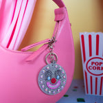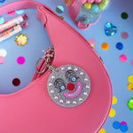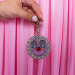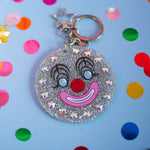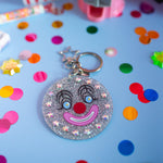 This acrylic glitter keychain features a smiling clown face surrounded by rhinestone stars! Comes with a silver, star-shaped, stay-closed clasp that's easy to add to your keyring without ruining your manicure.