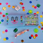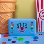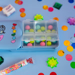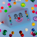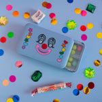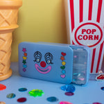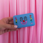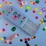 Carry your meds and vitamins in style with this blue clown pill case! Features an iconic clown face decorated with rainbow stars and hearts! Slide open the top to reveal 6 convenient, separate compartments. Water proof + smell proof.