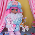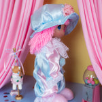 We're obsessed with this pink and blue precious moments clown doll! Her clown look features pink hair, a pink nose, blue eye makeup, and pink flowers painted on her cheek. Her outfit is a classic clown jumpsuit with lace details on the collar and cuffs. Oversized shoes and a hat complete the ensemble. This doll is really serving!