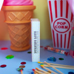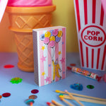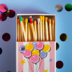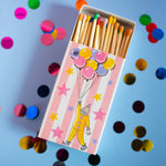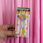 The match box features a cute clown floating away on balloons against a whimsical pink and white striped background! The design is double sided.