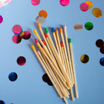 Comes with large, rainbow tipped matches! The striker is on the side of the box.