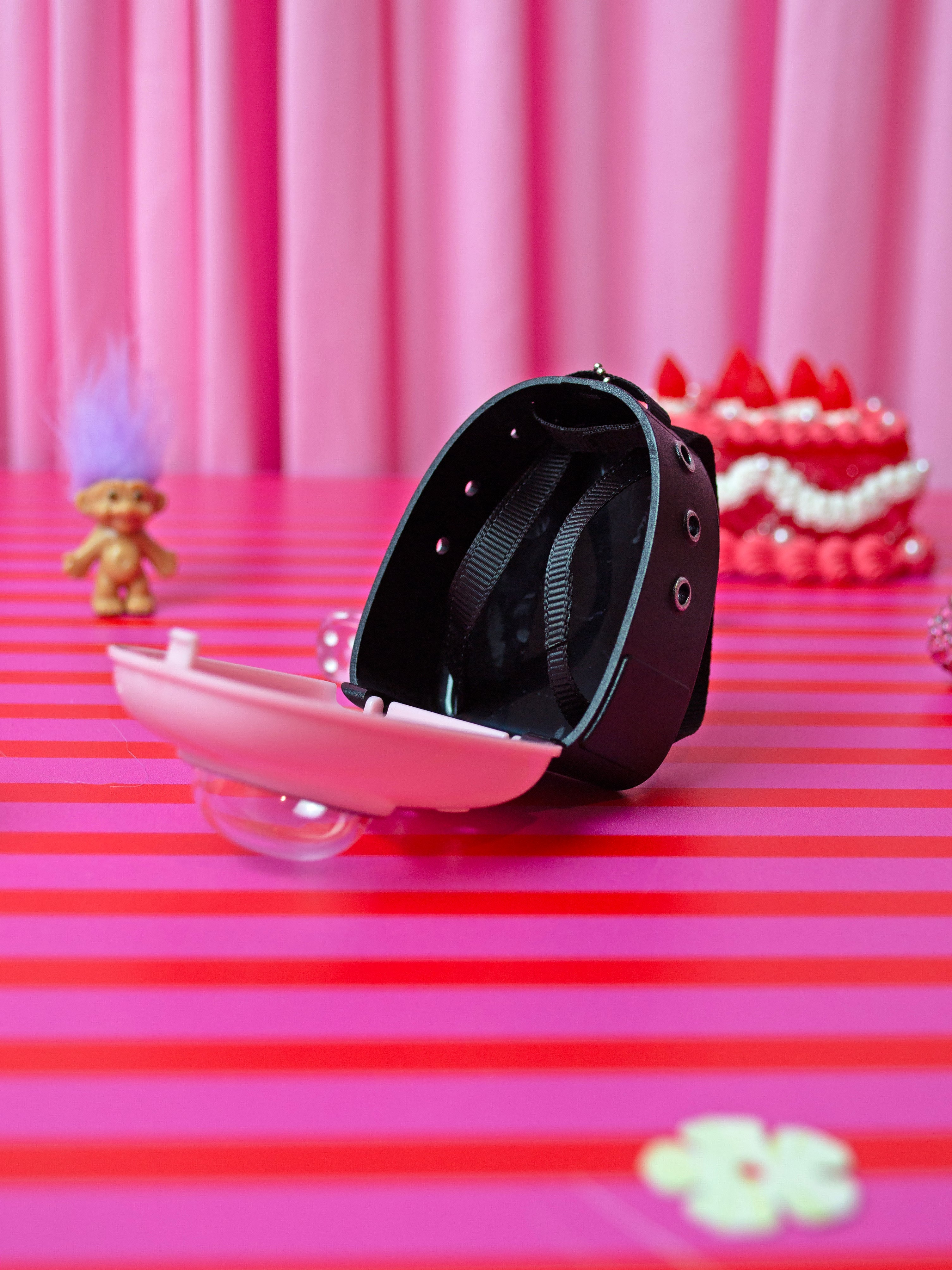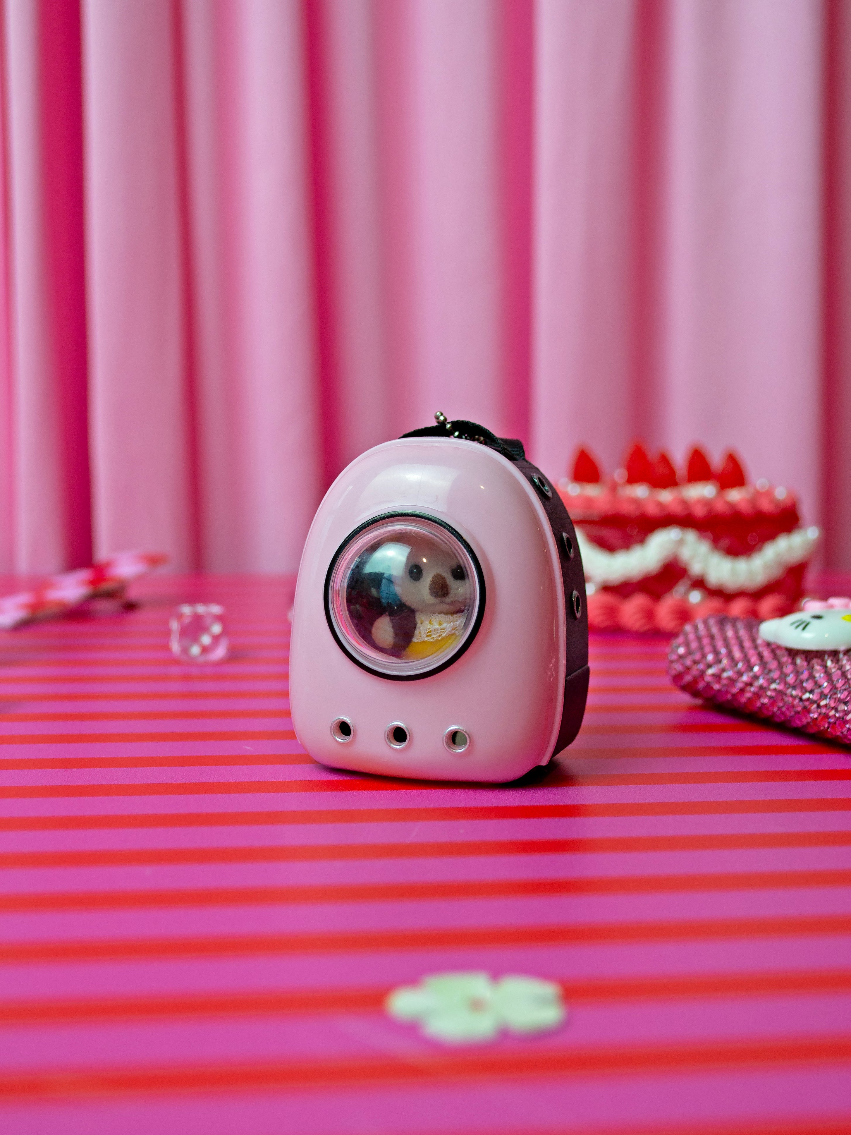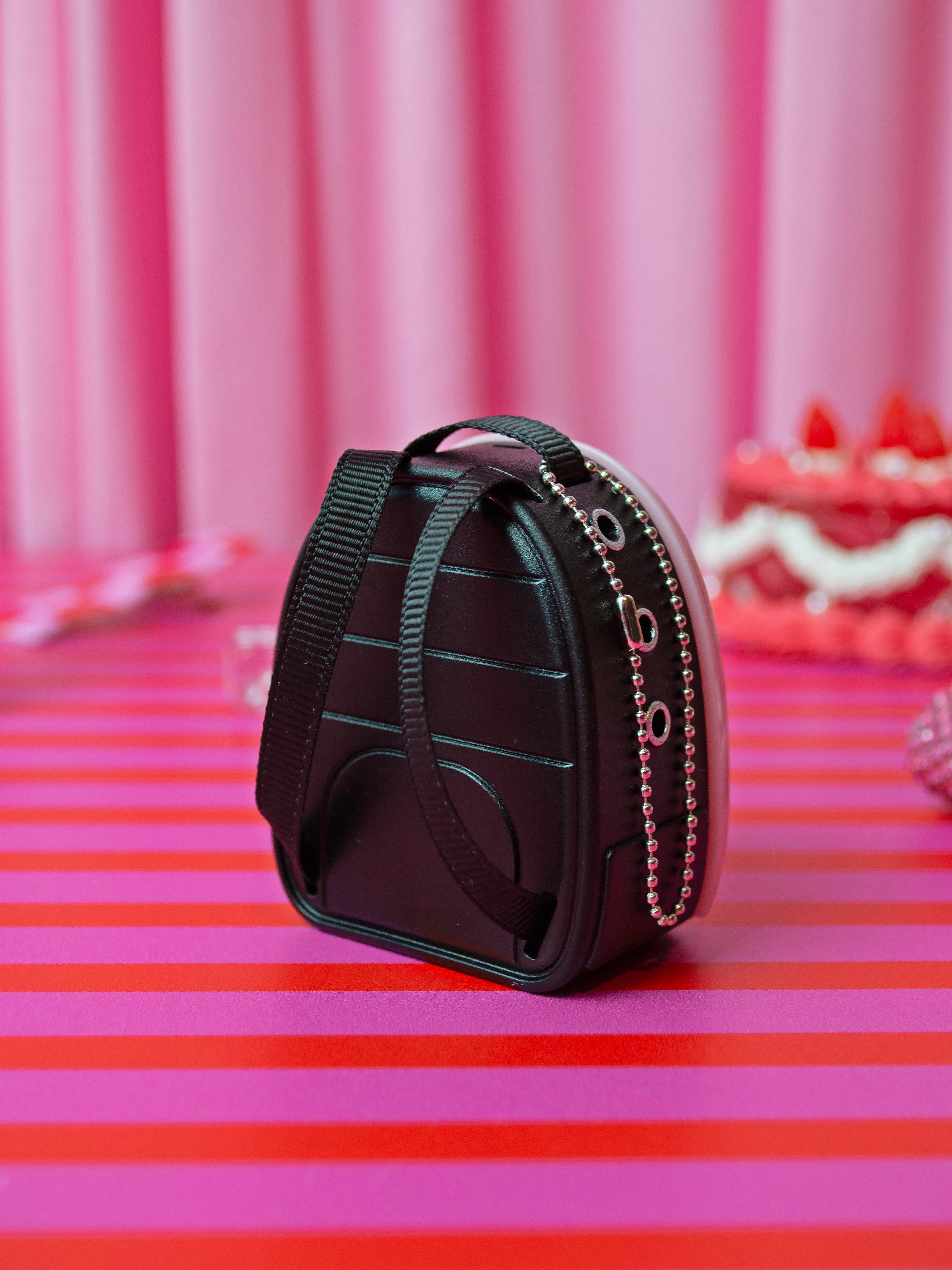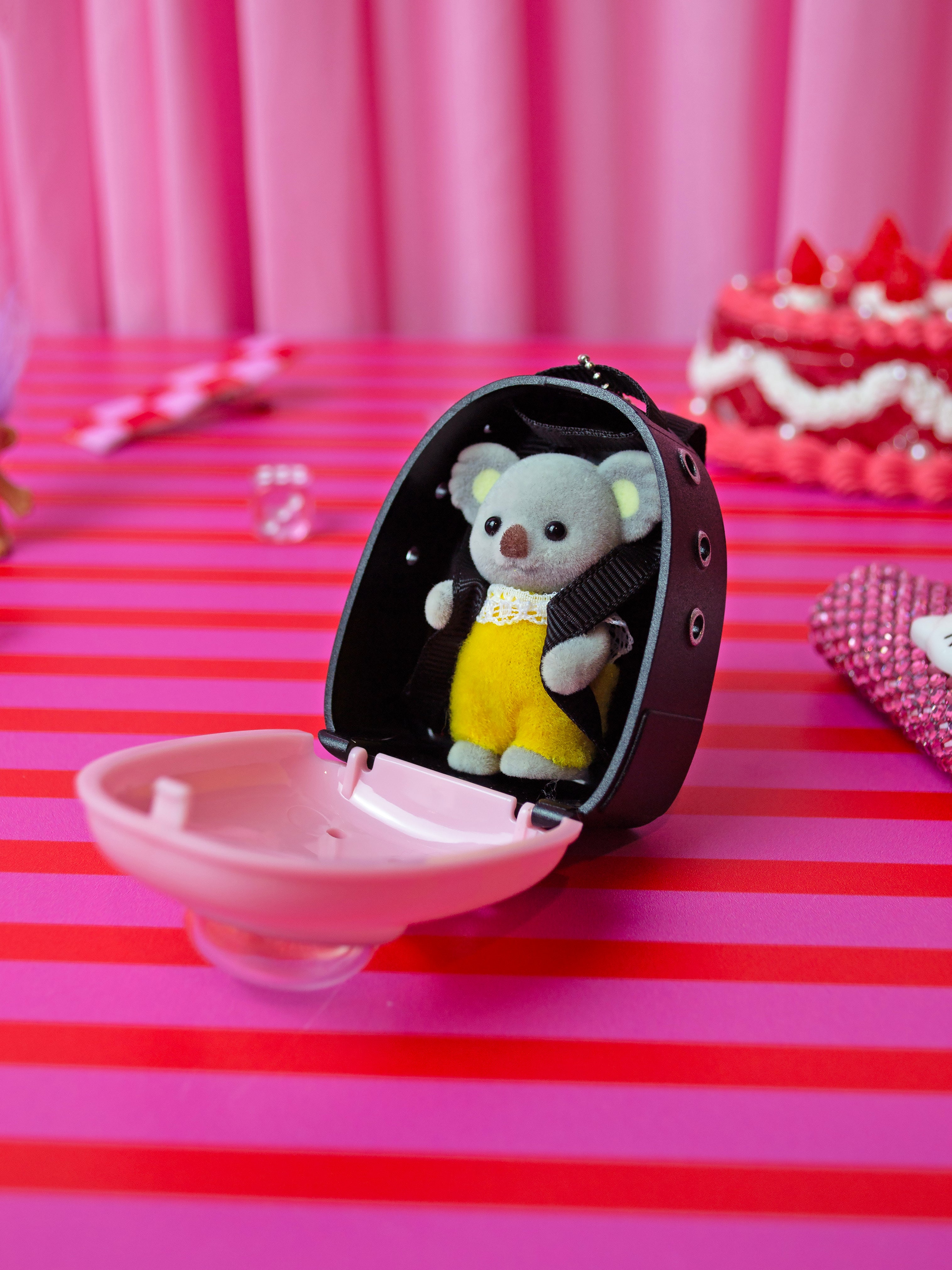 Add this case to your keys, bag, etc and never be lonely again! Perfect for Calico Critters, mini figures, trolls, and the blind box figurines we have here! Comes in a super slay black and pink design with a silver chain <3
