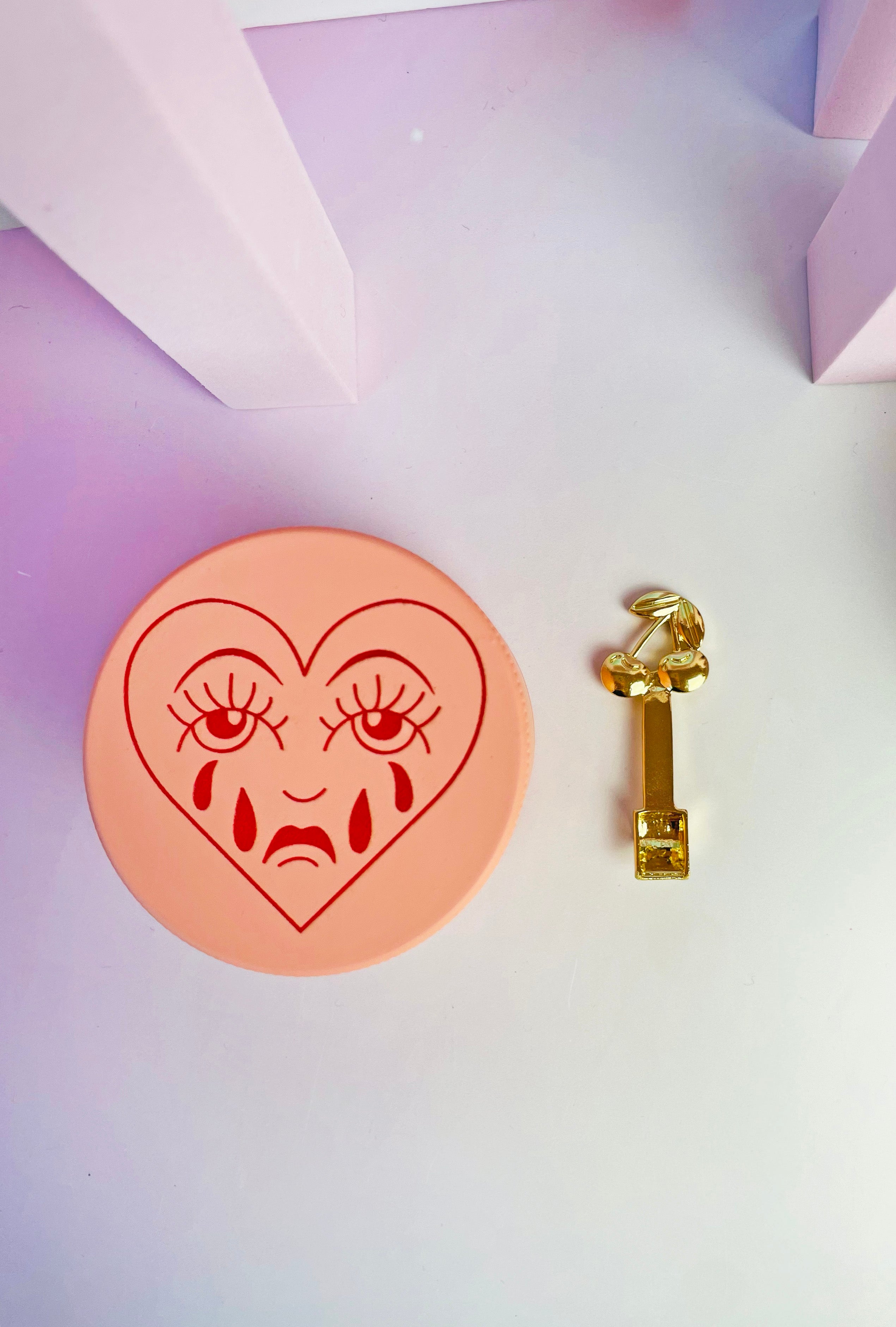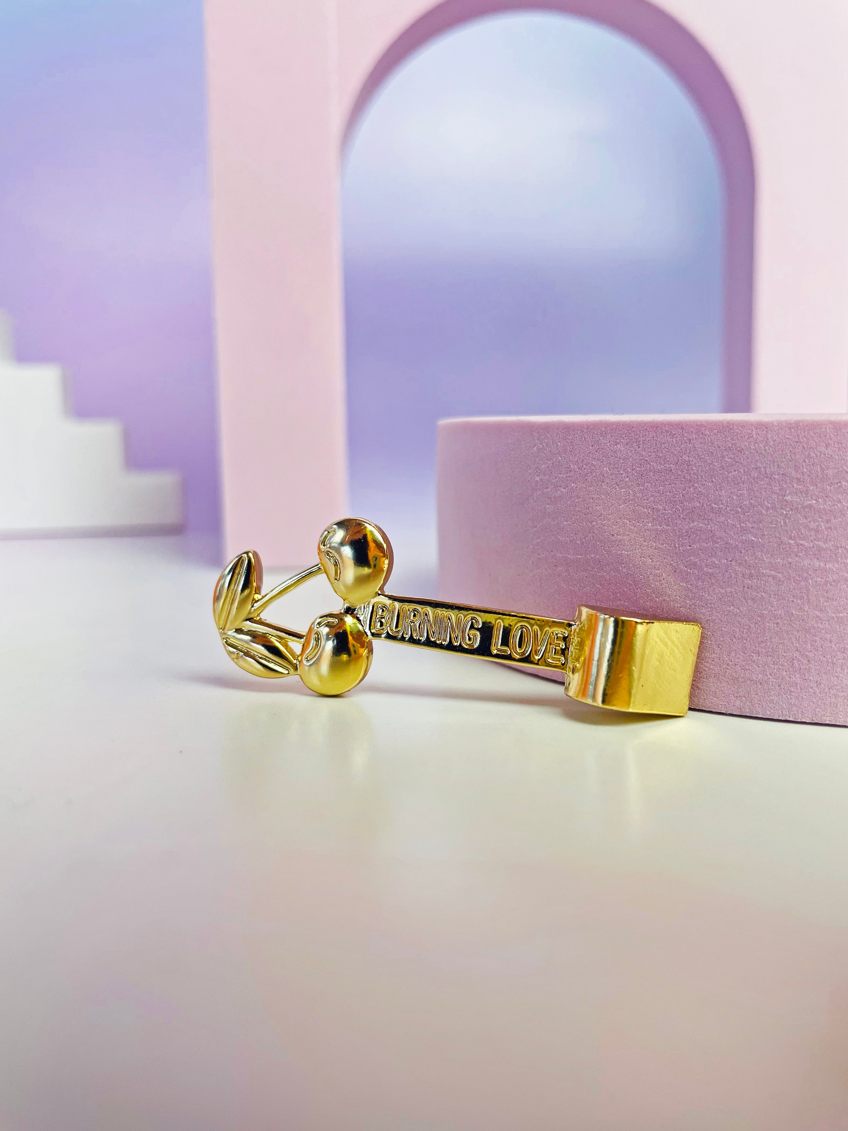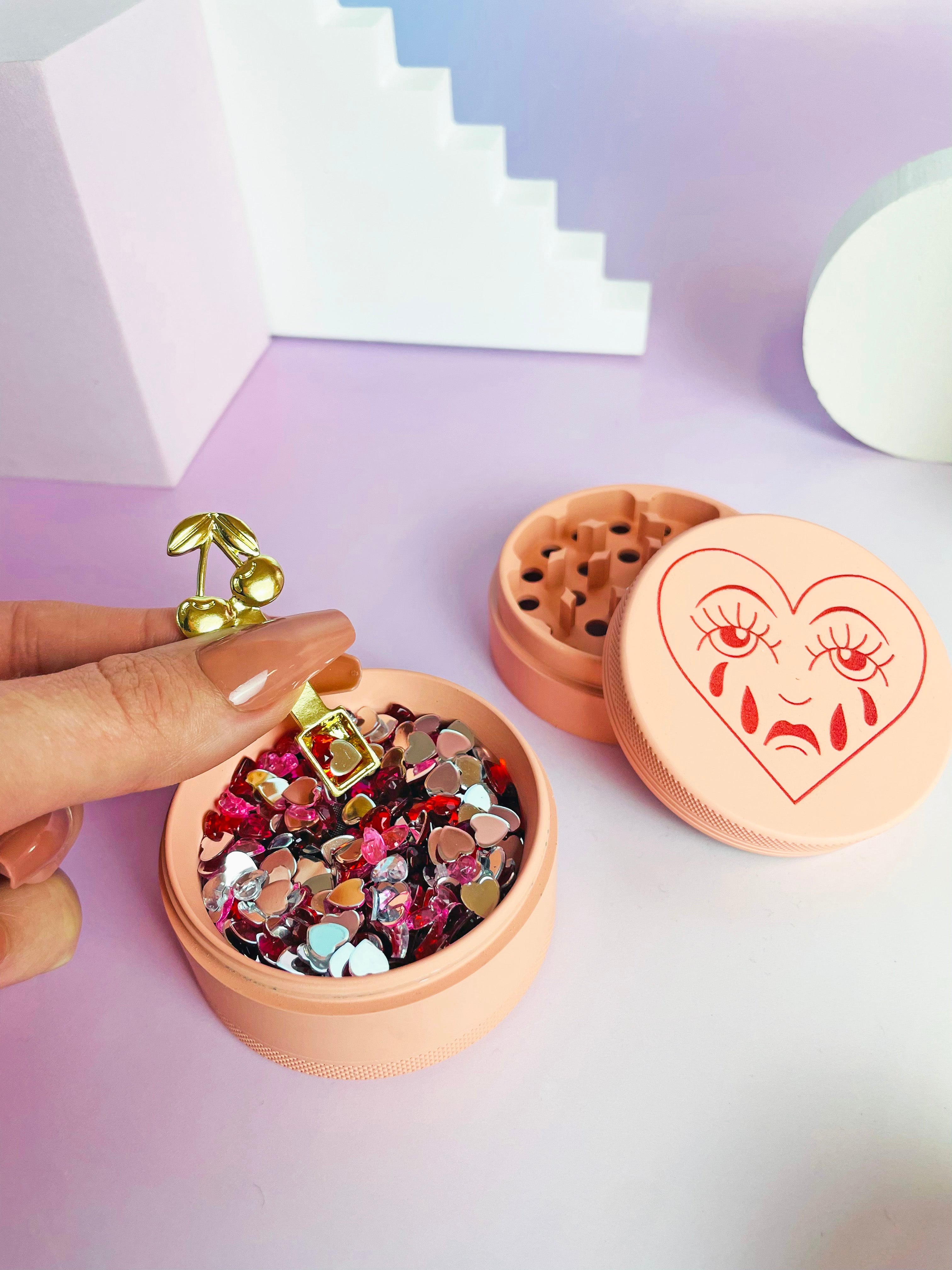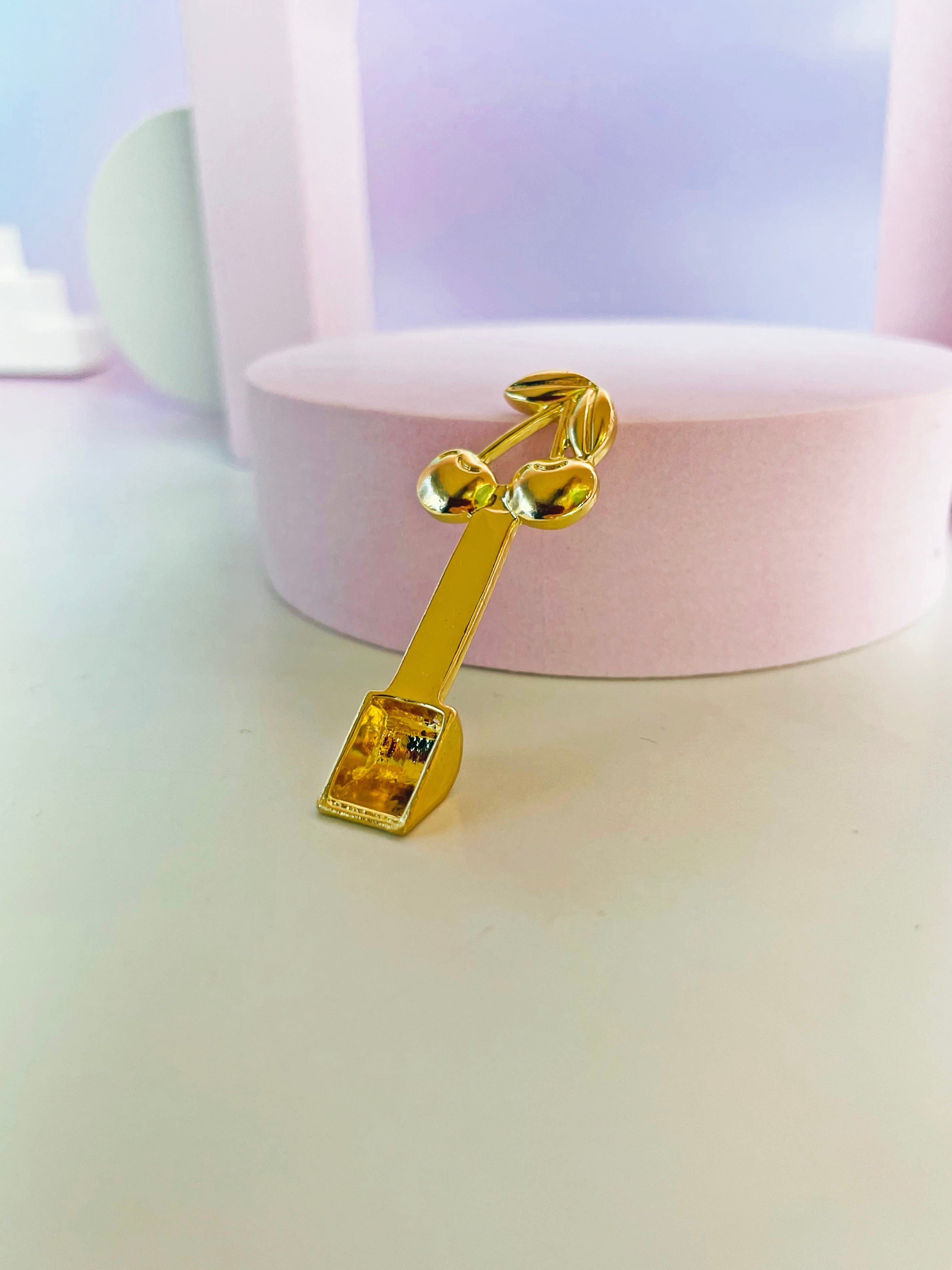 This gold tool has the prettiest cherries on the top of the handle, and fits perfectly in the bottom compartment of most grinders!