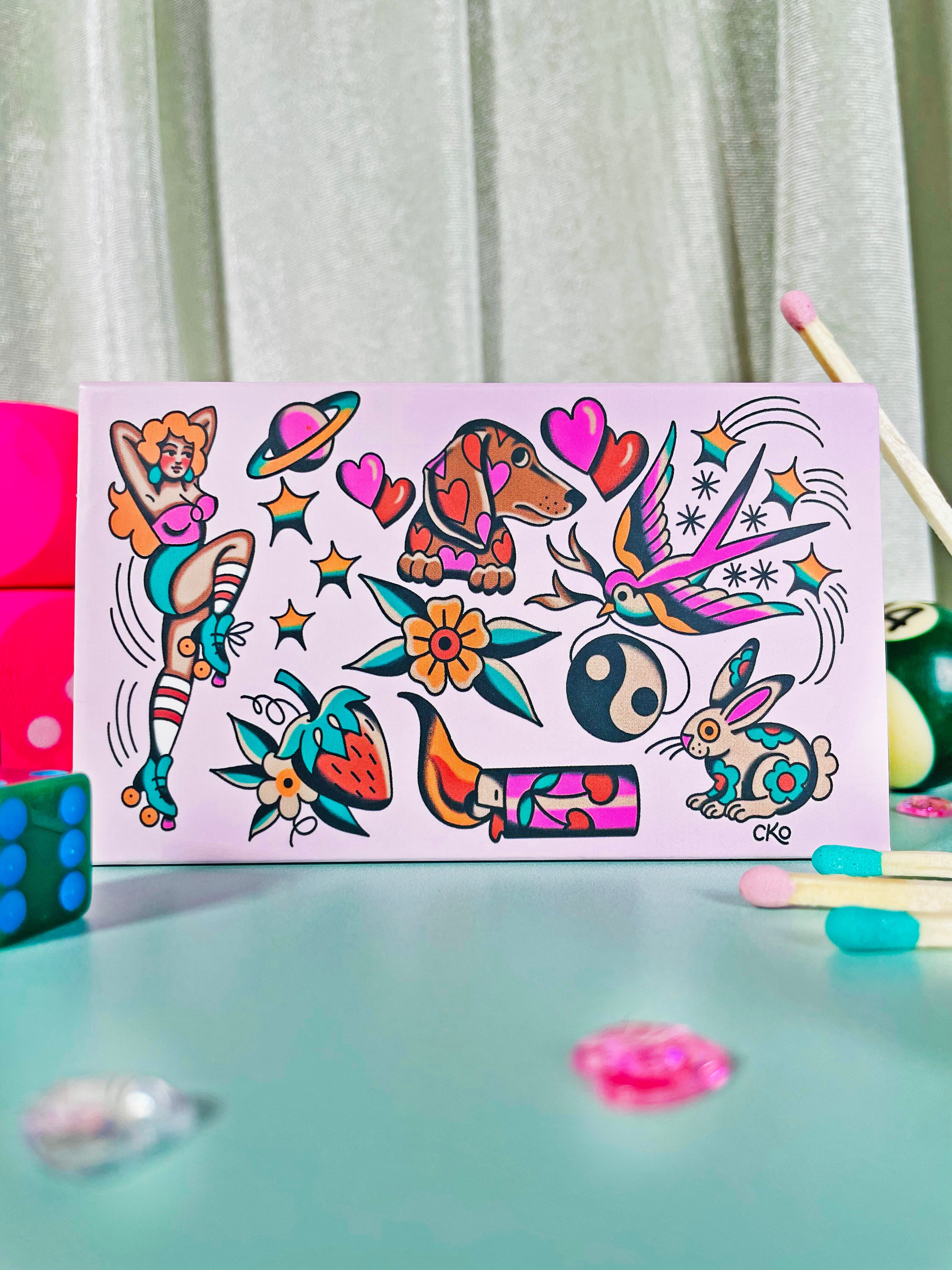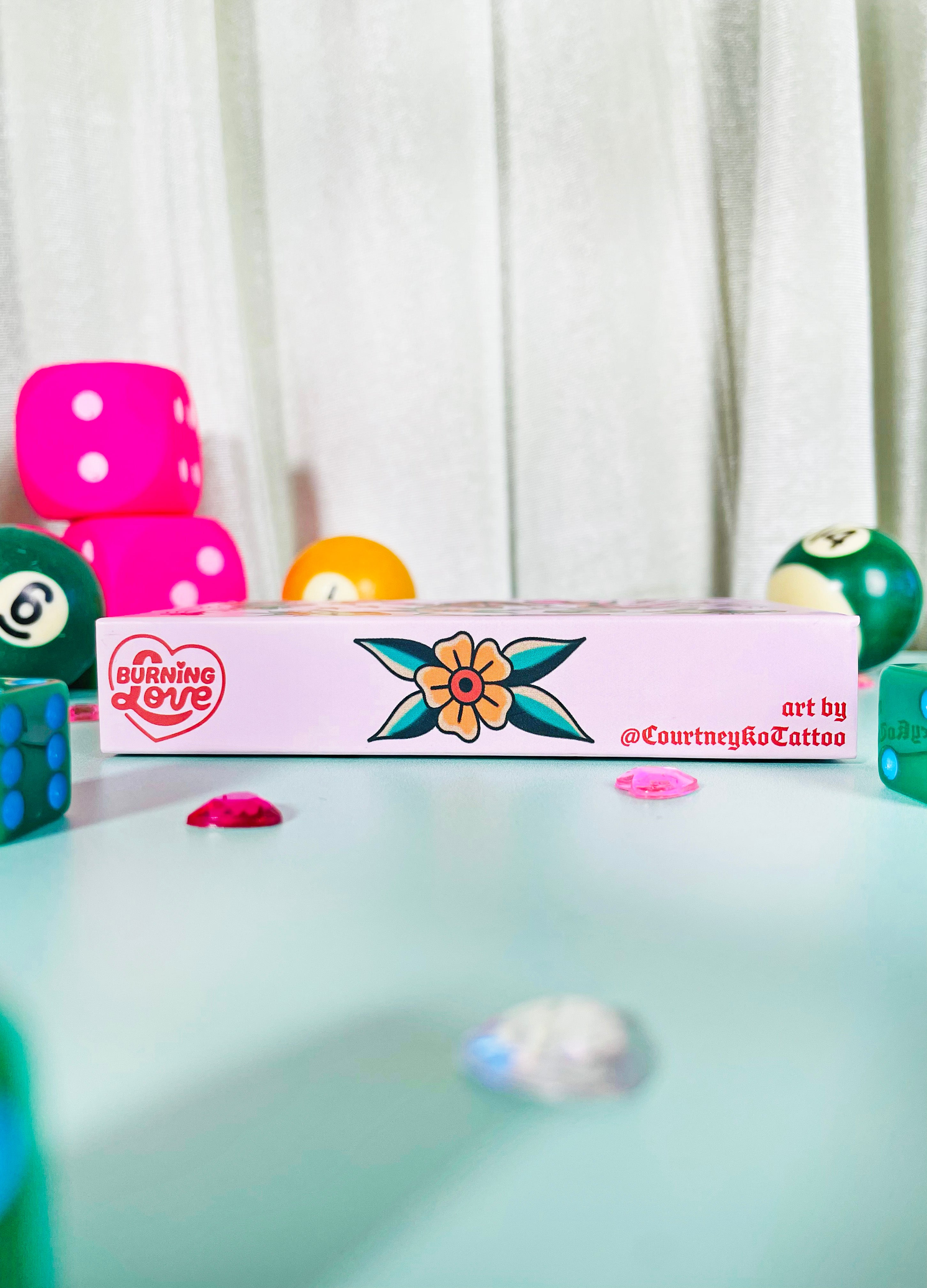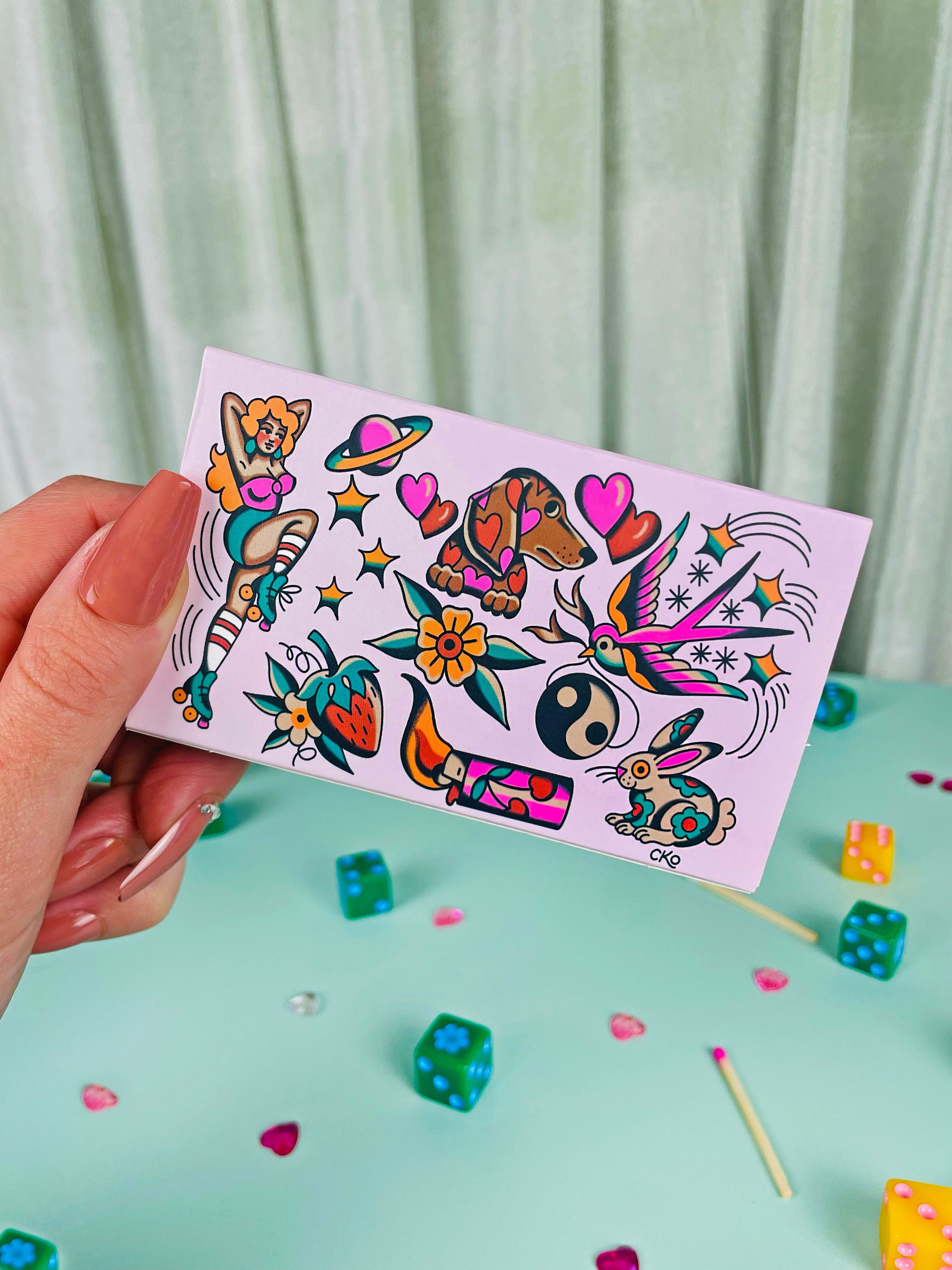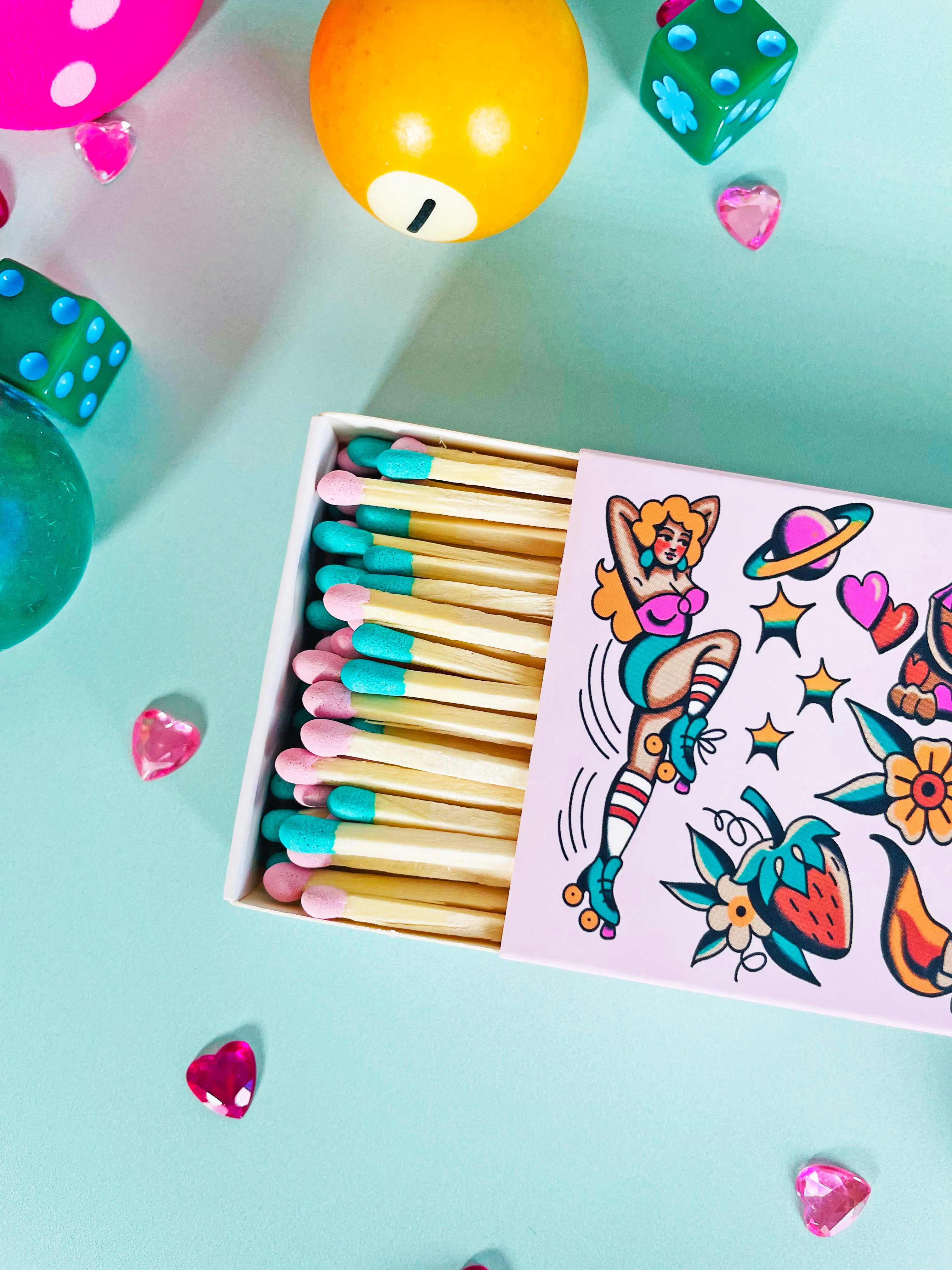 These XL matchboxes feature a striker on one side of the box, pink and green matches, and flash made specially for us by our friend Courtney O'shea at Nashville tattoo shop Black 13 (known on the internet as @CourtneyKoTattoo)!