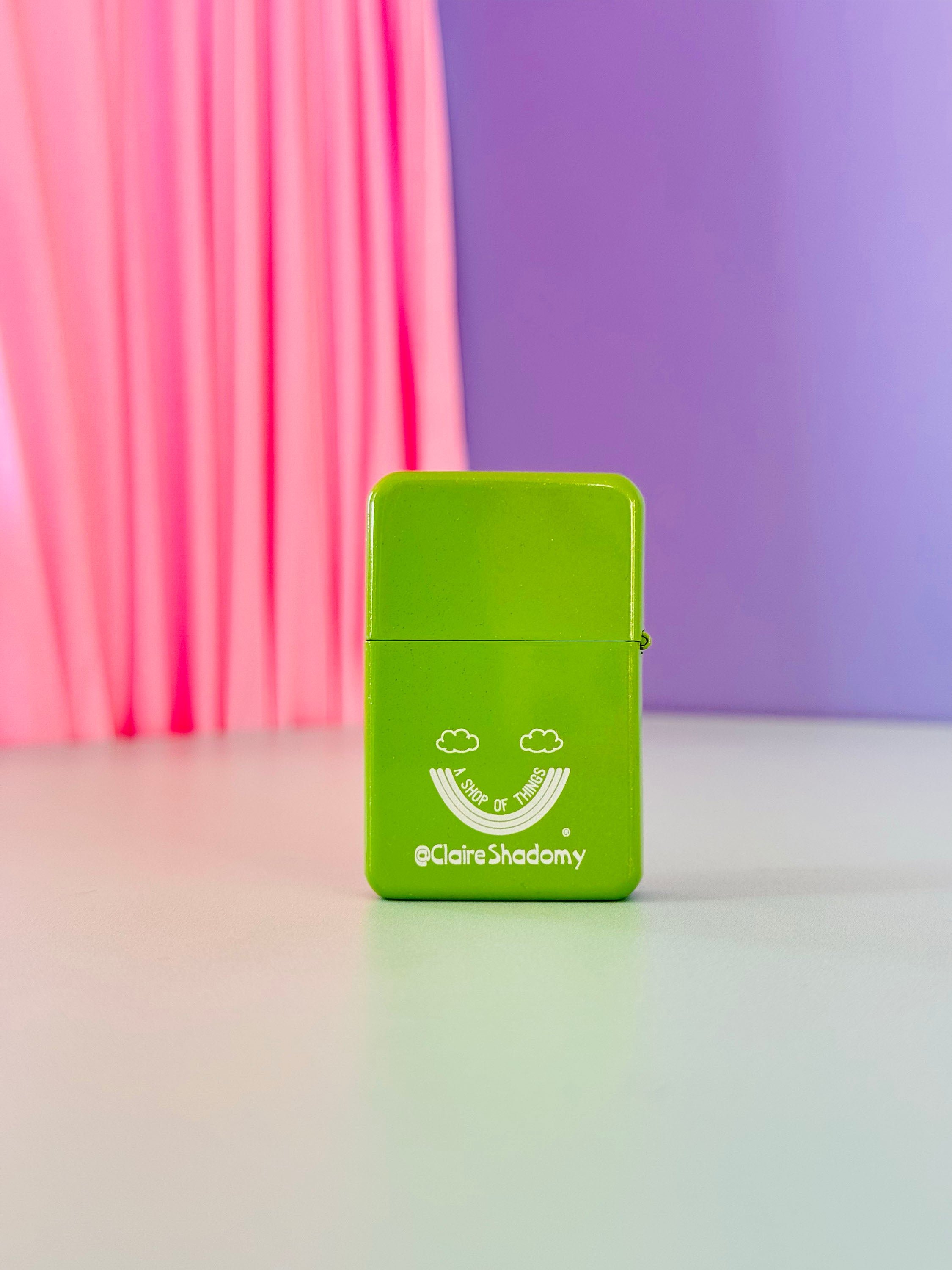 Just. Look. At. How. CUTE! This lighter features the sweetest illustration of a guinea pig wearing a blue bow surrounded by hearts. Art drawn by the talented Claire Shadomy! The lighter itself is green with a slight glittery shine.