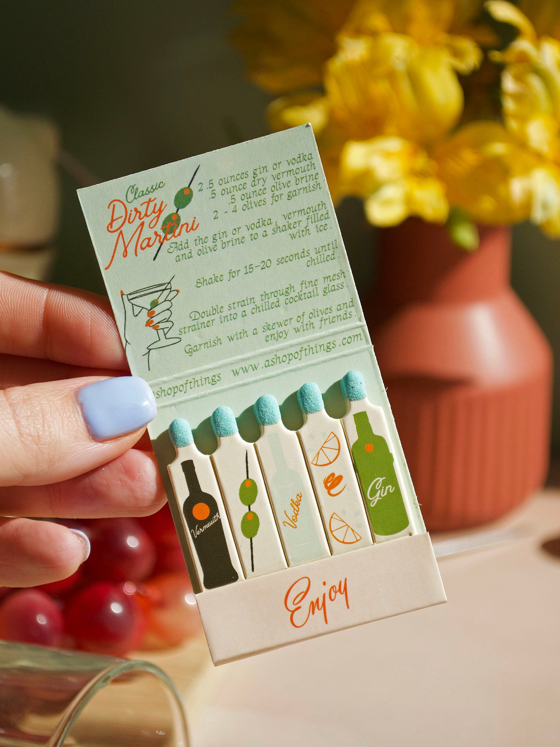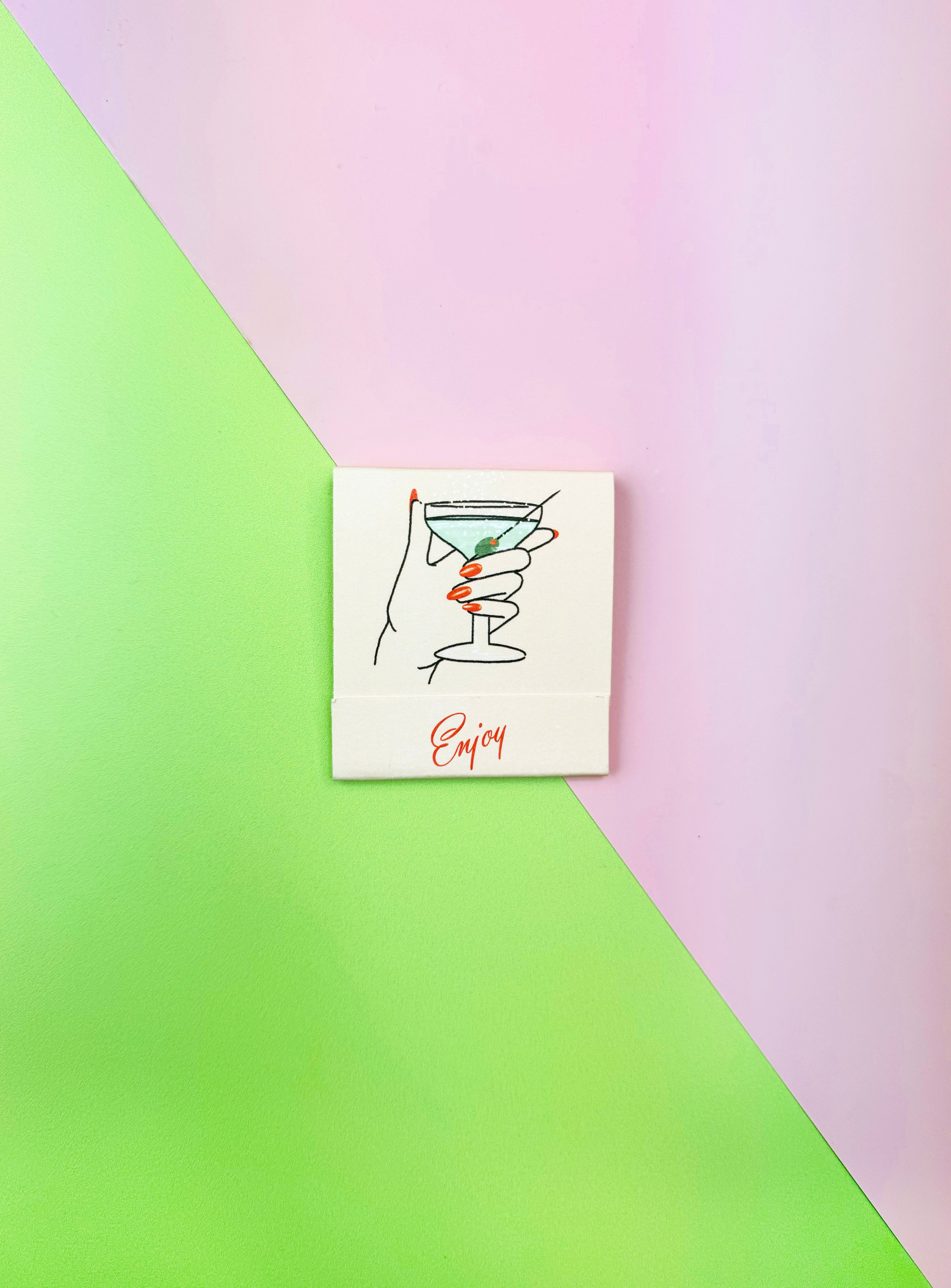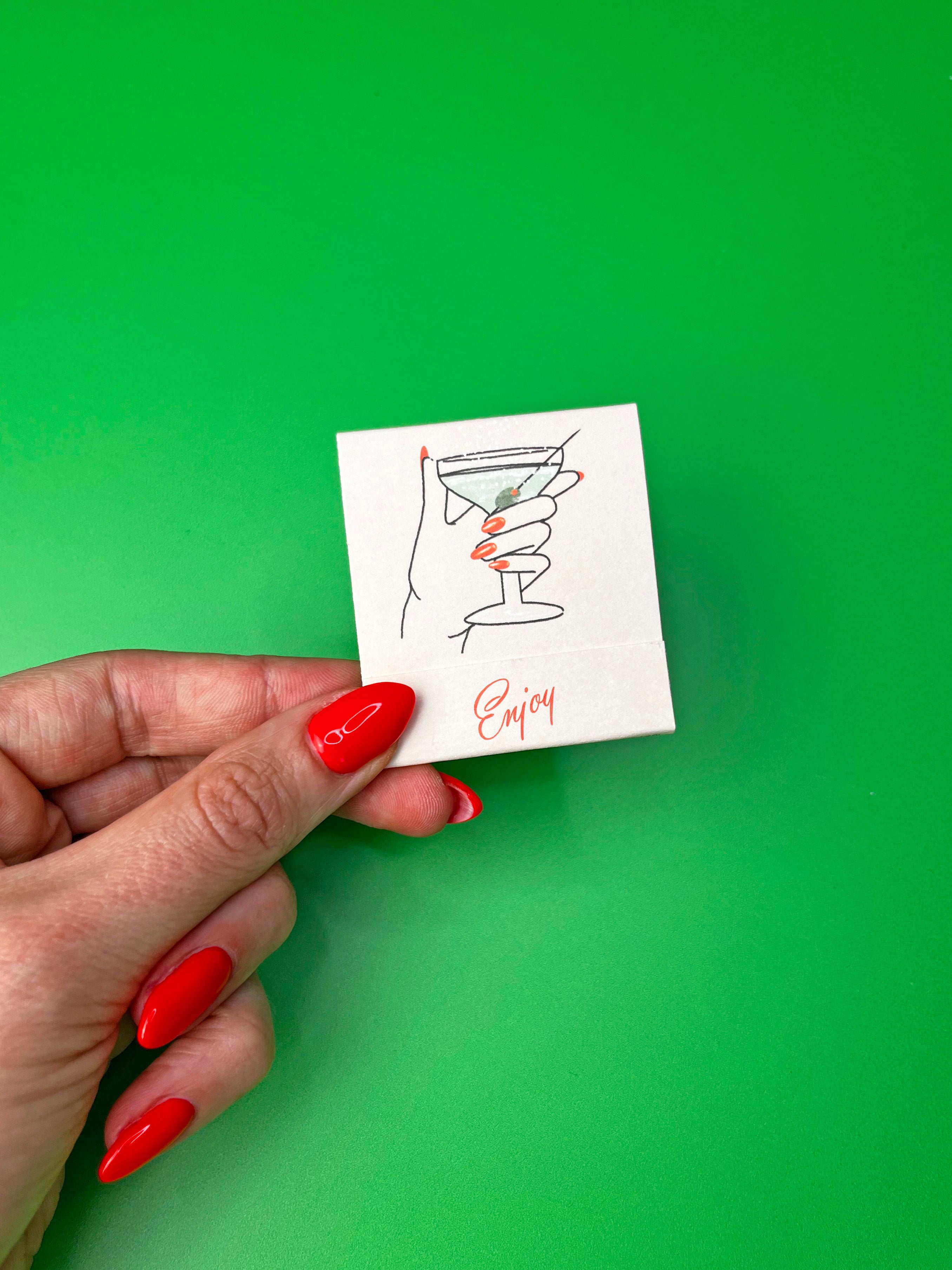 This matchbook features everyone's favorite cocktail- a (dirty) martini! The art is done by meeeee! The inside of the matchbook has the recipe for the cocktail and each match features a different ingredient of that cocktail cause we cute like that.