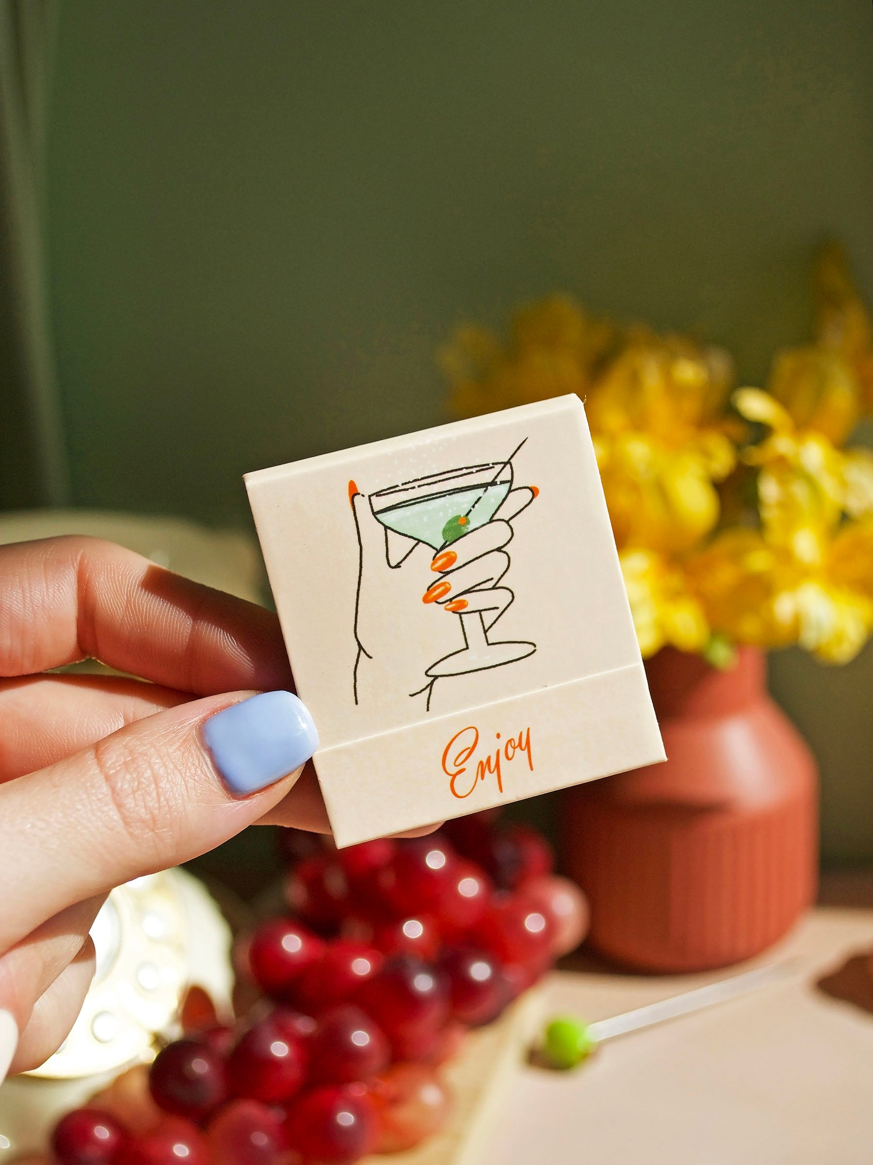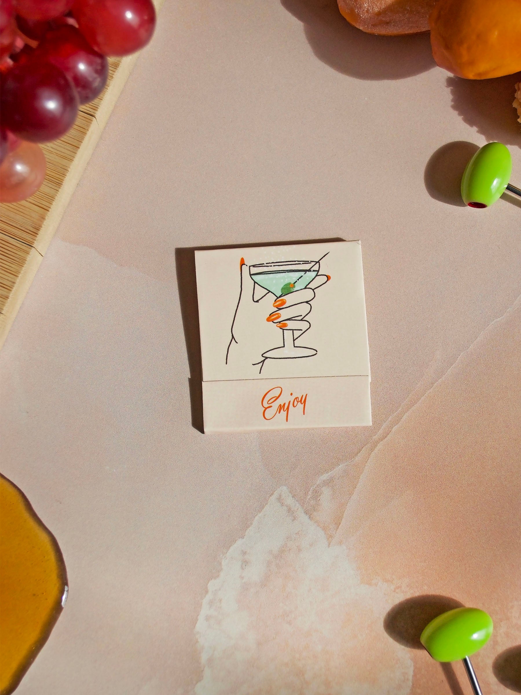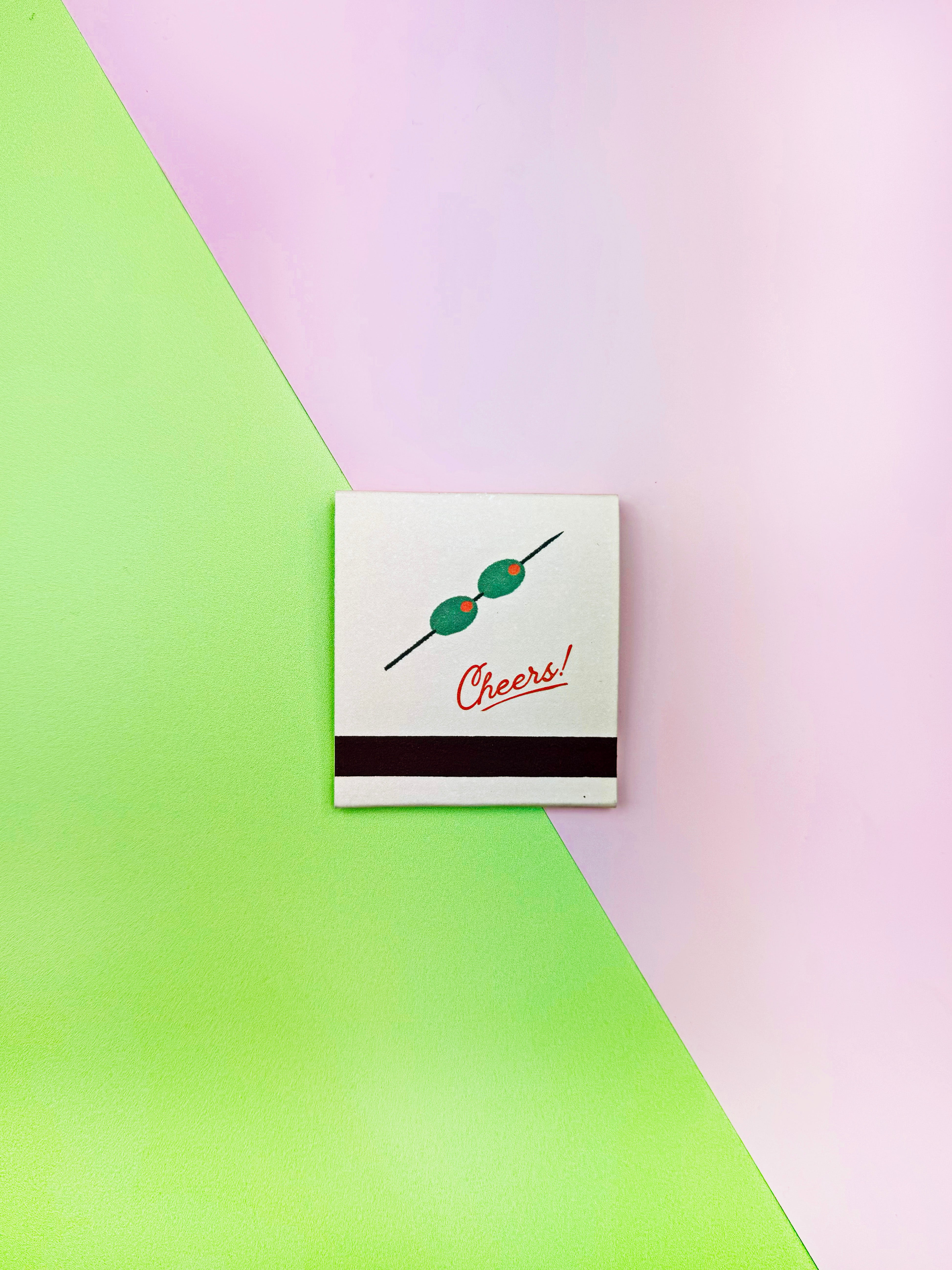 This matchbook features everyone's favorite cocktail- a (dirty) martini! The art is done by meeeee! The inside of the matchbook has the recipe for the cocktail and each match features a different ingredient of that cocktail cause we cute like that.