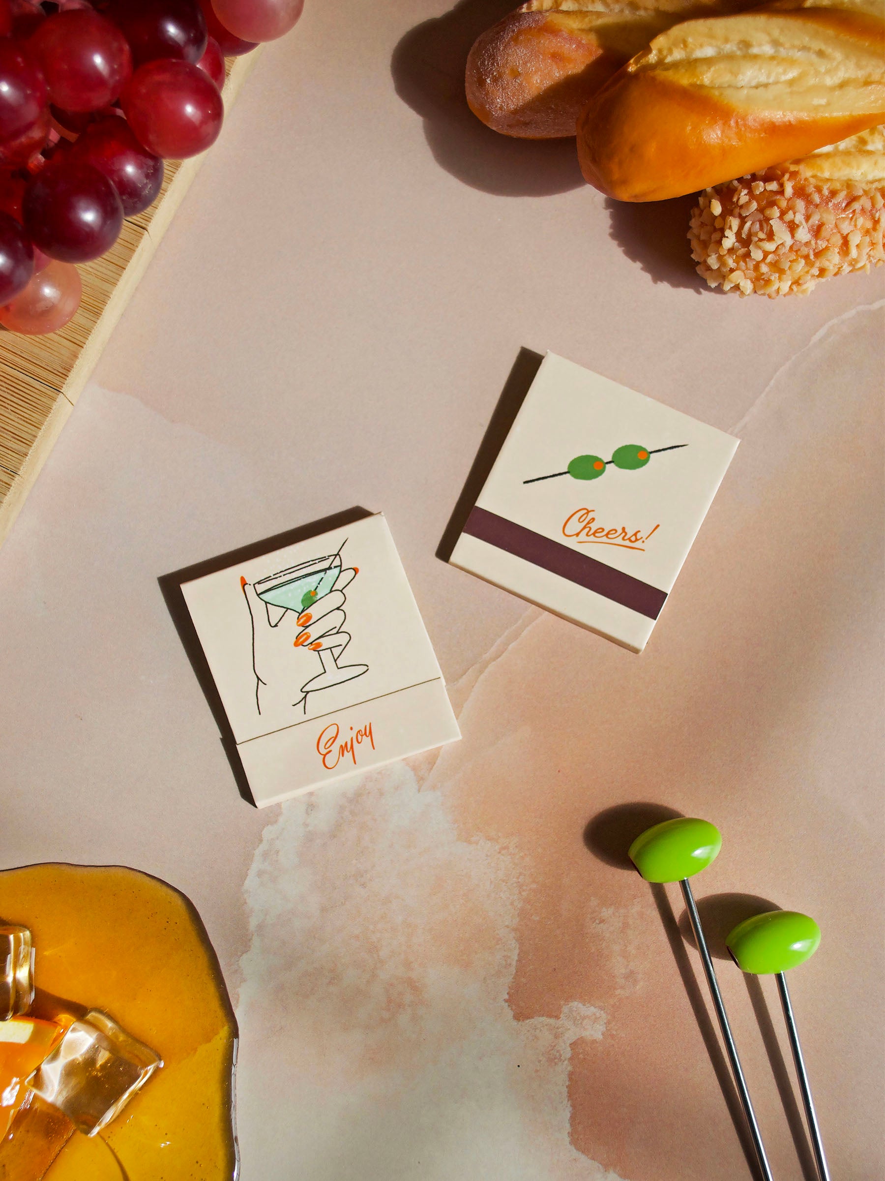 Each matchbook has 10 matches, each printed front and back with an ingredient to make the cocktail. Match heads are custom colored to coordinate with the matchbook.
