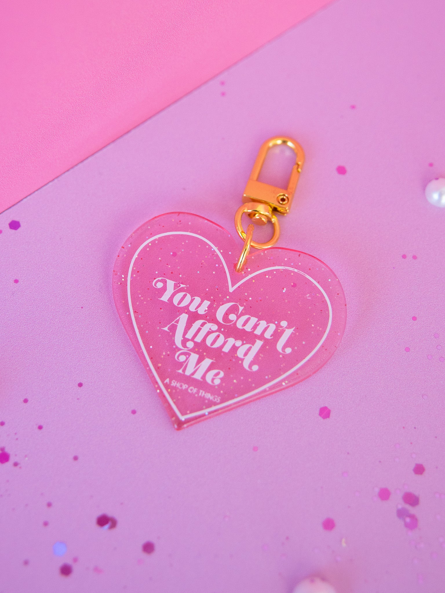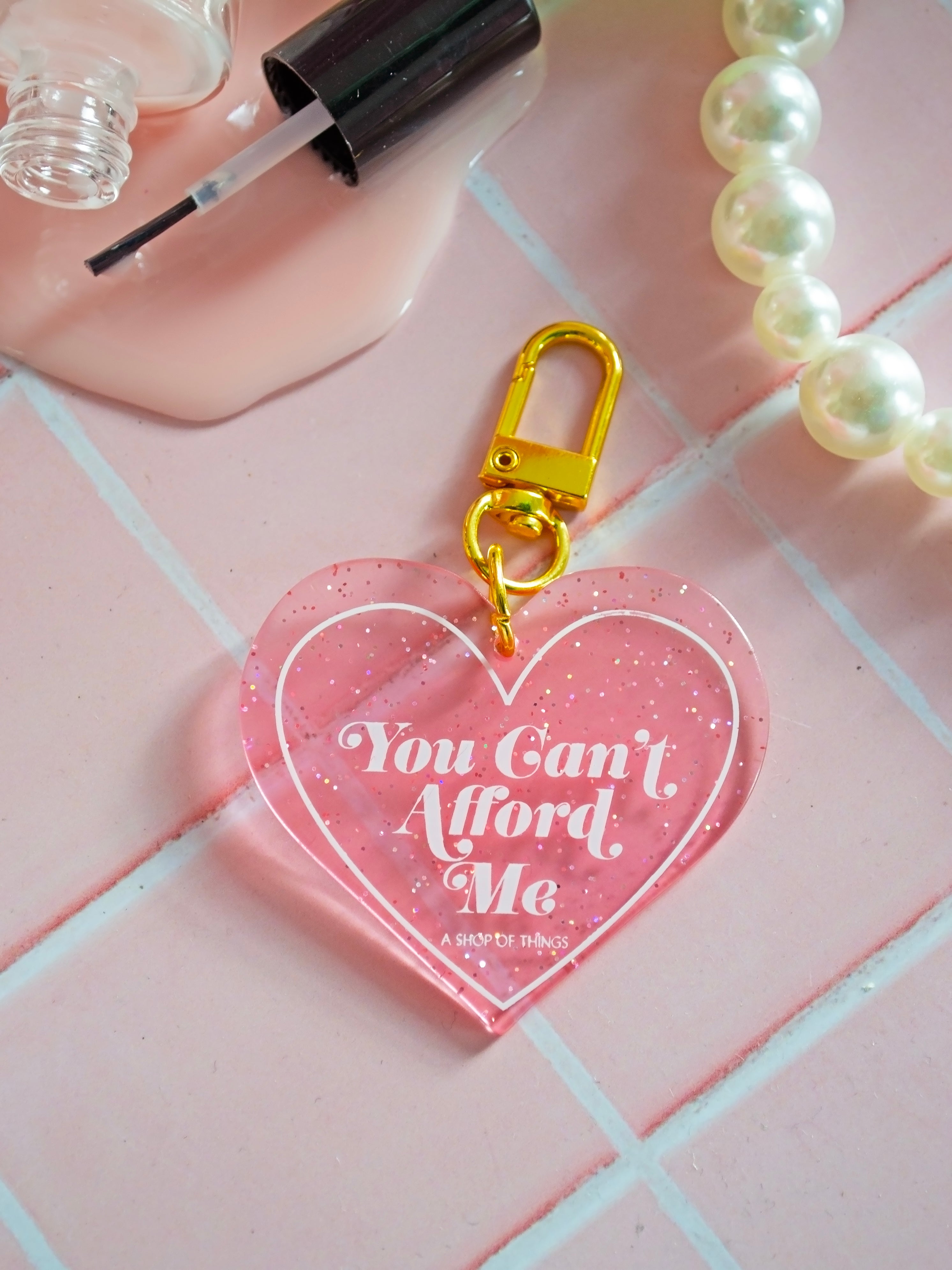 Pink heart-shaped keychain says "you can't afford me"