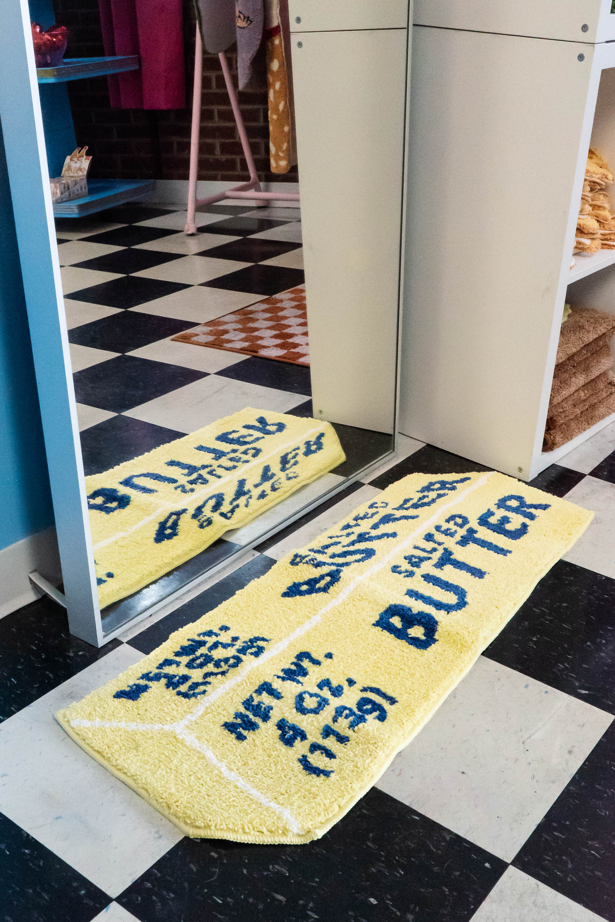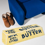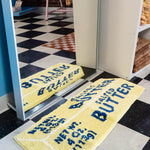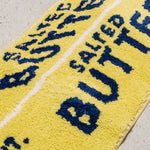 Measures 38" x 14". Design is a classic yellow stick of salted butter. Slip resistant backing, so no need to get rug tape! Made from 100% polyester, can be machine washed, but we recommend hand washing. Do not iron, air dry only.
