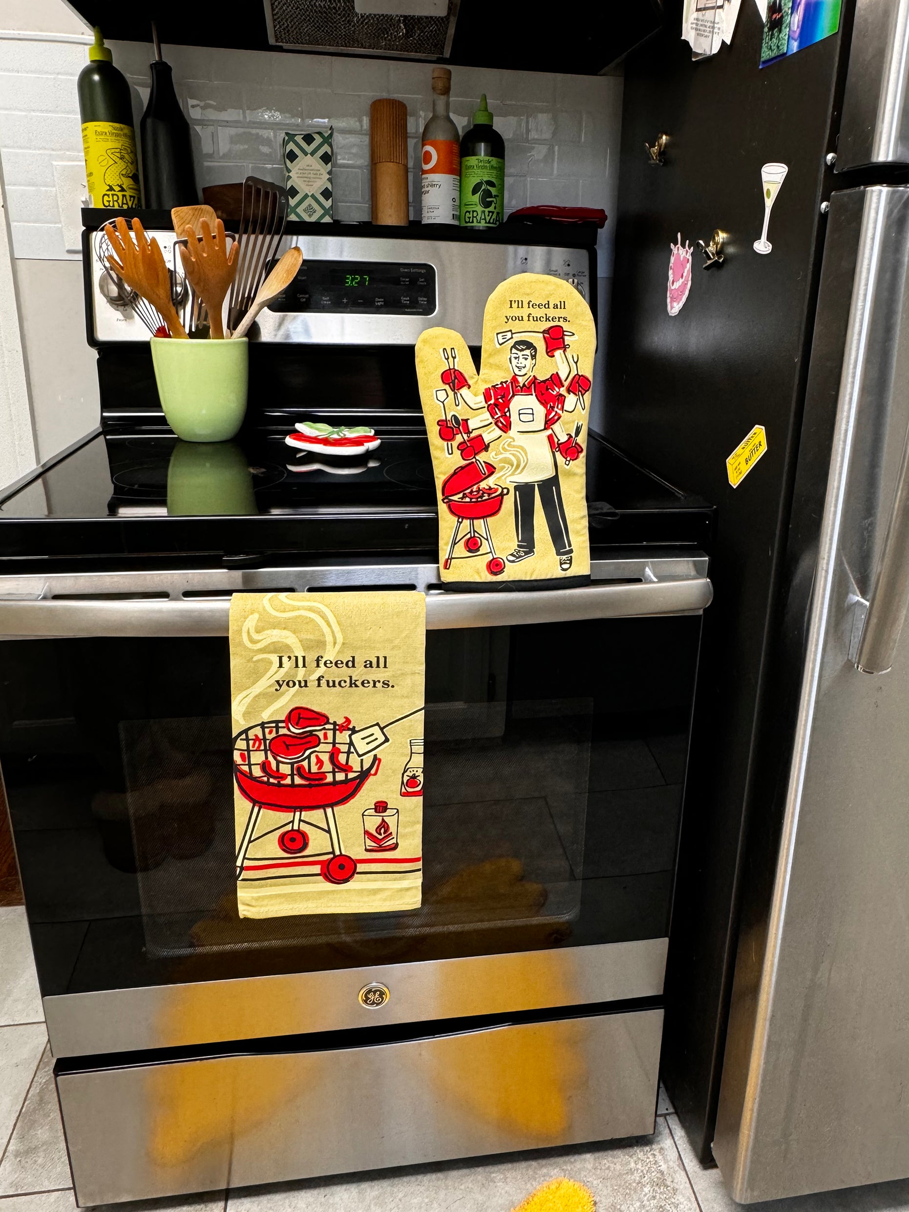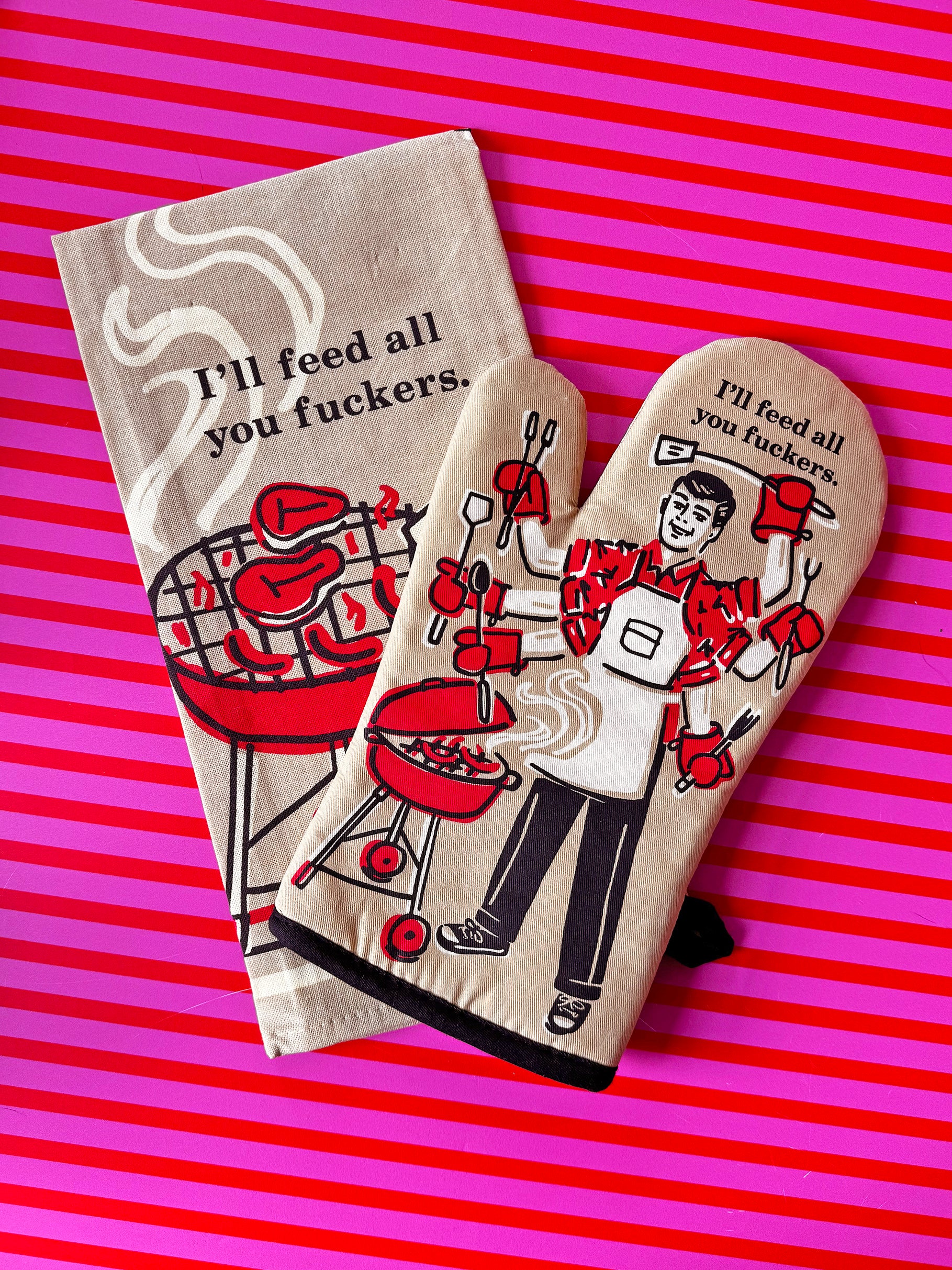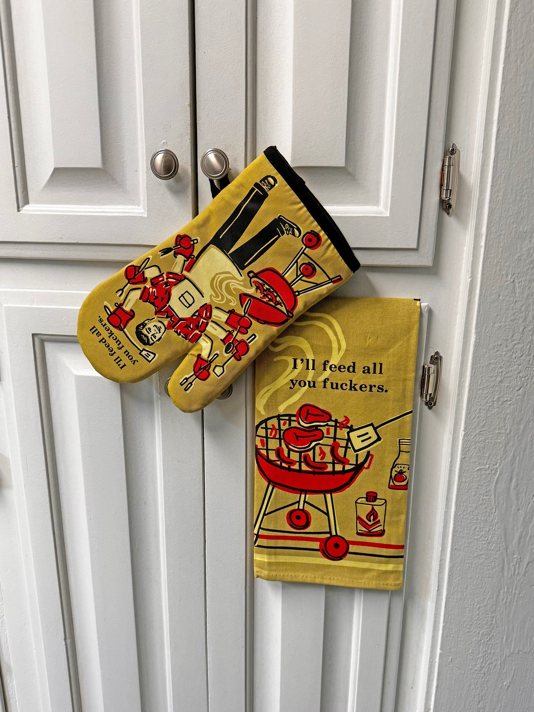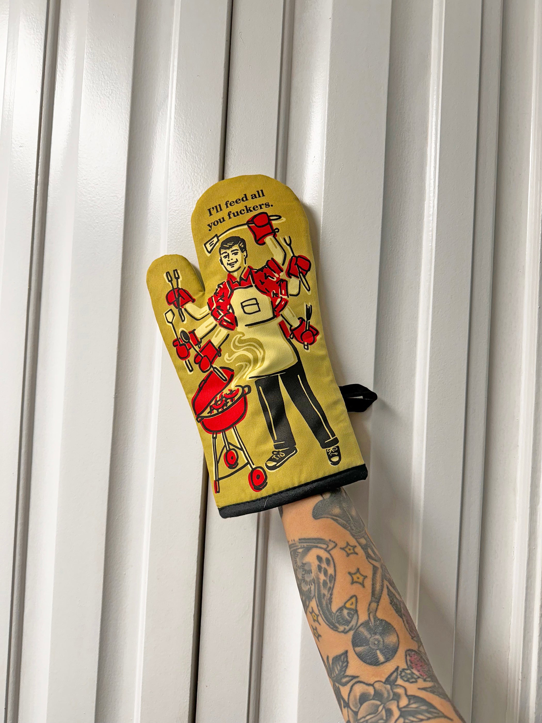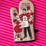 This high quality oven mitt is insulated and made with a 100% cotton material! One side of the oven mitt features a very busy chef and reads "I'll feed all you fuckers.". The other side features the same chef, but backwards, using all 6 of their arms to feed said f*ckers! ;) The bottom edge of the mitt is black and has a matching loop for convenient hanging when not in use! Great gift for the chef in your life!!