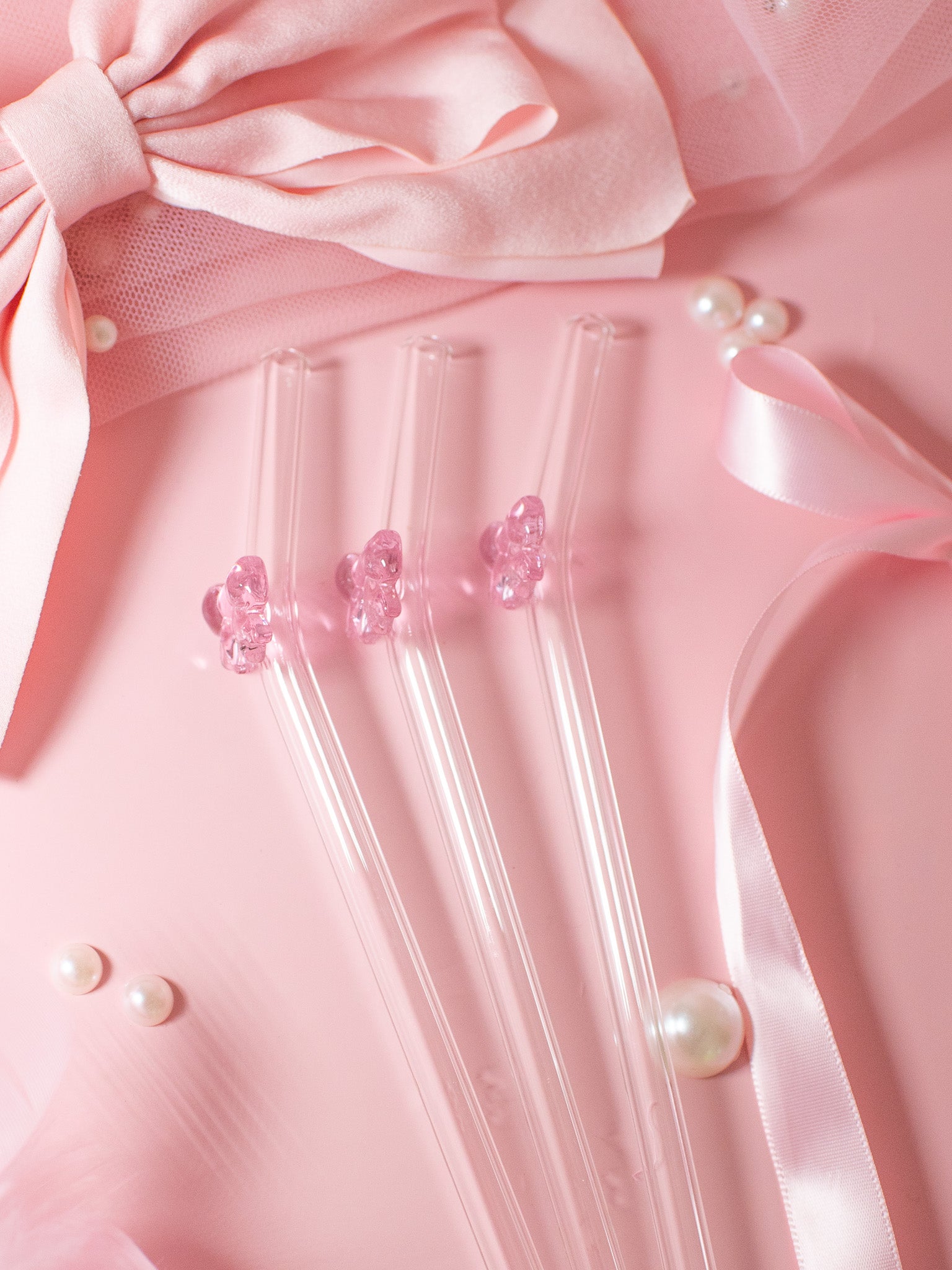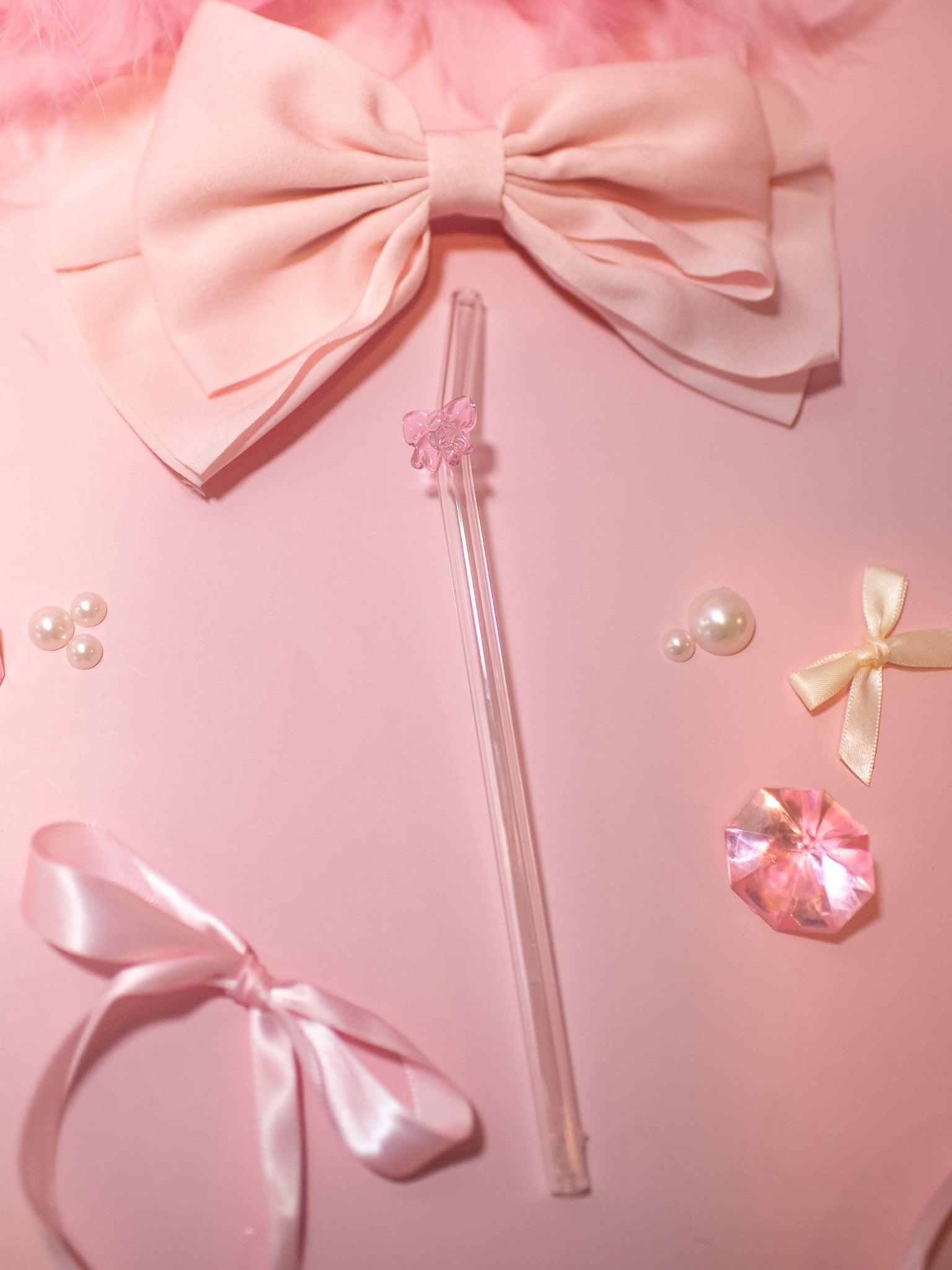 Made of glass, so no chance of that weird metallic taste you get with some metal straws. Features one little pink bow at the top of the straw. So cute!Â