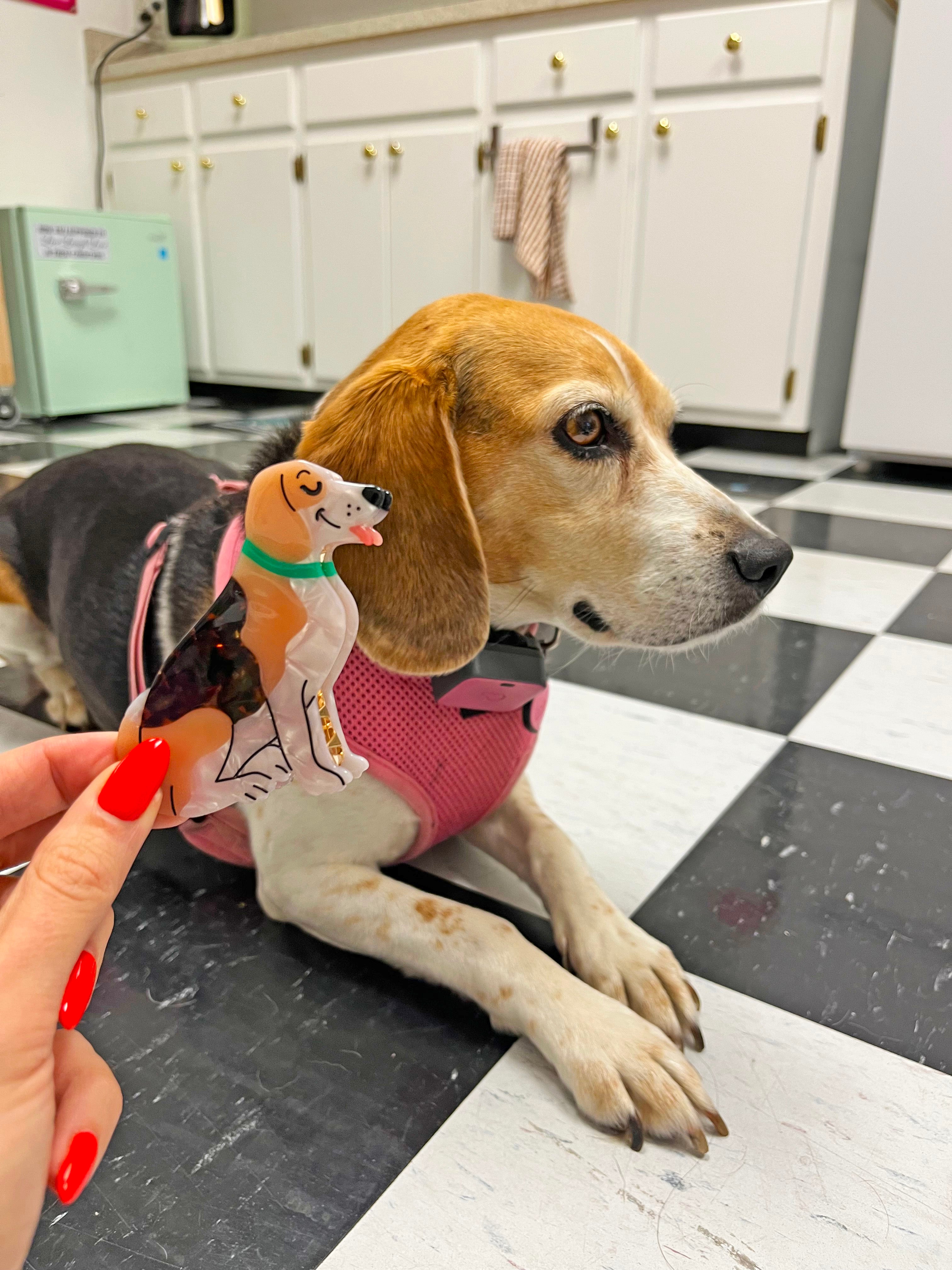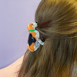 This multicolored claw-style clip measures 3" long and is perfect for a partial updo or holding up a few locks of hair for effortless style! Bark bark!