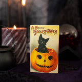 The match box features different art on the front and back! One side features a black cat sneaking on a fence. The other side features a black cat adorably sitting in a pumpkin! Both sides read "A Merry Hallowe'en." On the side of the matchbox is a striker and inside are special black/orange and solid black large match sticks.