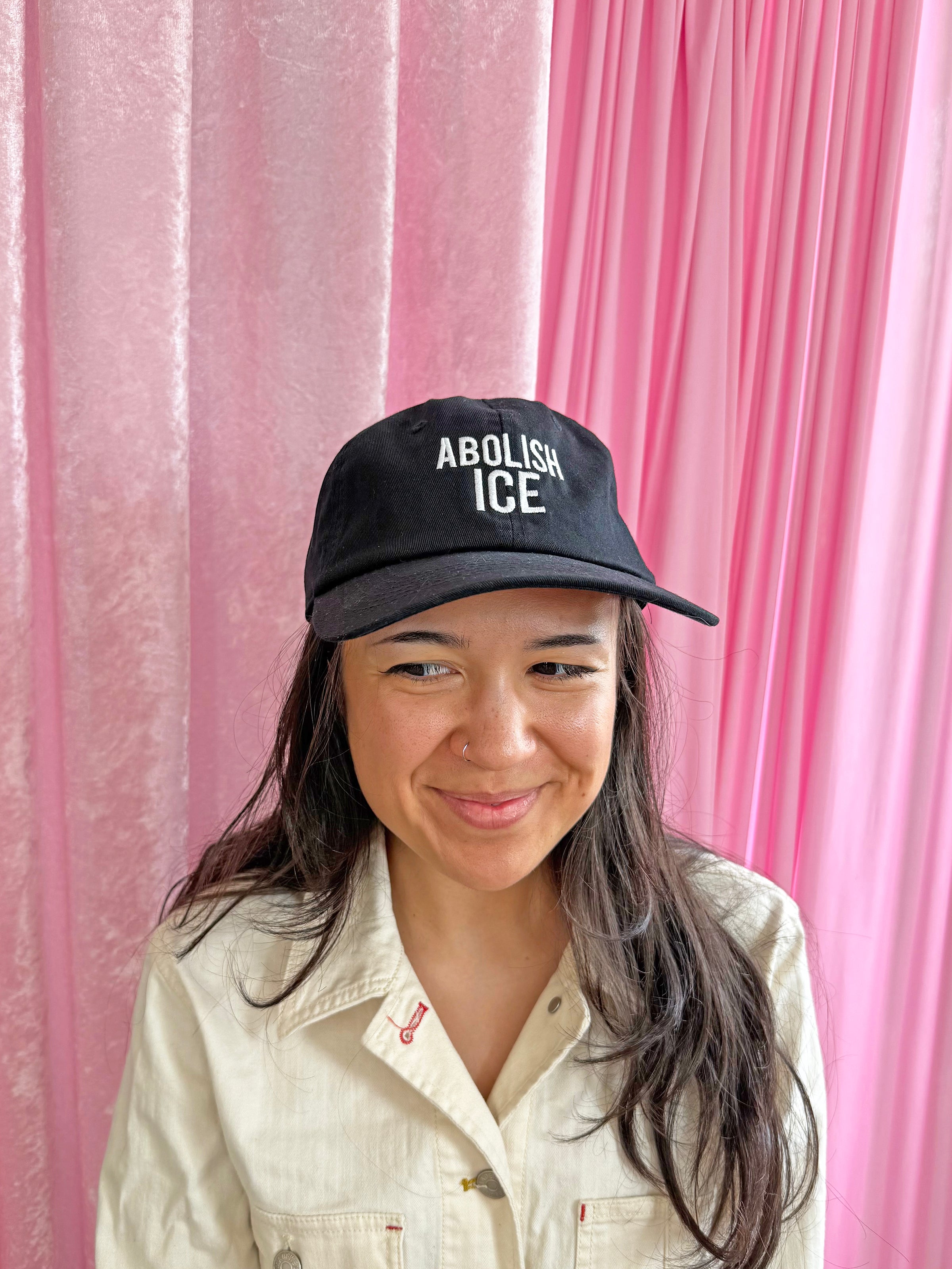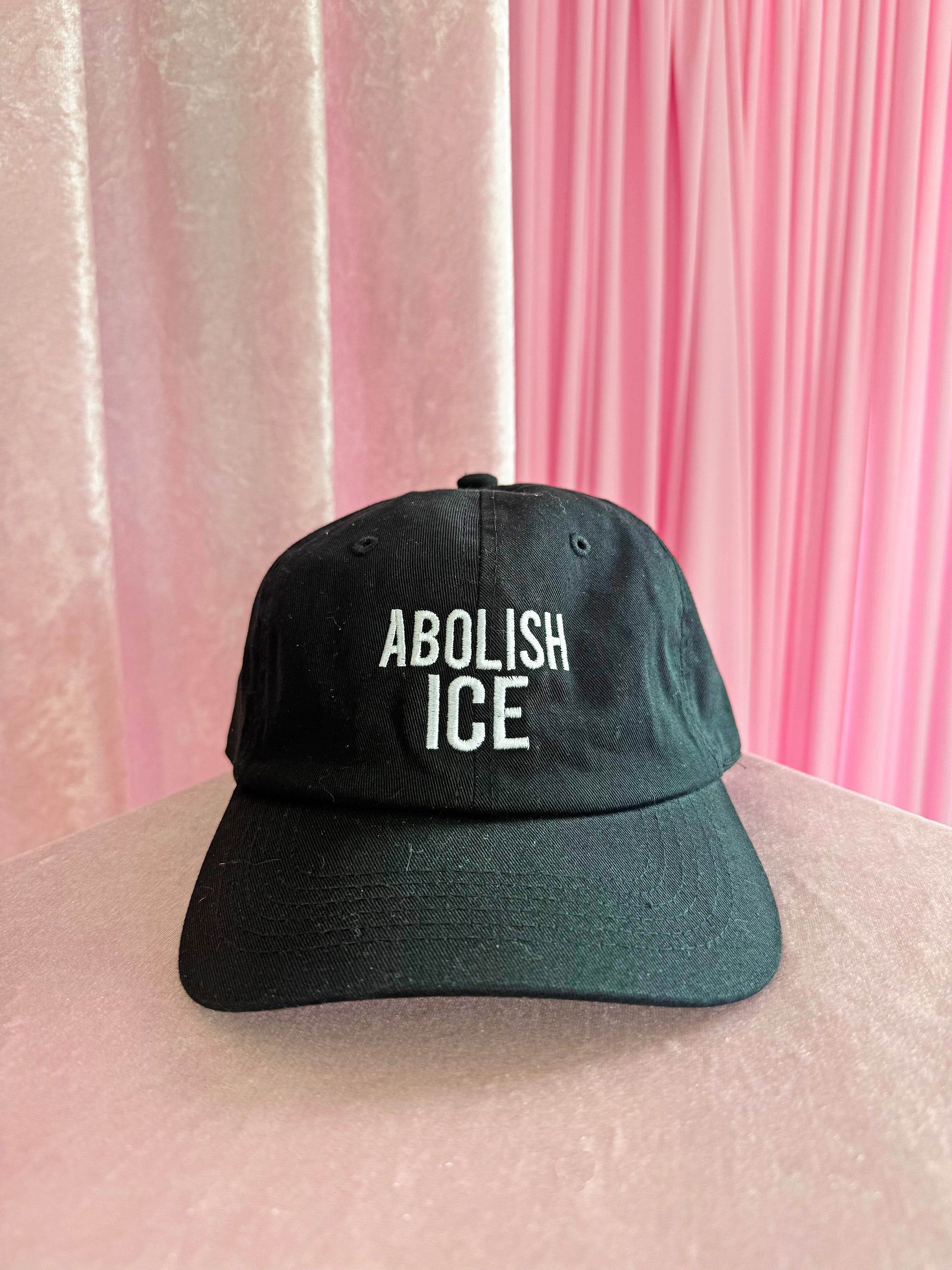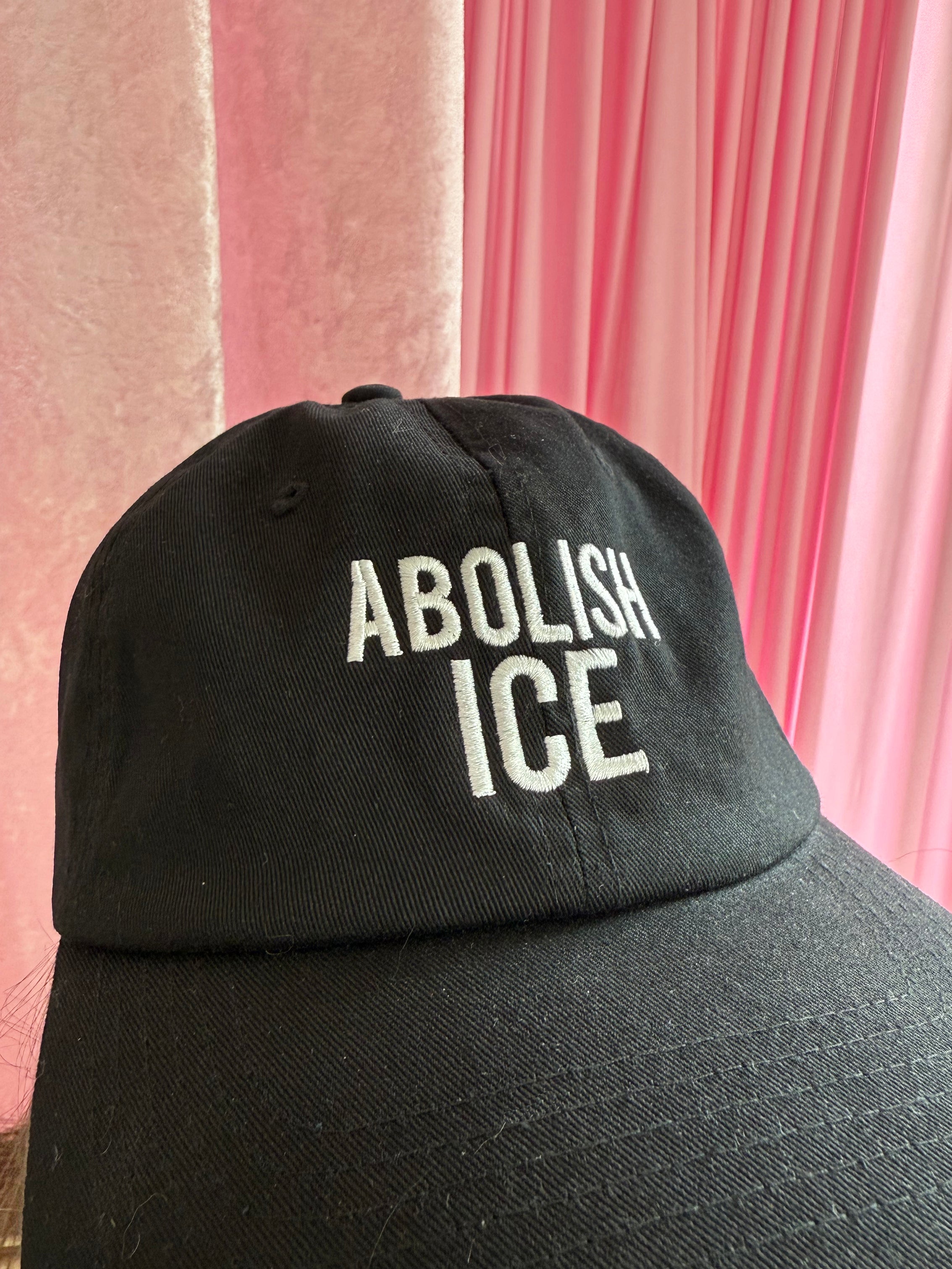 Some things just don't need explaining. This black dad hat reads "abolish ice" in white embroidery across the front. Looks perf with any outfit and is adjustable - we love!!