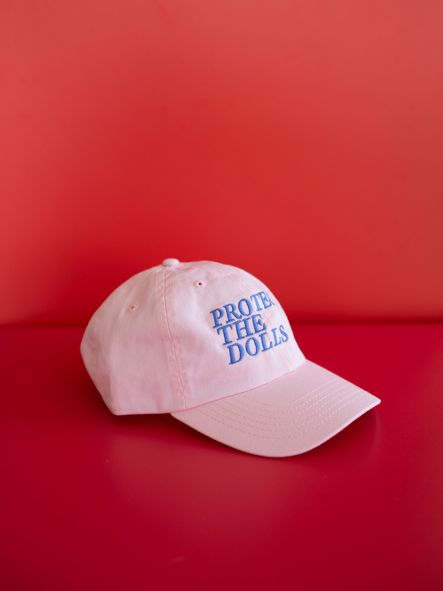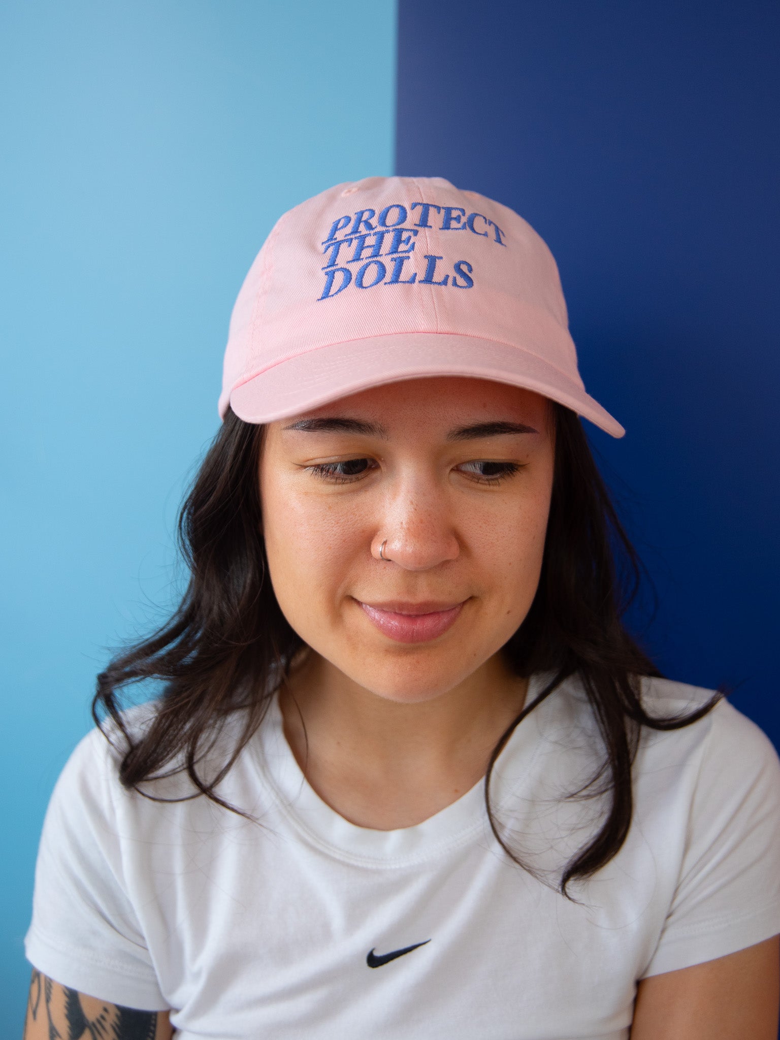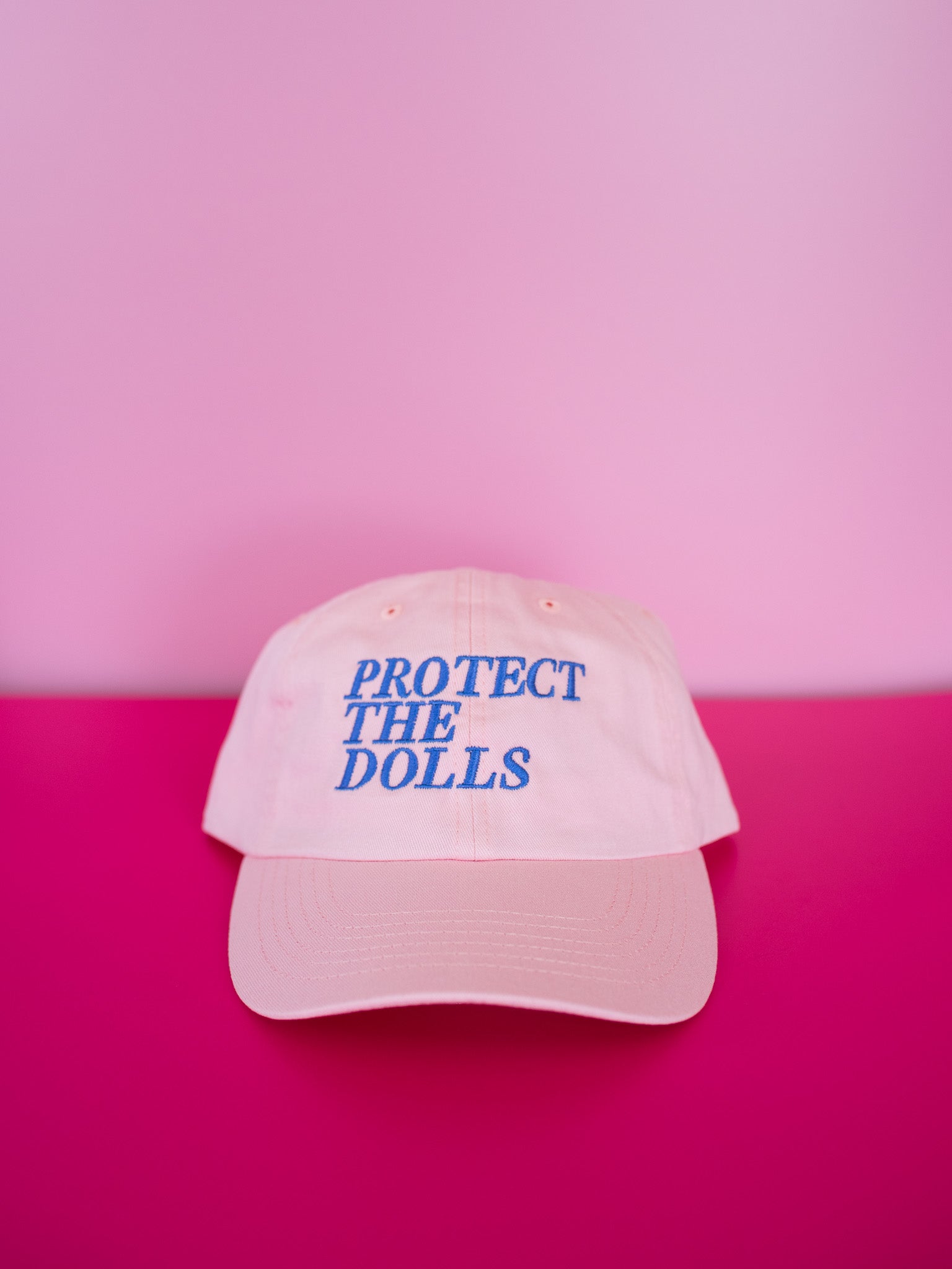 This light pink dad hat reads "protect the dolls" in blue embroidery across the front. Looks perf with any outfit and is adjustable - we love!!