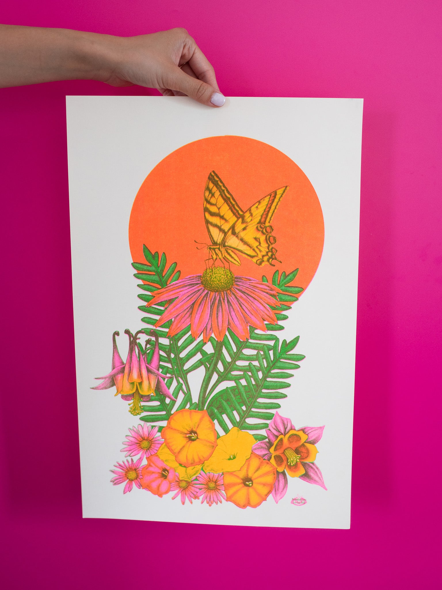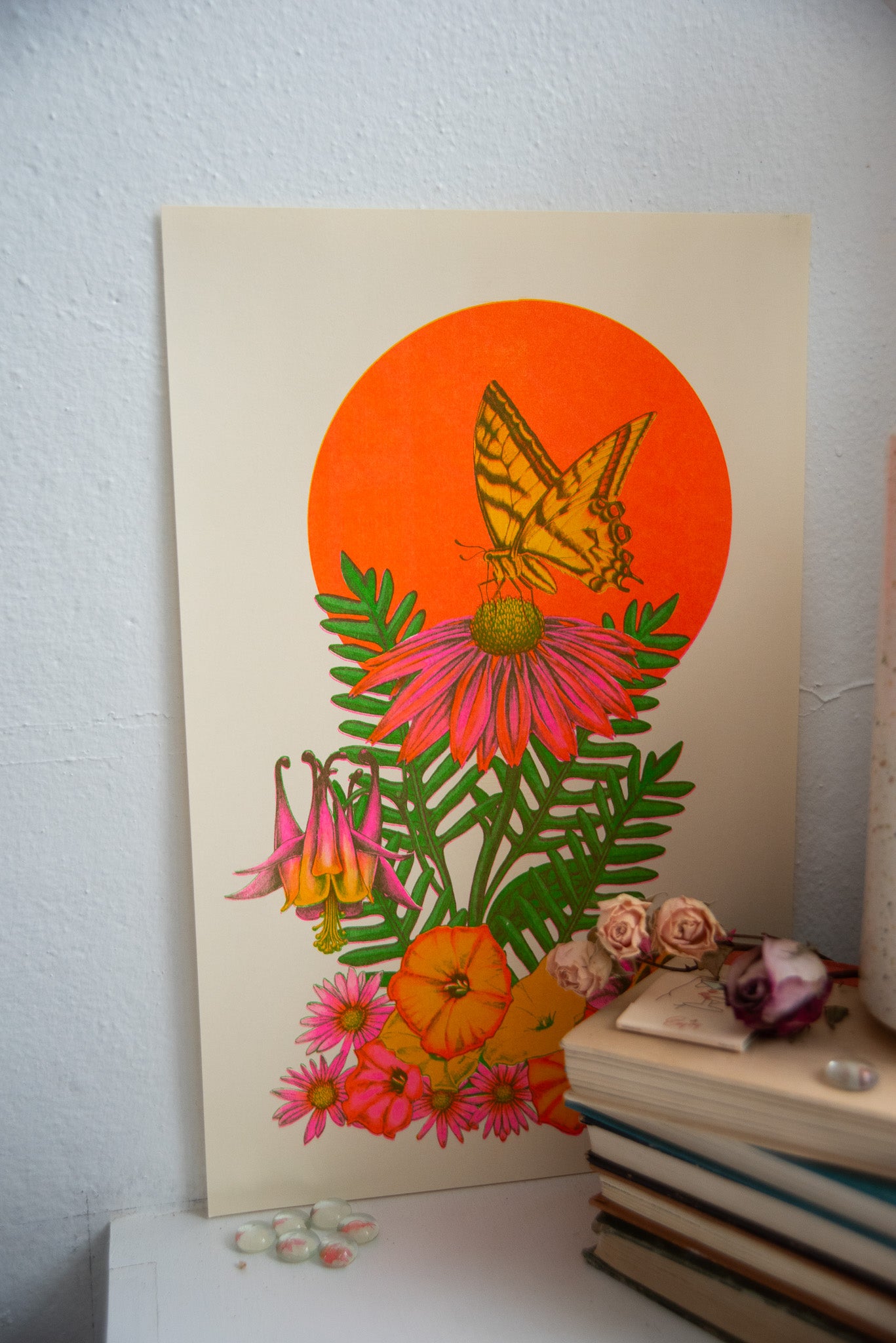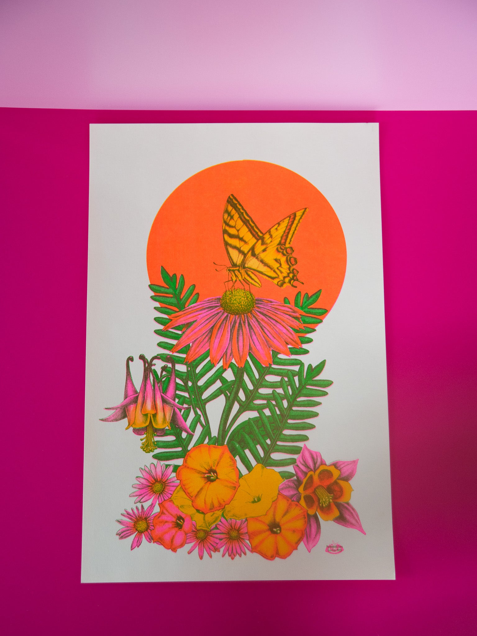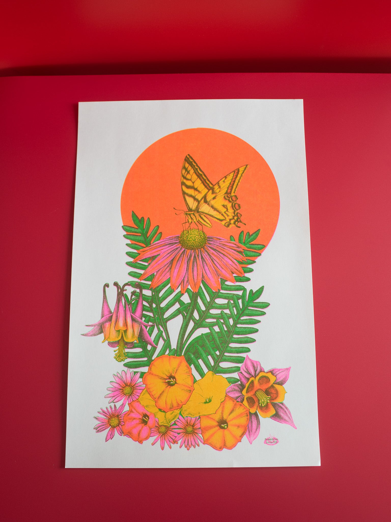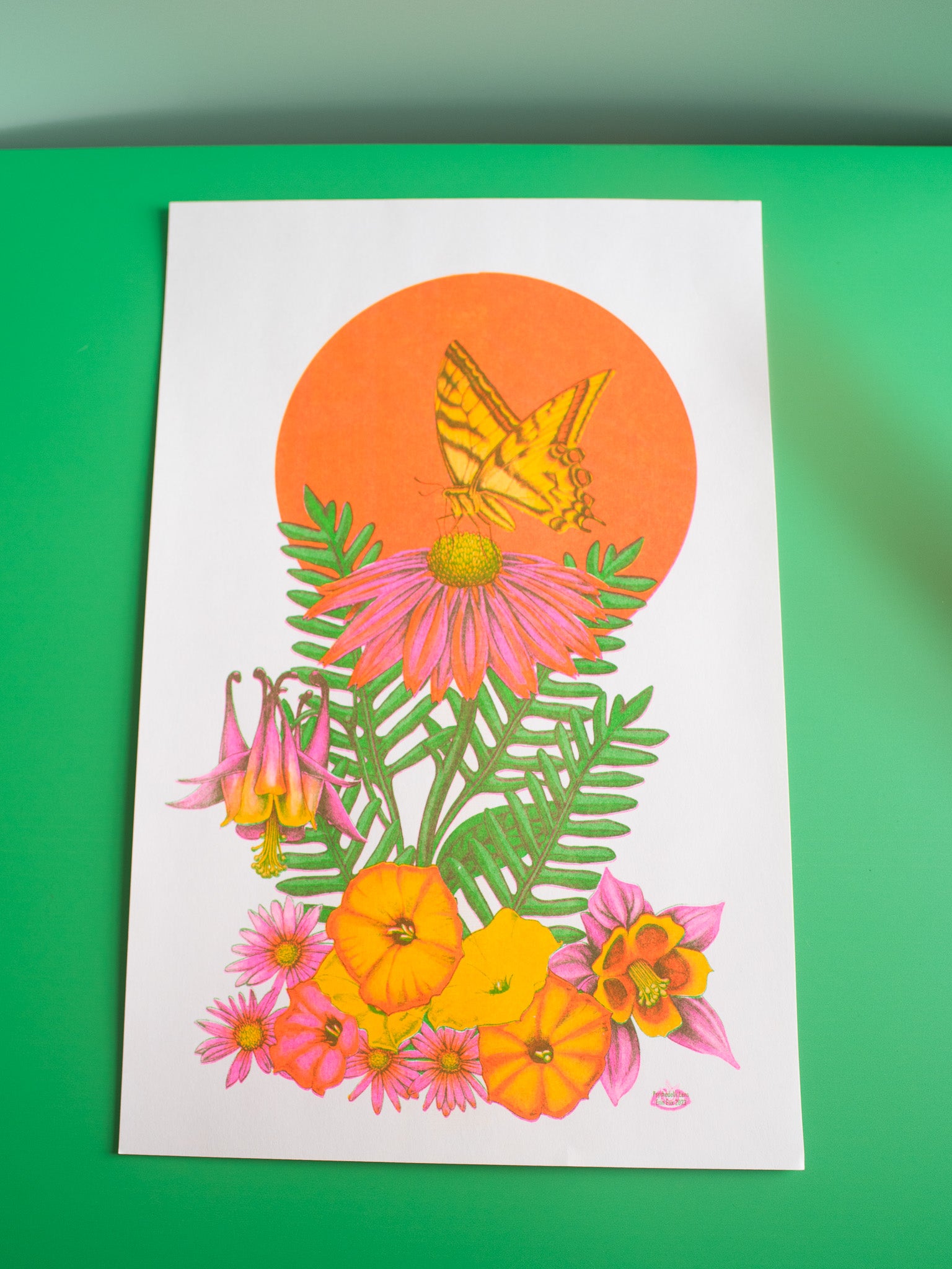 Due to the complexity of risograph printing, slight imperfections or variations may be present - each print is unique! It is recommend to keep your print out of direct sunlight to preserve its vibrancy. Ships flat in 100% biodegradable packaging.