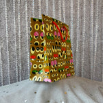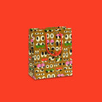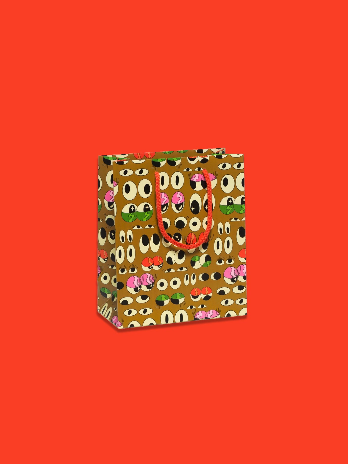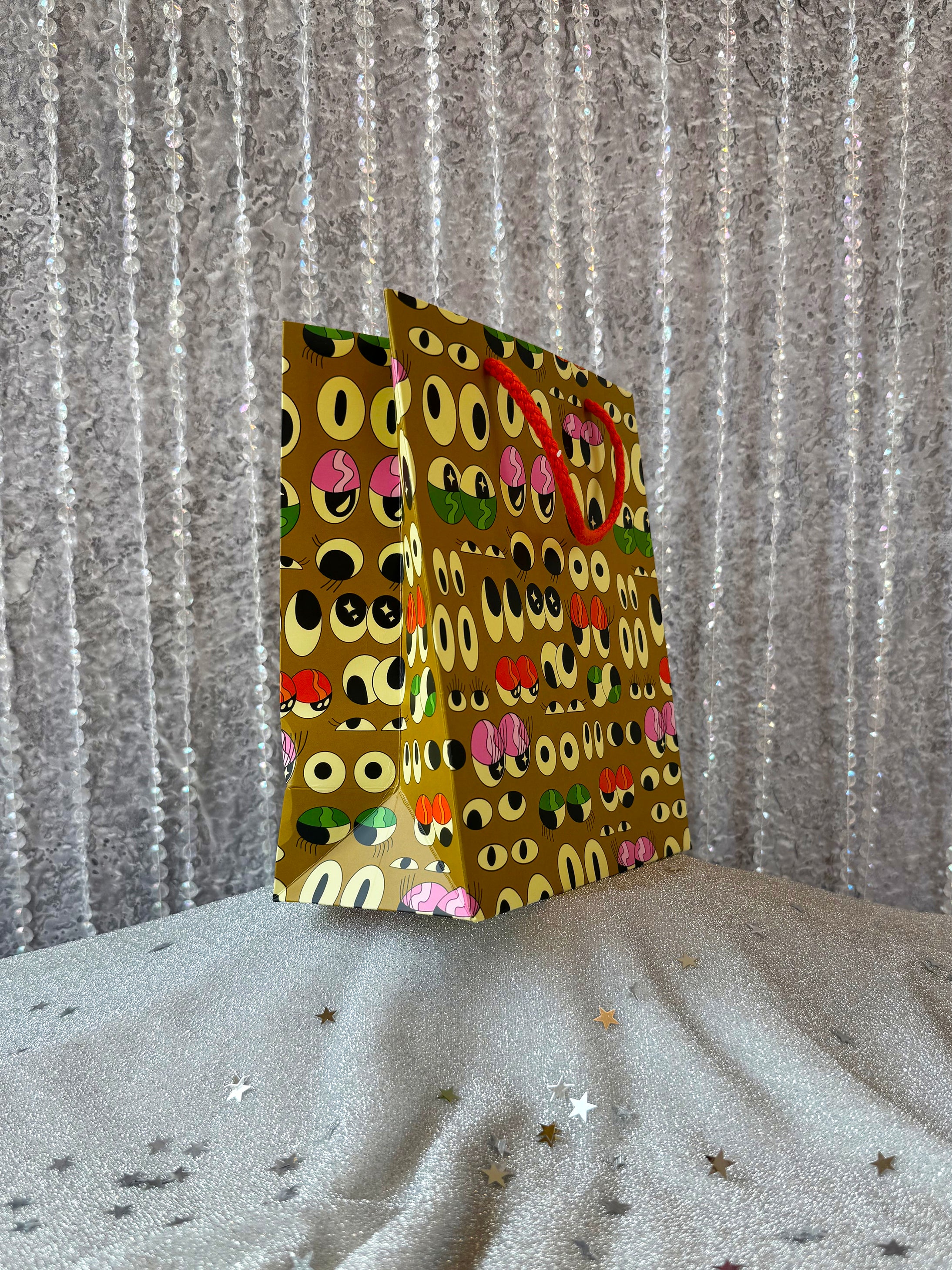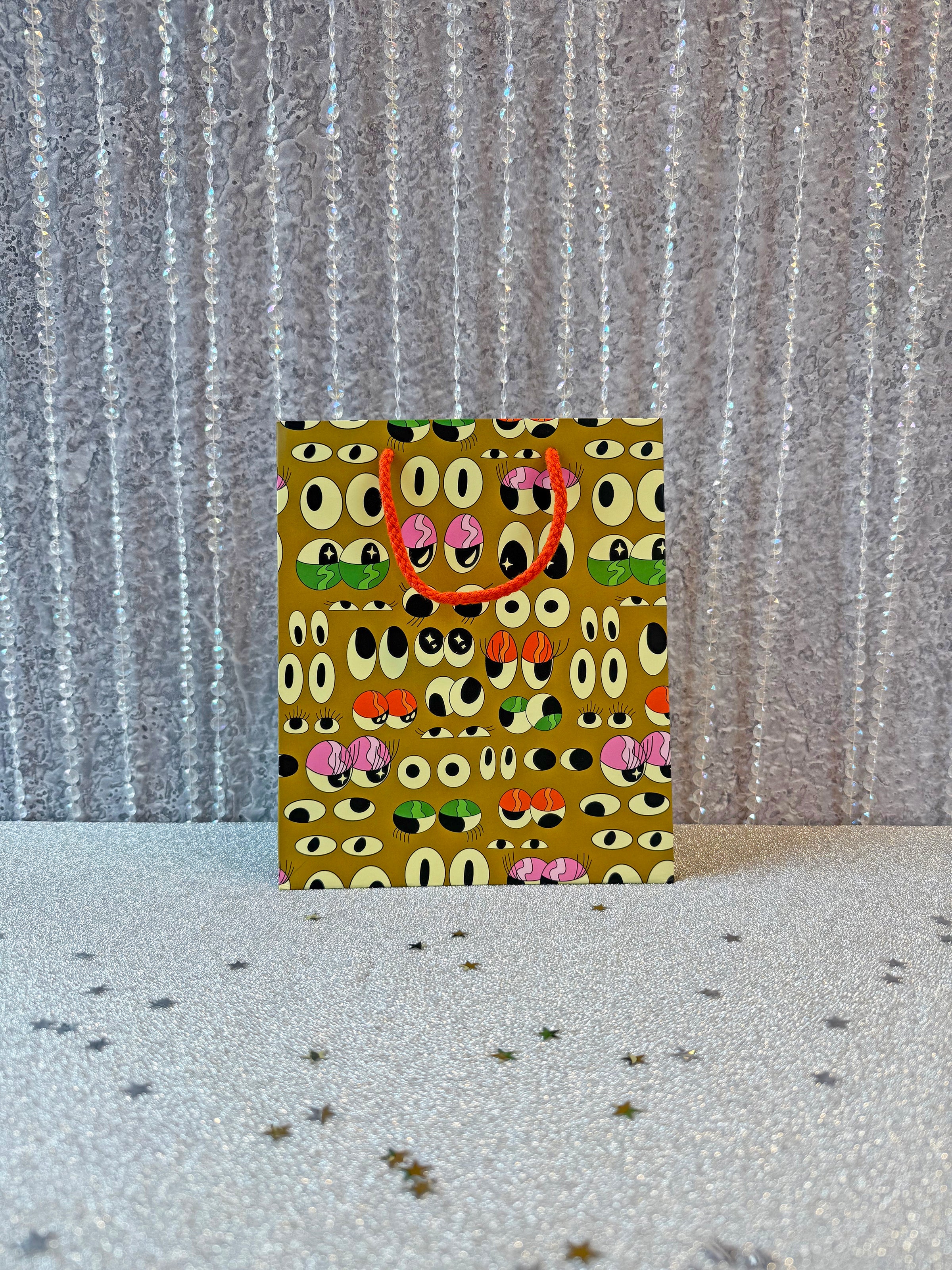 The perfect gift bag for your next party! Features a variety of cute and expressive eyeballs on an olive colored background. Complete with matching orange cotton rope handles for convenient carrying!