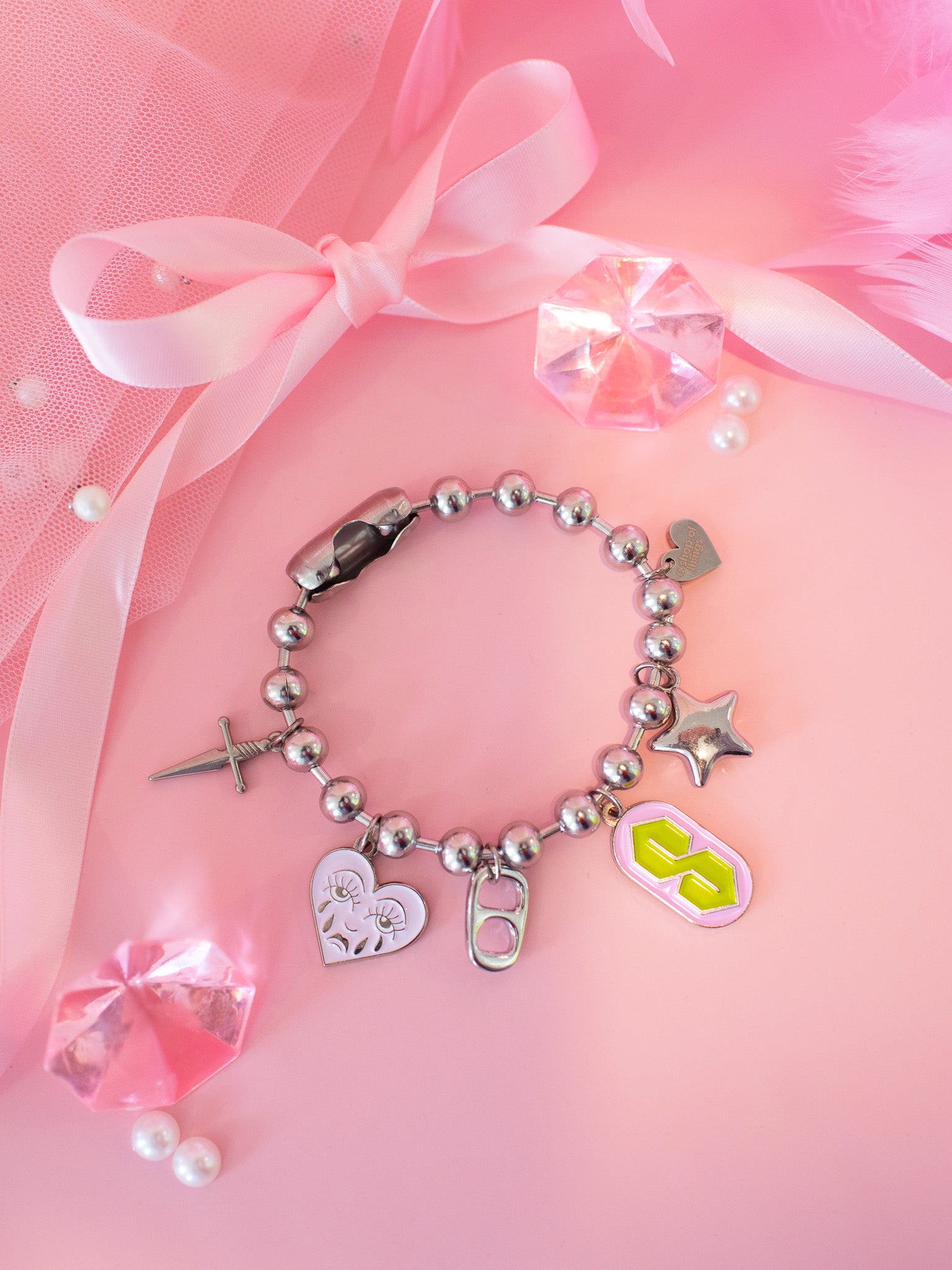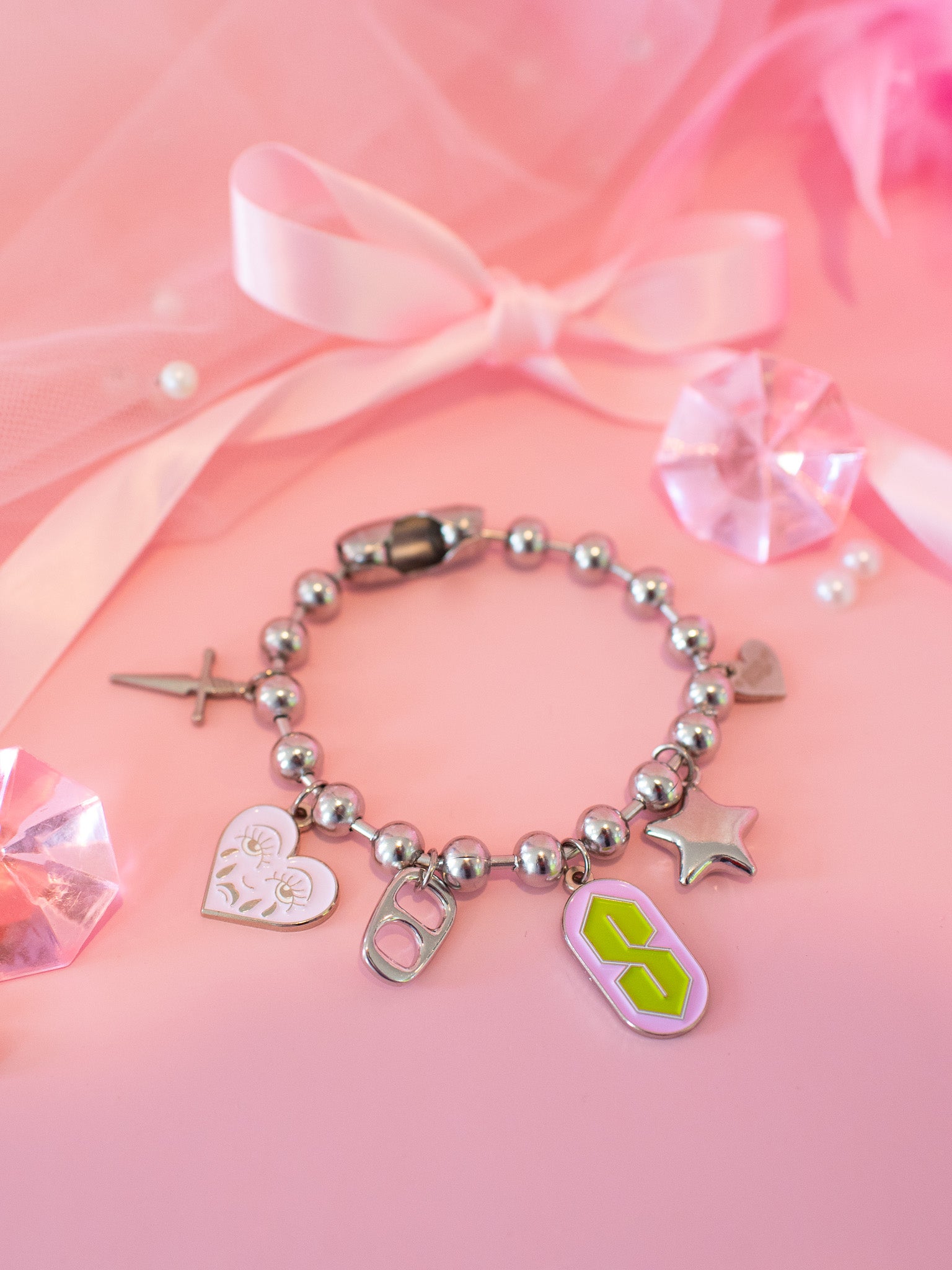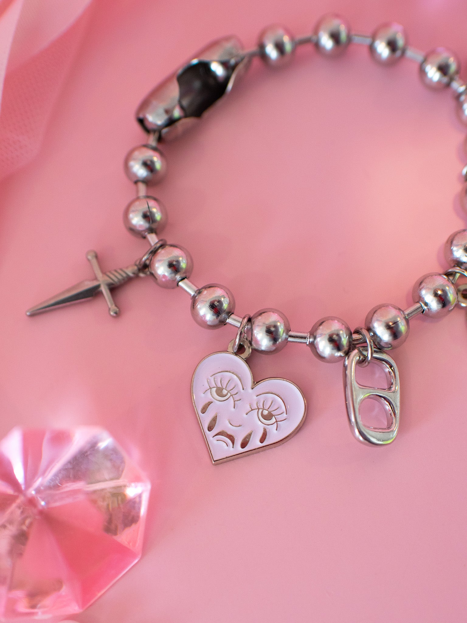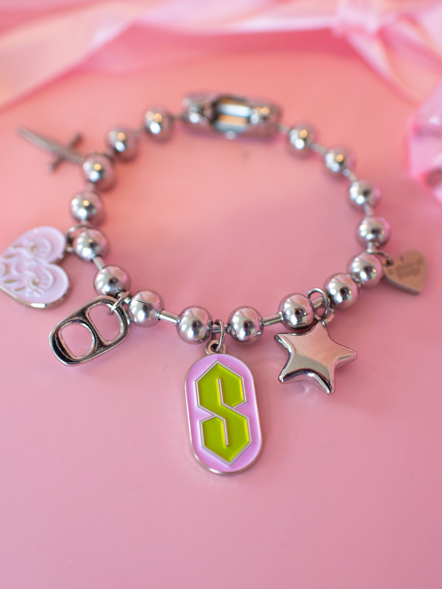 This charm bracelet is made from a silver toned oversized ball chain and has a dagger, crying heart, soda tab, "S", star, and heart charm attached.