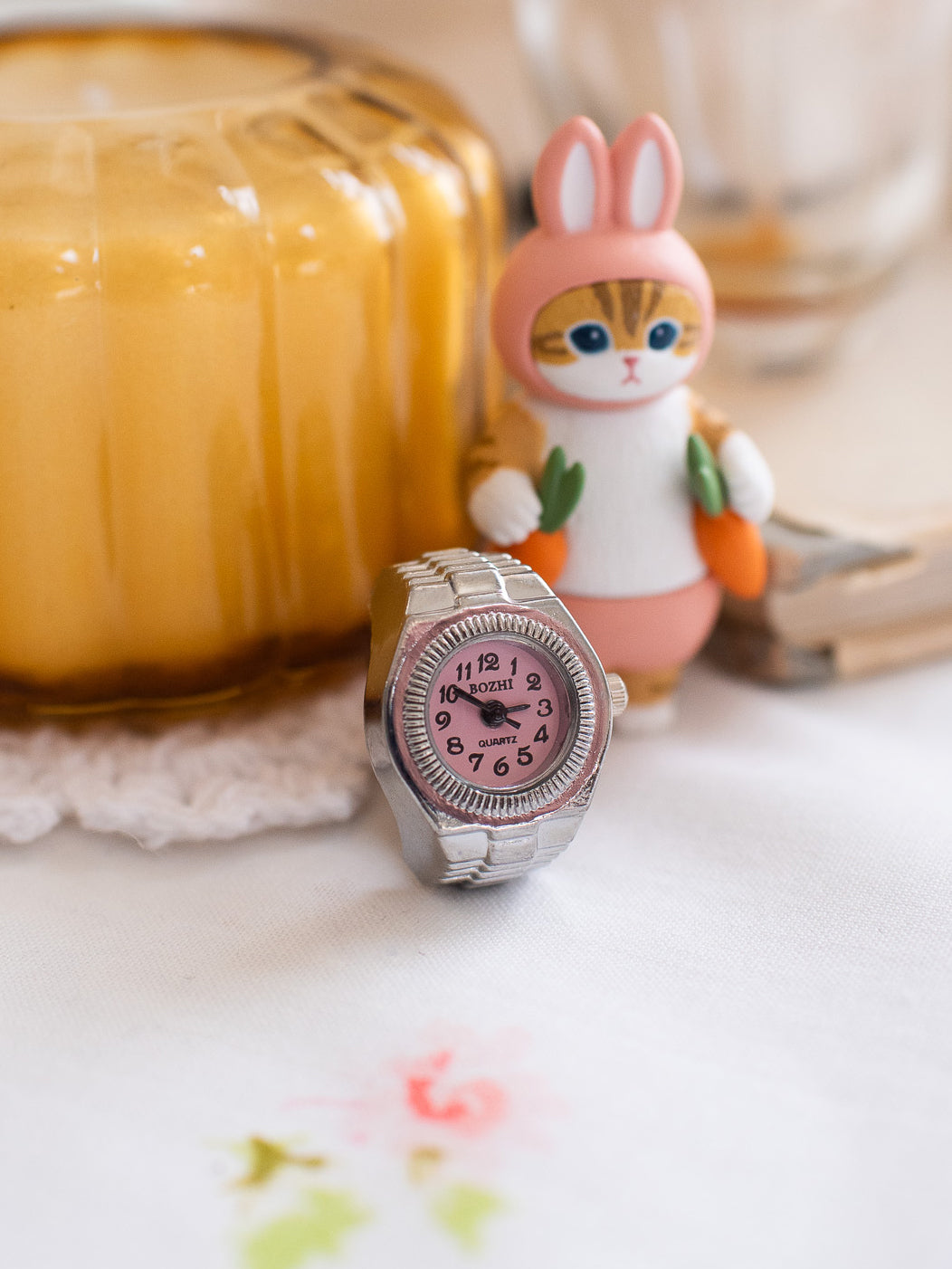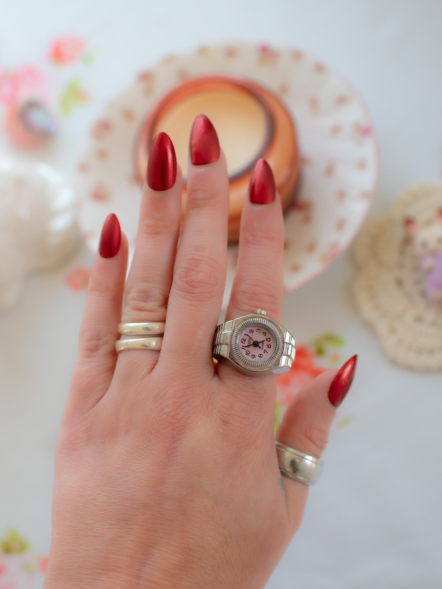 This cool watch ring is a best seller in our IRL shop in Nashville, TN! Yes, the watch face actually works! ⏱️ comes in silver with a pink face.