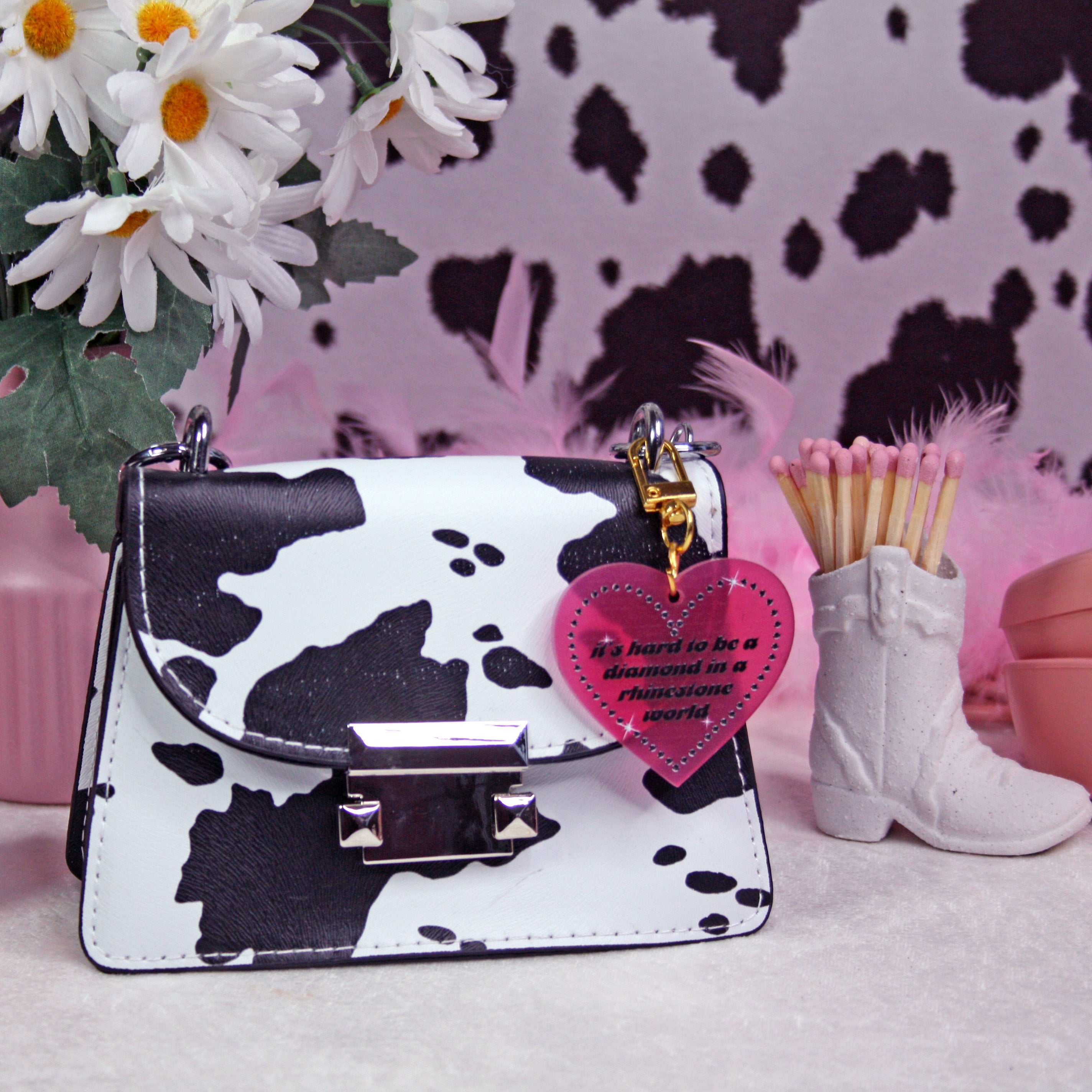 Heart-shaped keychain measures 2" x 2.25" and is made of pink acrylic.