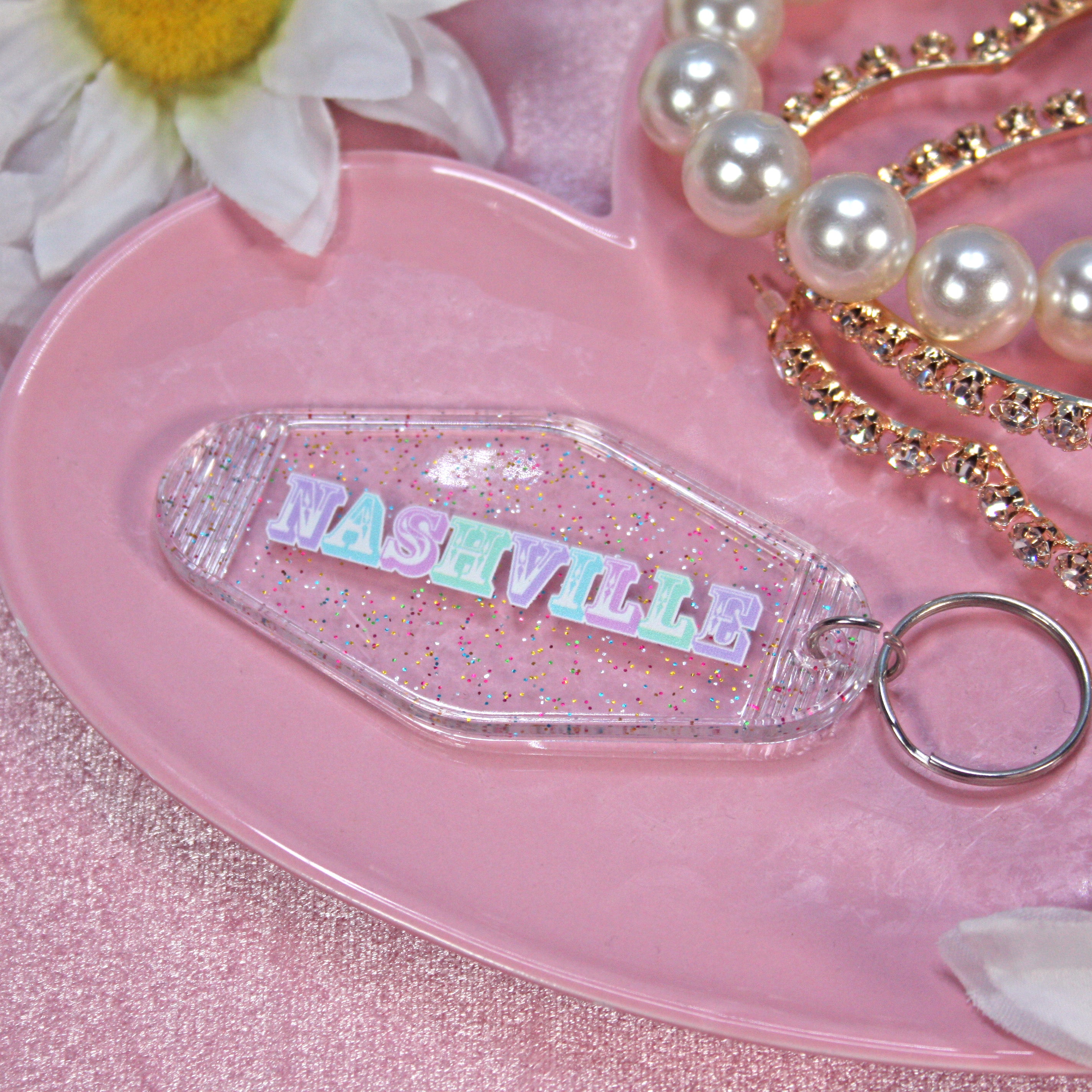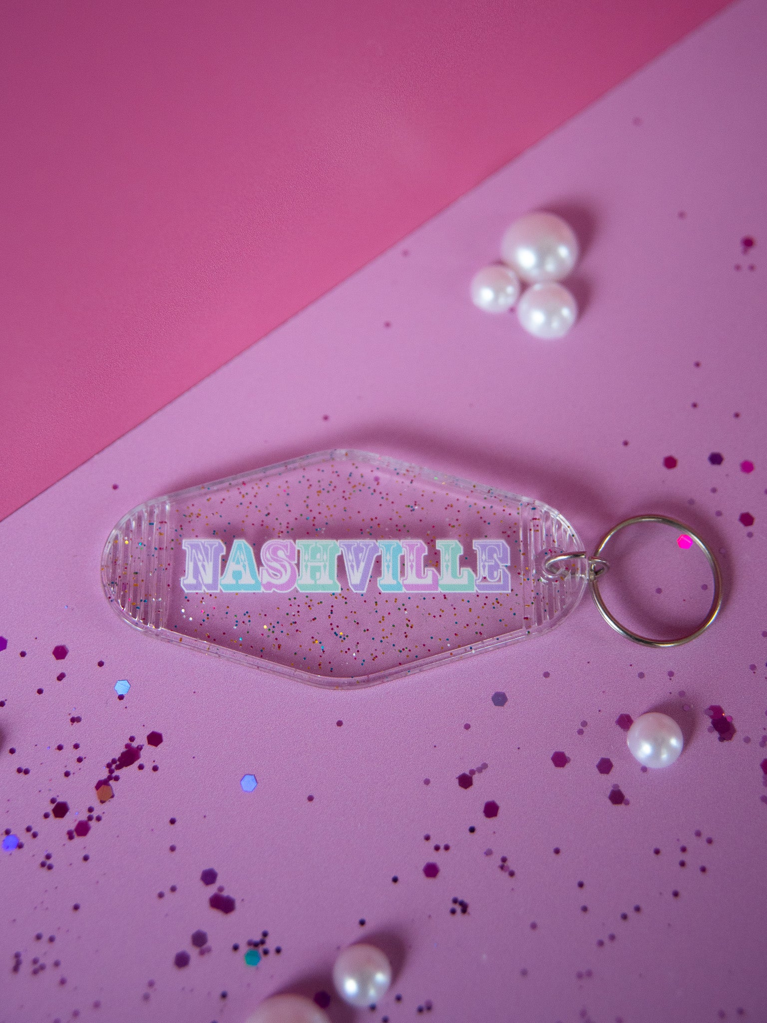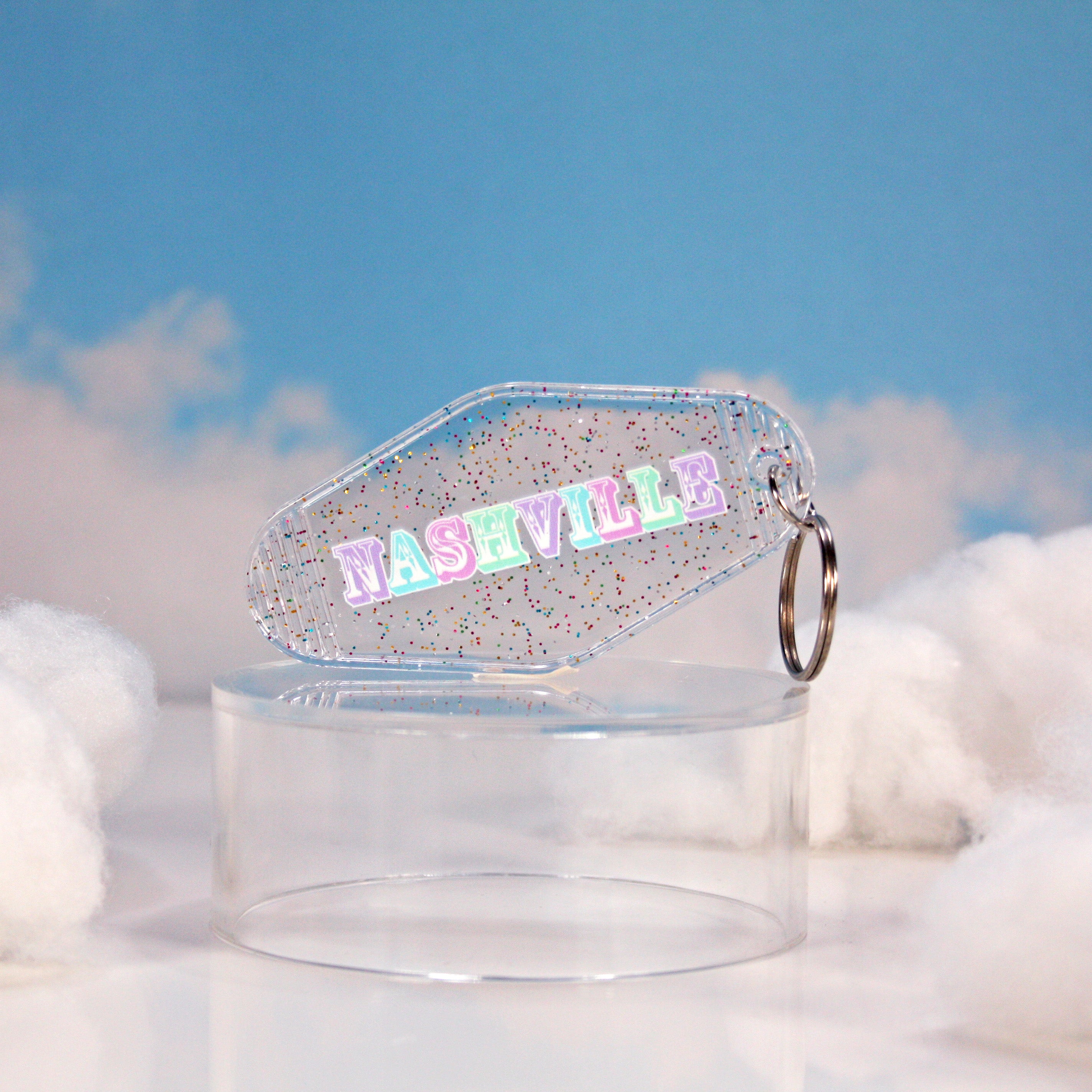 This keychain says NASHVILLE in rainbow pastel letters on a glittery clear motel keychain.